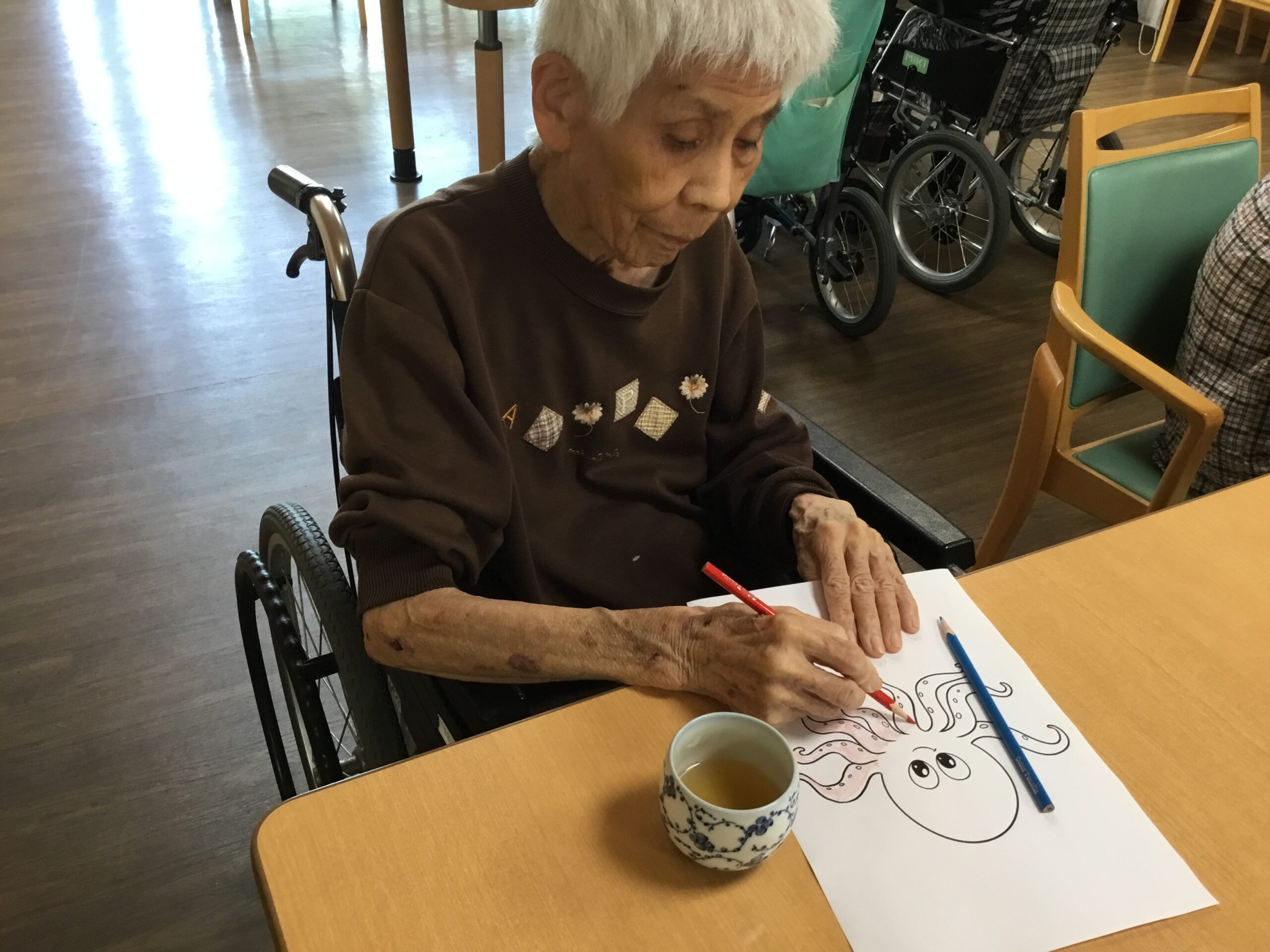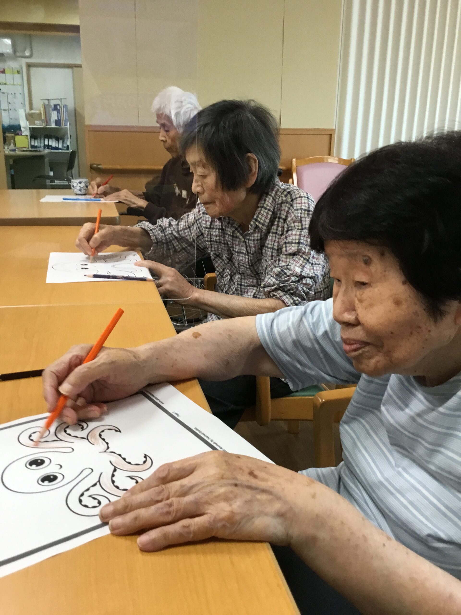 おやつレクをする予定なのでみんなでタコ🐙の塗り絵をしました。とても可愛らしいタコ🐙の絵がたくさん完成しました♡