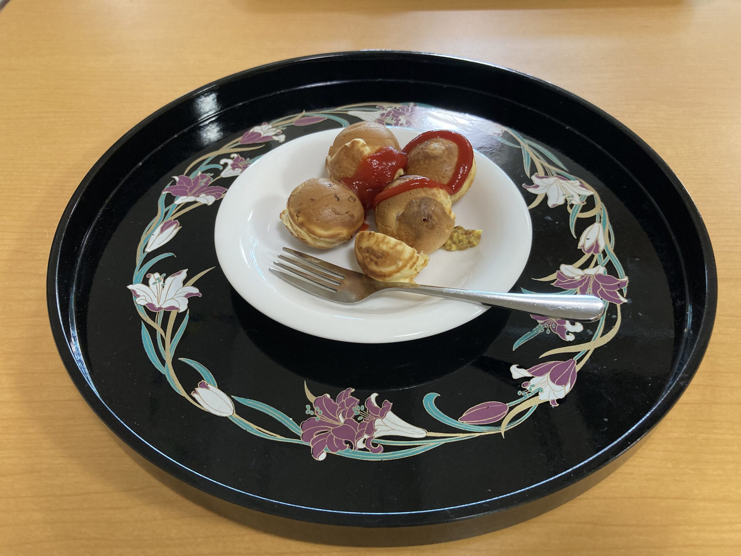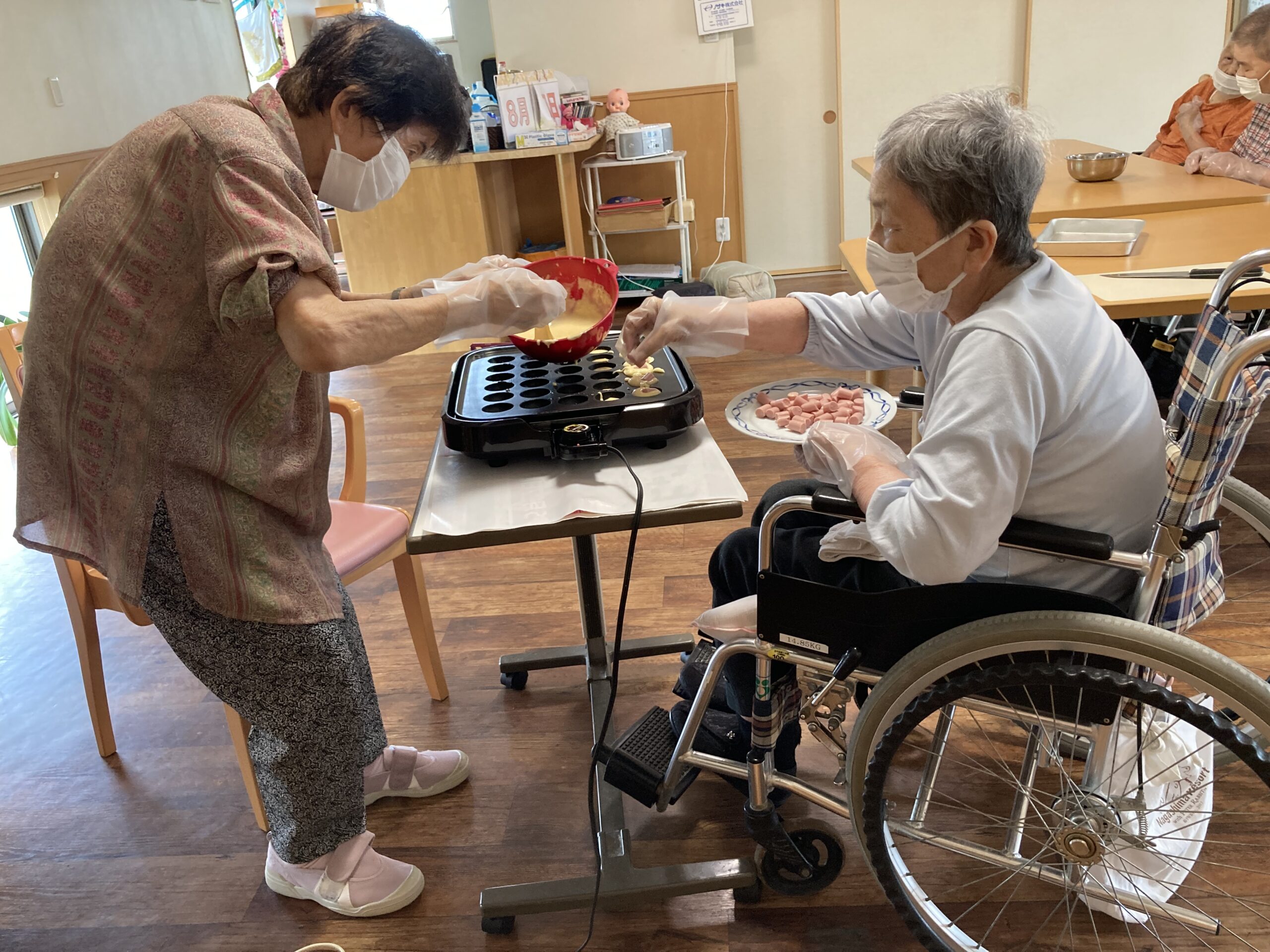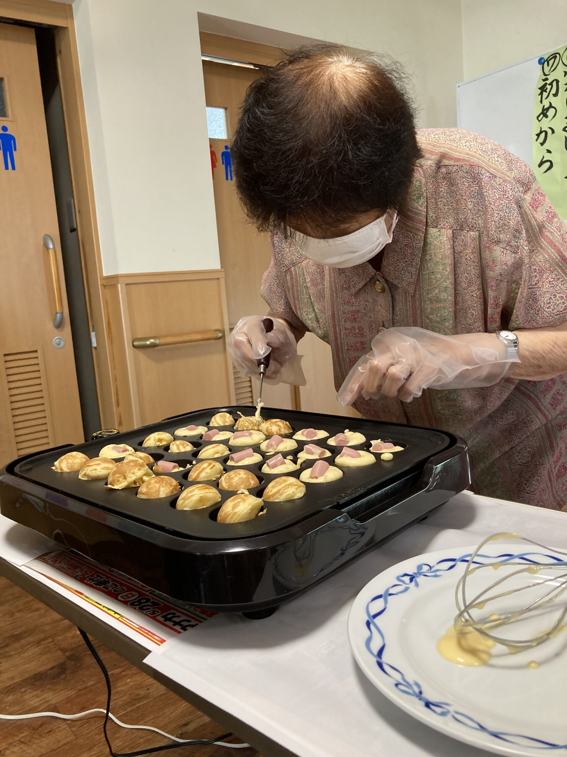 たこ焼き器で『ミニアメリカンドッグ』を作りました。ウインナーソーセージを一口サイズに切り、殻が入らないように卵をわり、生地を混ざ合わせました。たこ焼き機に生地を慎重に流し込み、火傷に気を付けて穴に1個ずつウインナーをいれました。2個入ってしまった所もありましたが「これは、大当たりだね!!」と話され笑顔が見られました。焼いている最中は「もういいかな?」と話されながら焦げないように一生懸命にクルクルとまわされていました。出来上がるとケチャップとマスタードを付けておやつ時に召し上がりました。「アメリカンドッグなんて初めてだわ。おいしい~~~」と言われ皆さん完食されました。