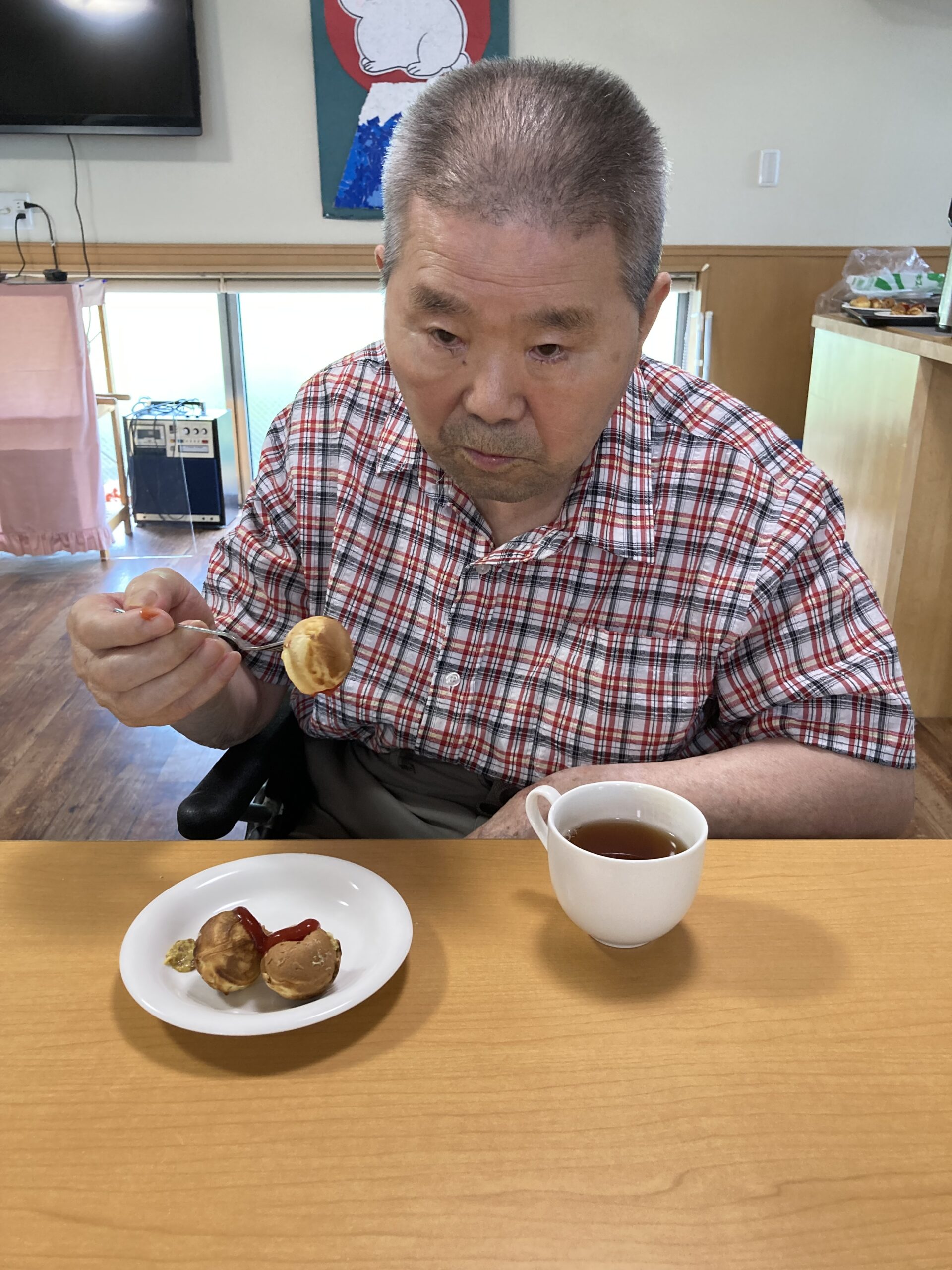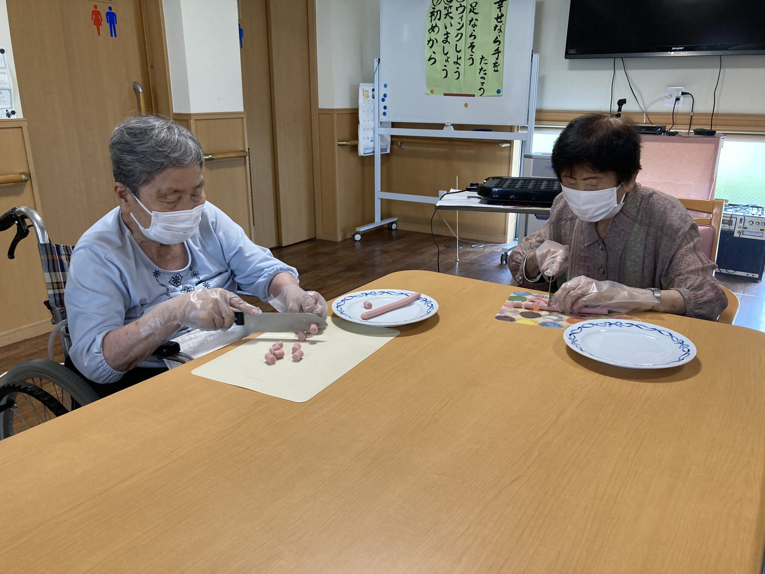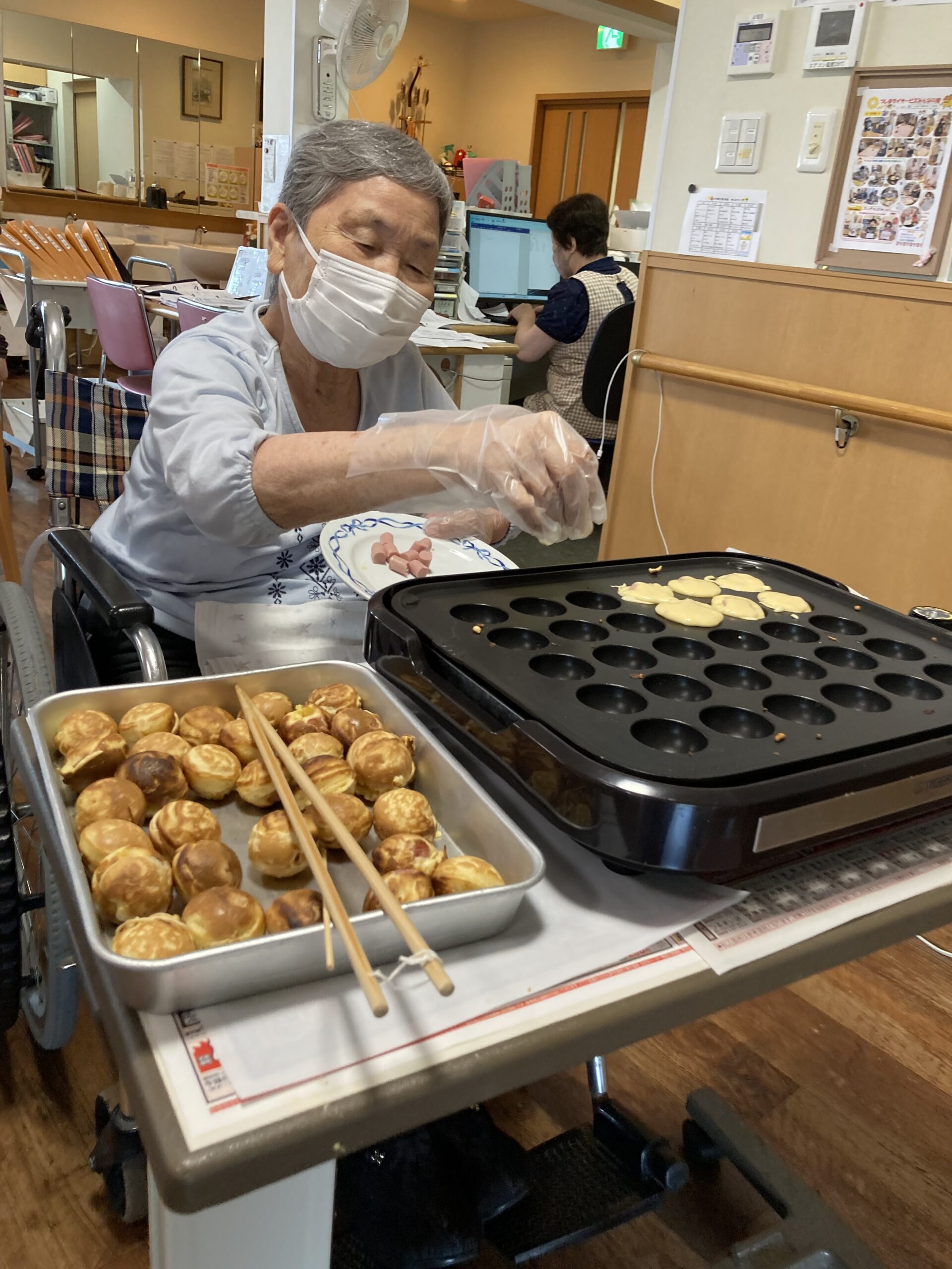 たこ焼き器で『ミニアメリカンドッグ』を作りました。ウインナーソーセージを一口サイズに切り、殻が入らないように卵をわり、生地を混ざ合わせました。たこ焼き機に生地を慎重に流し込み、火傷に気を付けて穴に1個ずつウインナーをいれました。2個入ってしまった所もありましたが「これは、大当たりだね!!」と話され笑顔が見られました。焼いている最中は「もういいかな?」と話されながら焦げないように一生懸命にクルクルとまわされていました。出来上がるとケチャップとマスタードを付けておやつ時に召し上がりました。「アメリカンドッグなんて初めてだわ。おいしい~~~」と言われ皆さん完食されました。