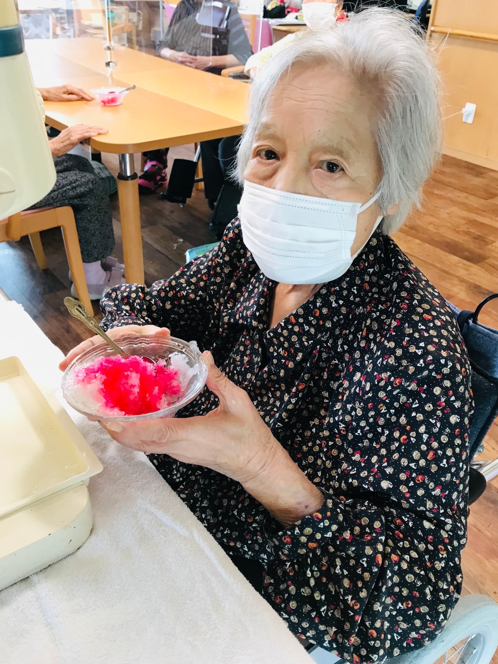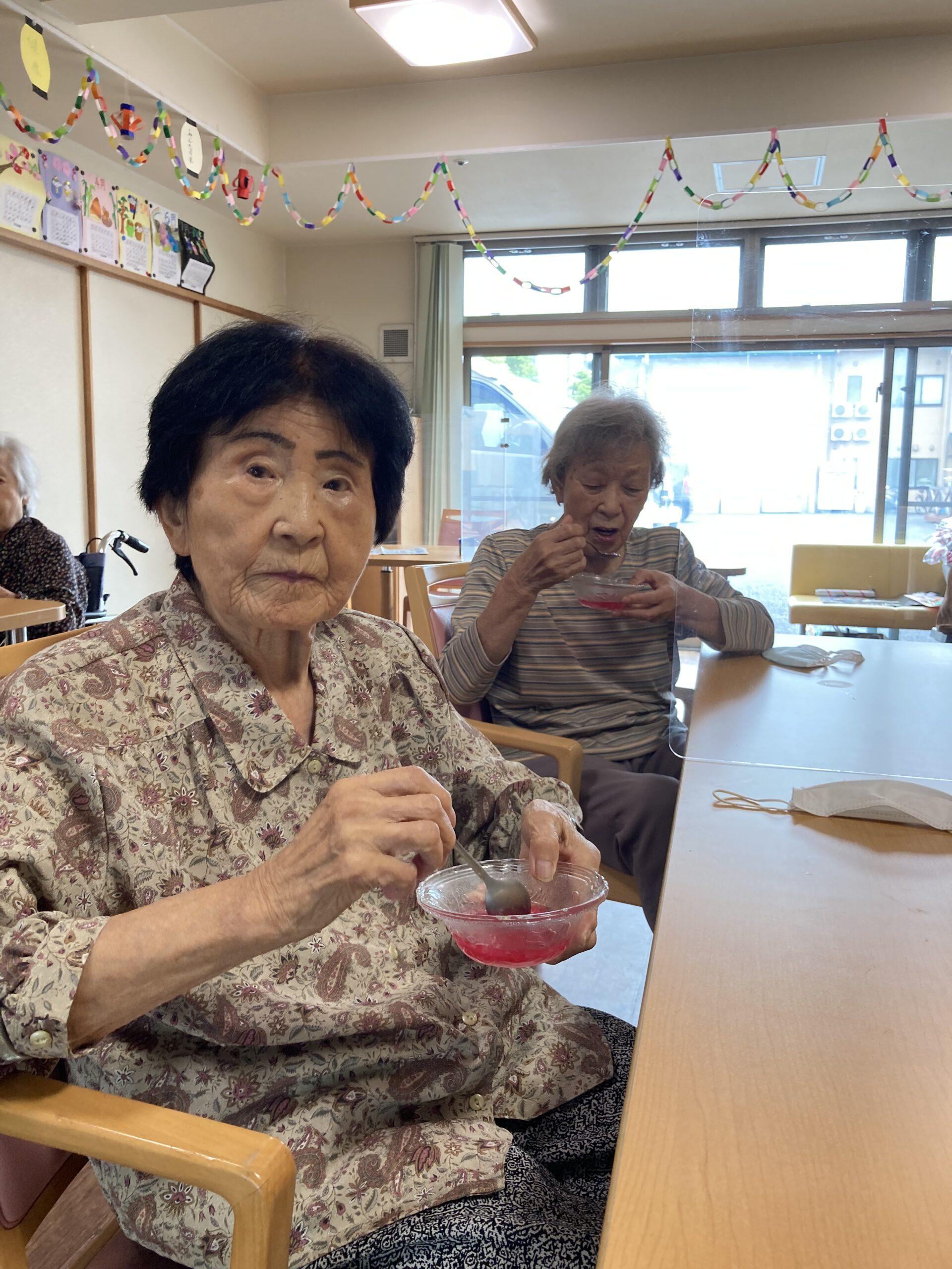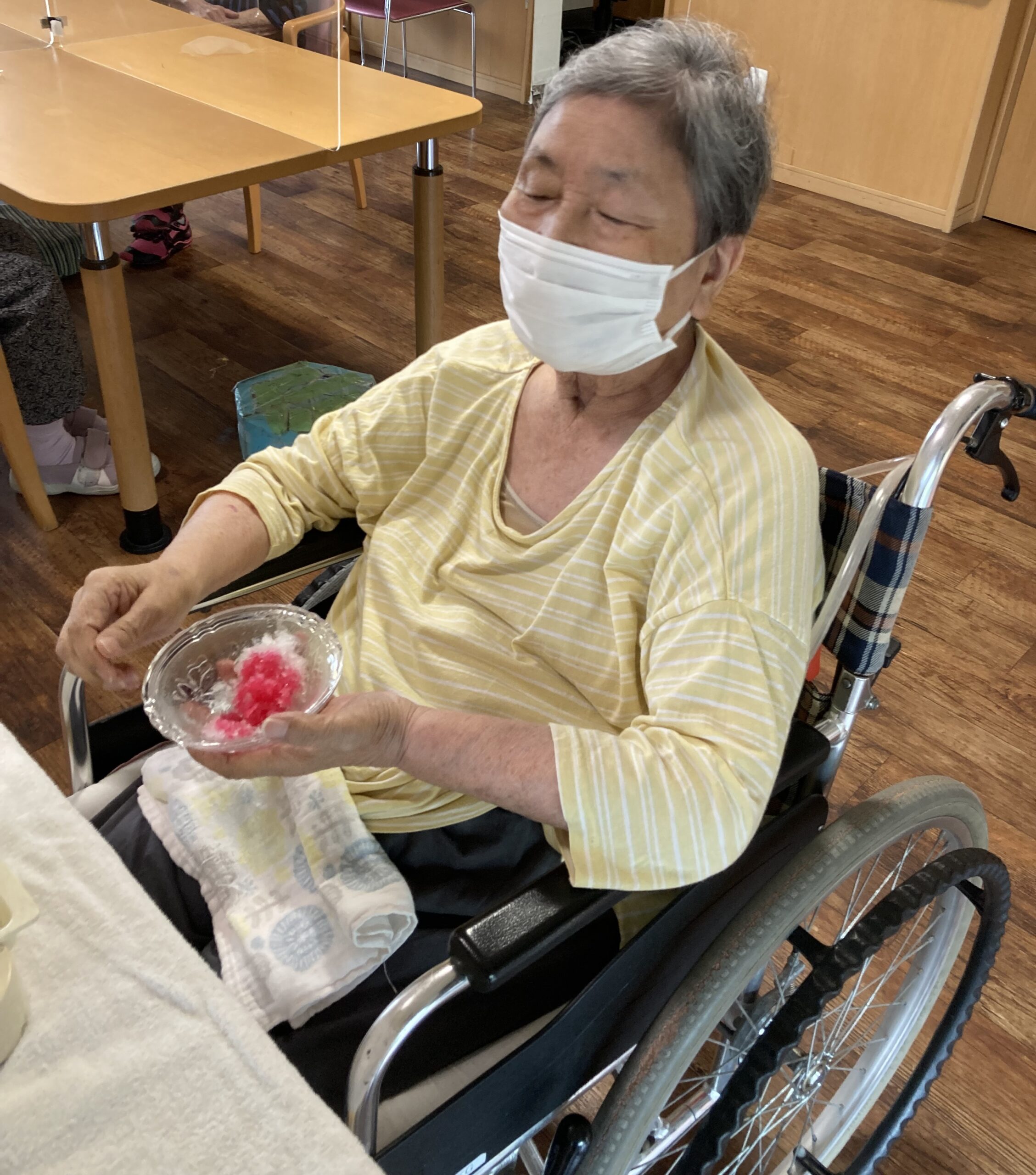 熱中症対策の為、昼食後とおやつの間に普段はお茶を提供させていただいていますが、今日は夏の風物詩『かき氷』にしました。「美味しい~」や「夏だね~」と話され完食されました。『かき氷』を召し上がった後はレクリエーションの『輪投げ』でしっかりと身体を動かされていました。暑い夏が続いておりますが皆さんとてもお元気です。