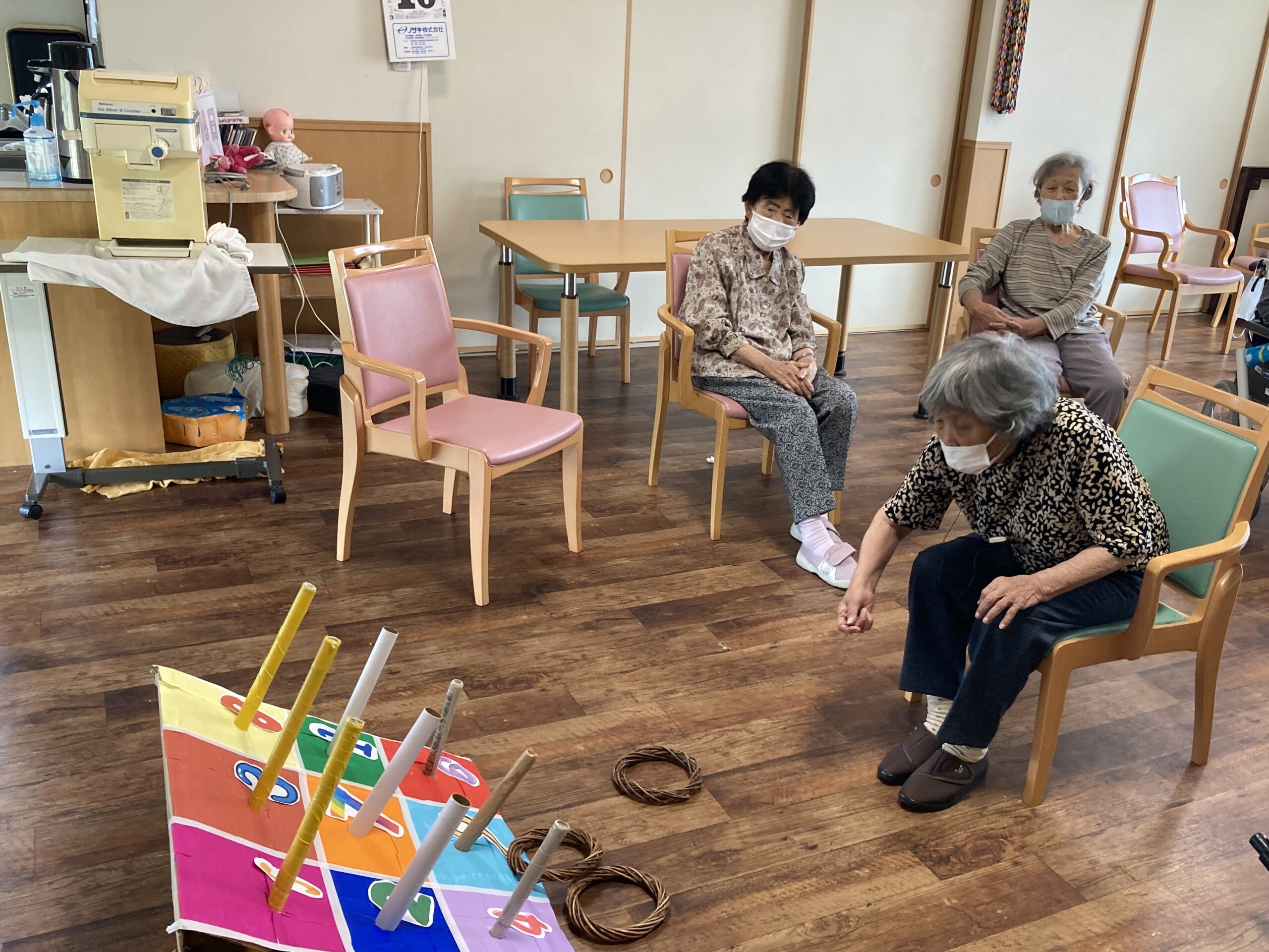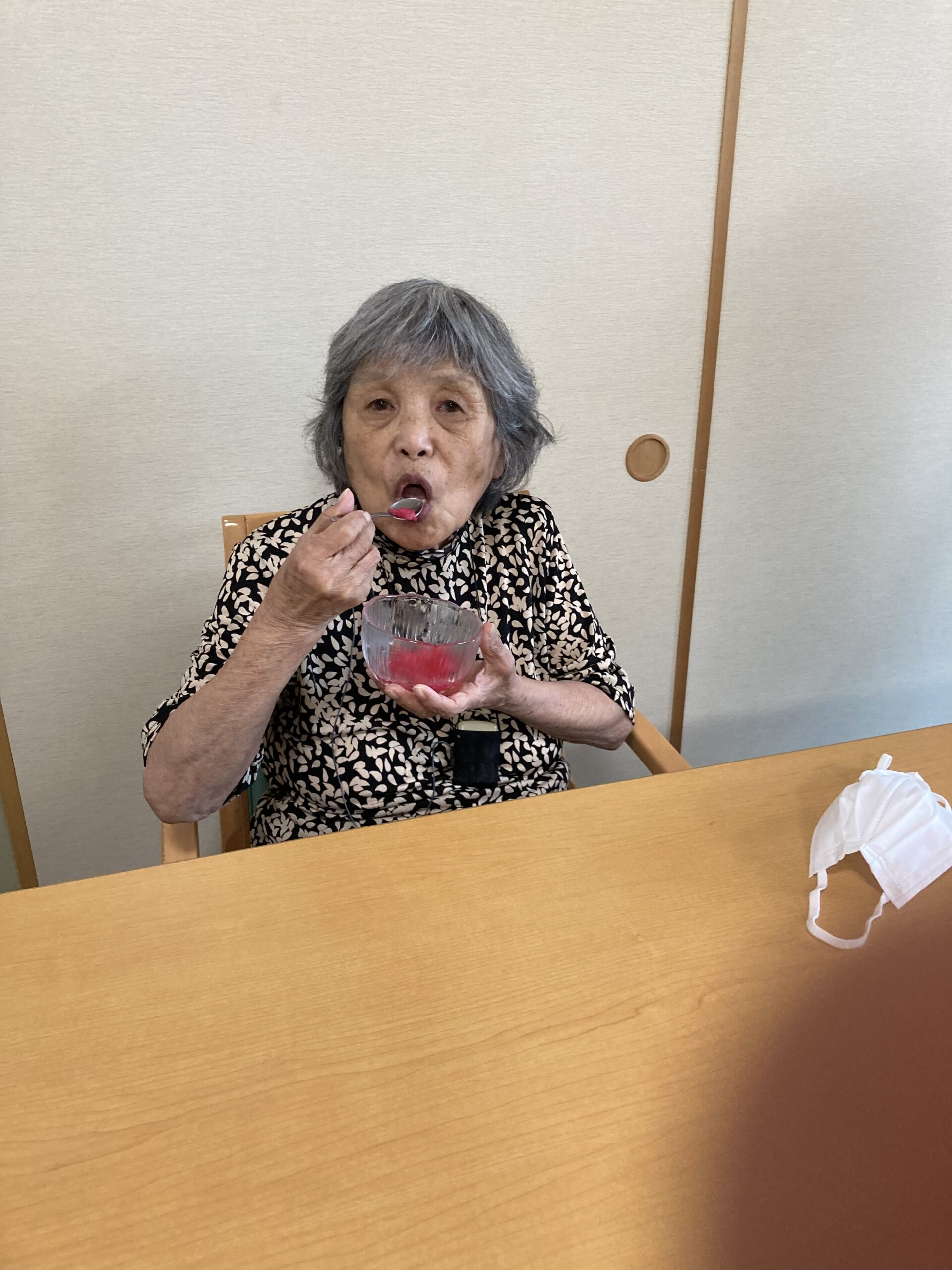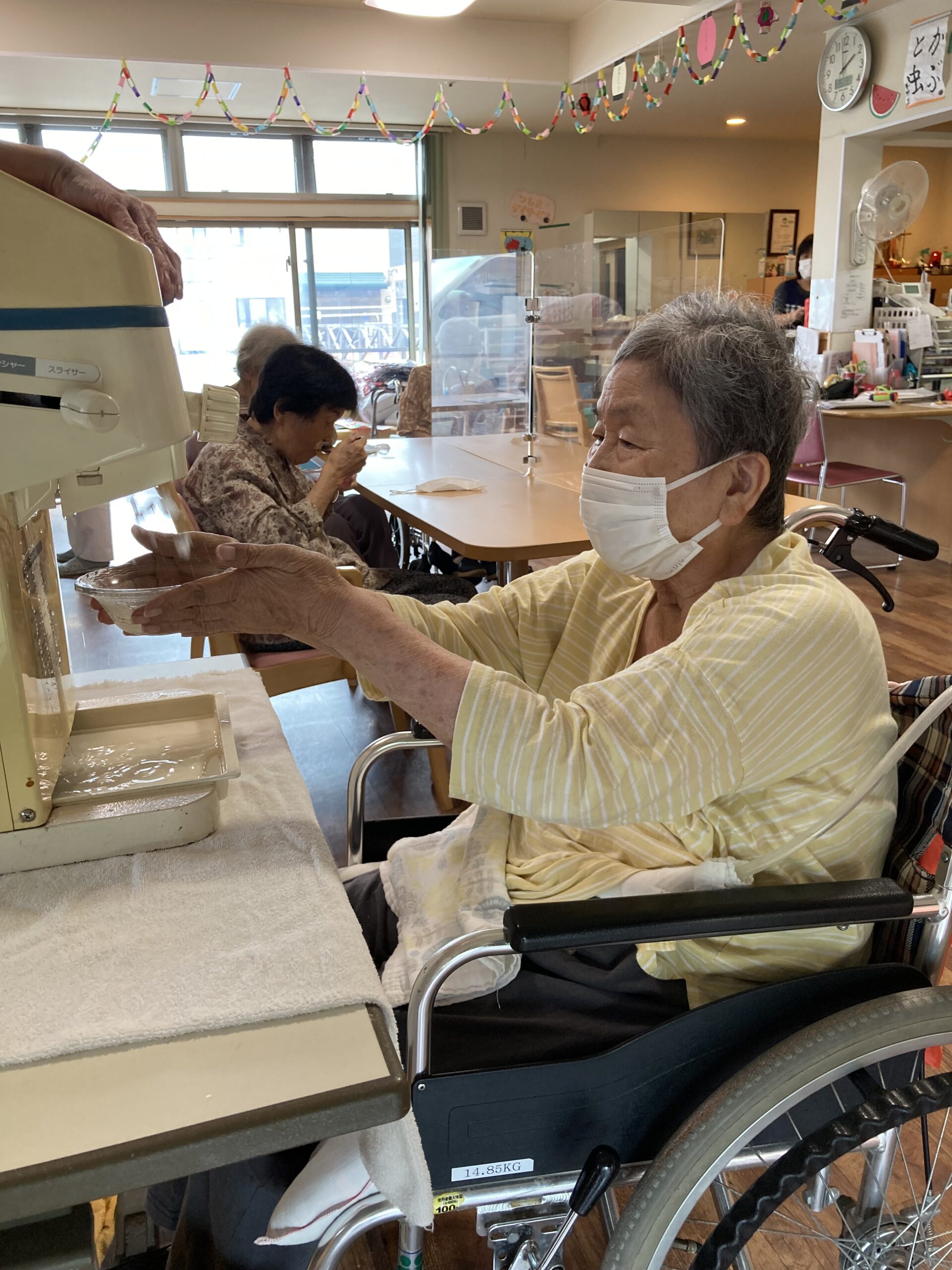 熱中症対策の為、昼食後とおやつの間に普段はお茶を提供させていただいていますが、今日は夏の風物詩『かき氷』にしました。「美味しい~」や「夏だね~」と話され完食されました。『かき氷』を召し上がった後はレクリエーションの『輪投げ』でしっかりと身体を動かされていました。暑い夏が続いておりますが皆さんとてもお元気です。