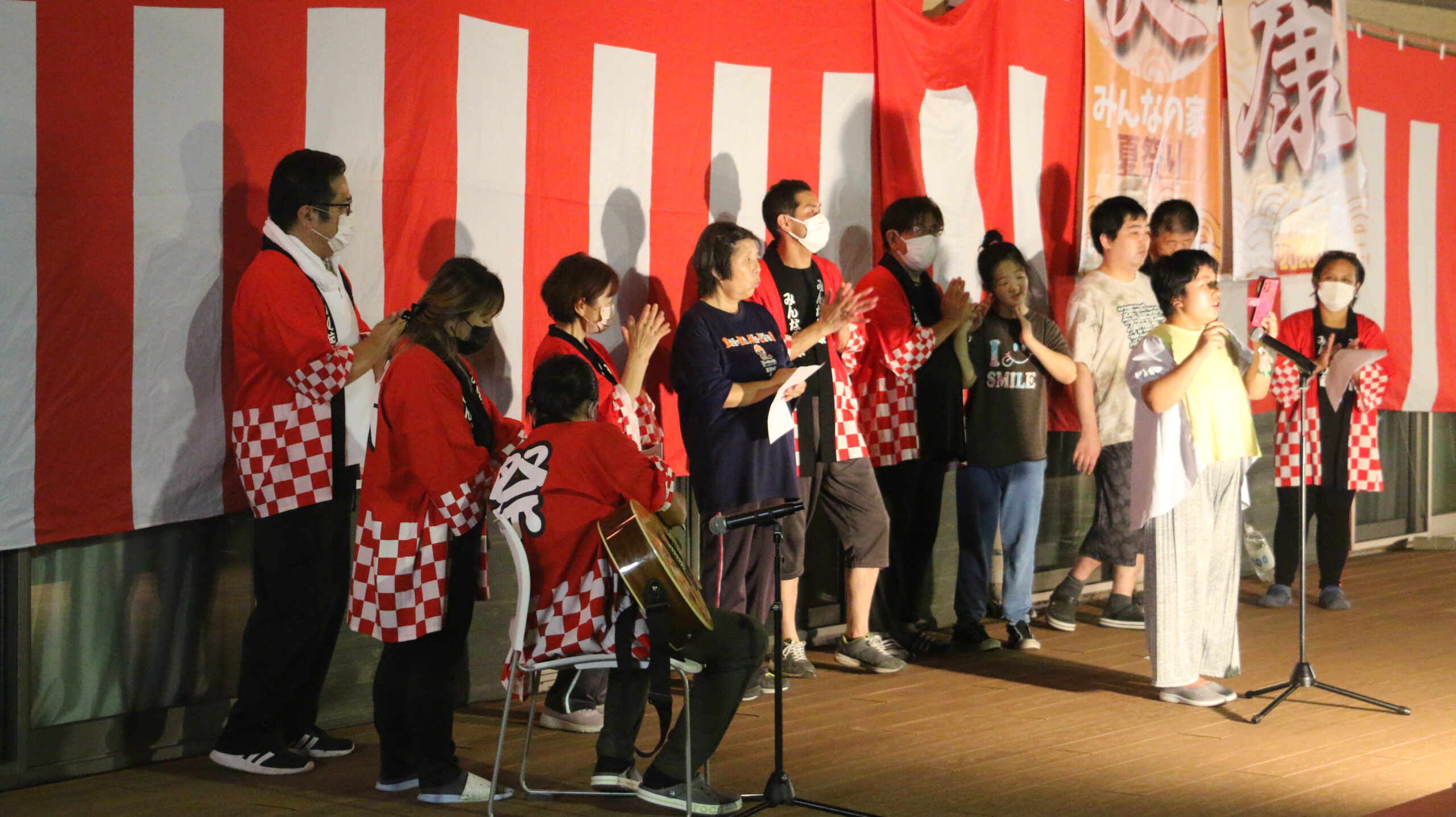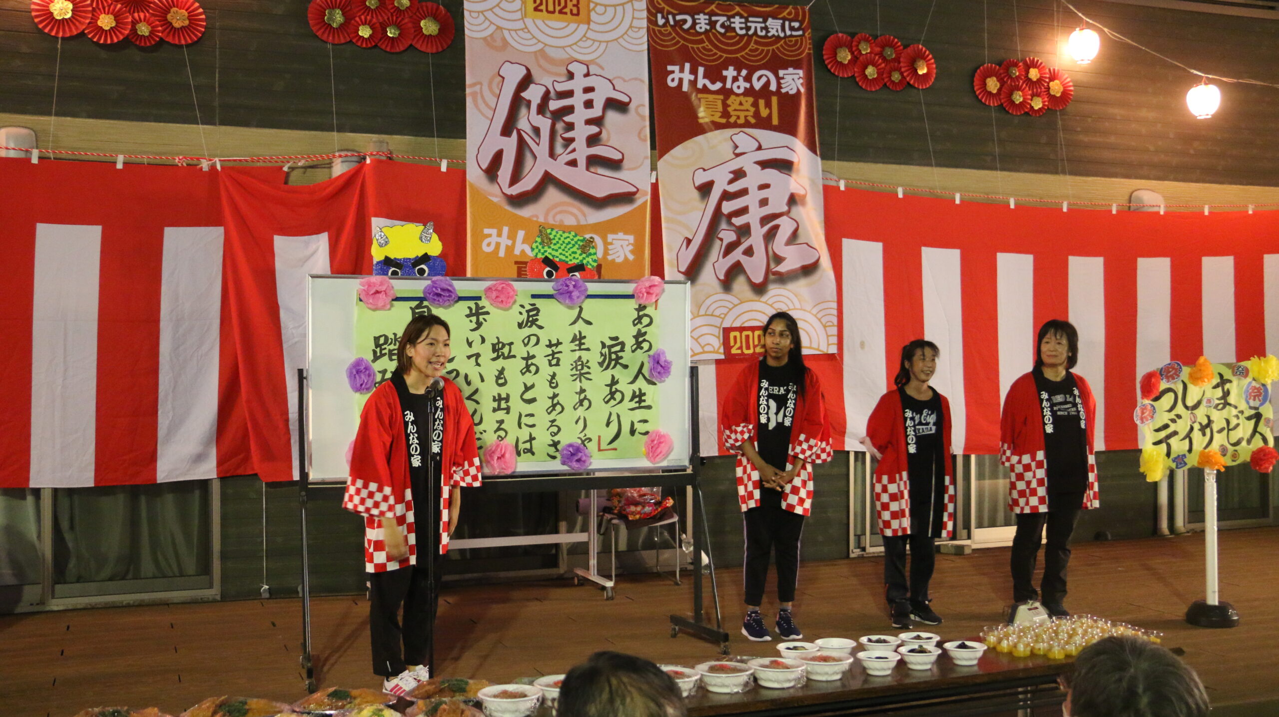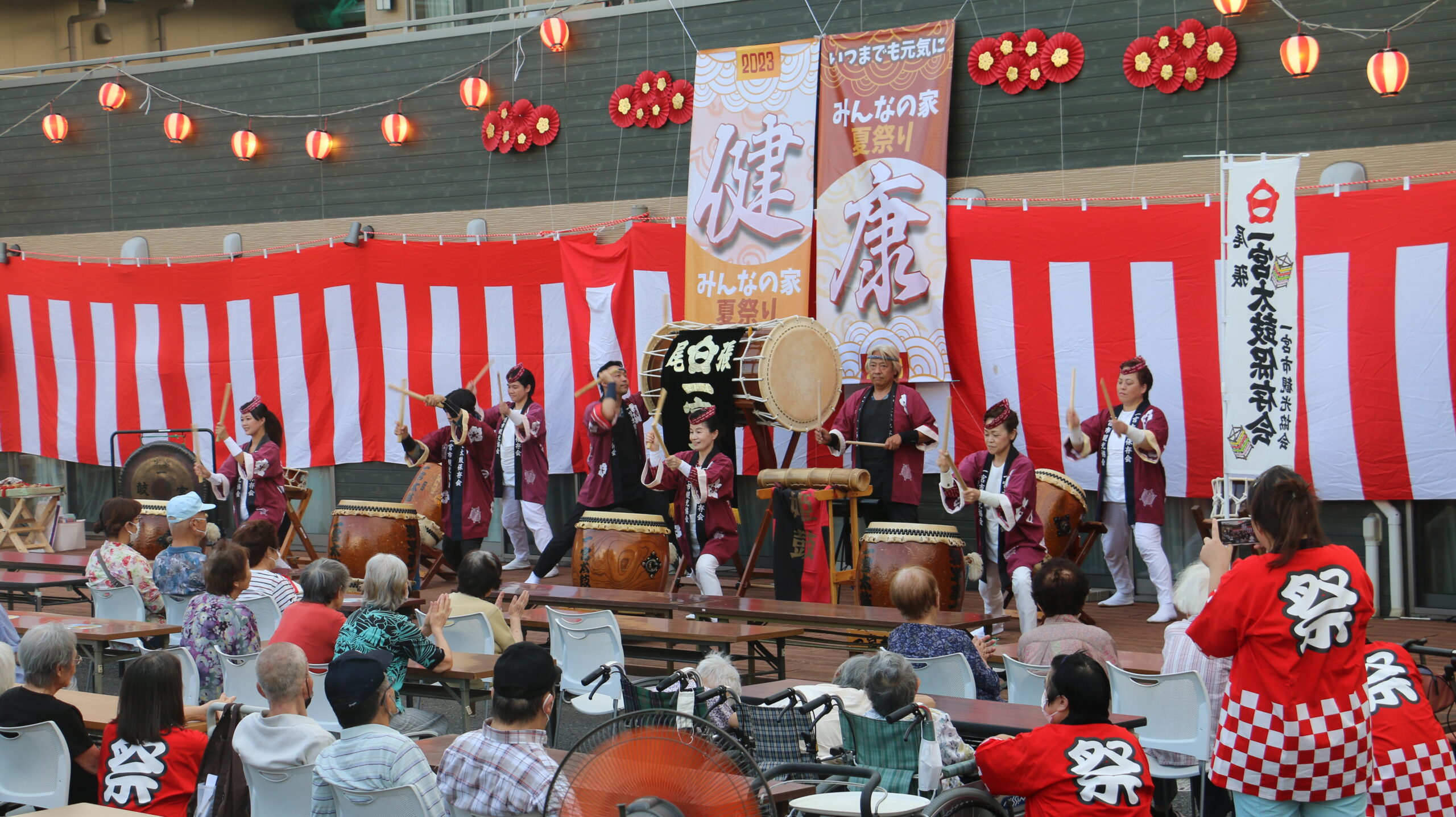 こんにちは、今年は4年ぶりに夏祭りを開催する事が出来ました。テーマは「健康」で、皆さんに元気と活力をお届け出来るよう準備してきました。今年は、迫力ある太鼓演奏にスタッフや利用者様達の歌を鑑賞しながら久しぶりに皆さんと一緒に外で夕食を食べる事が出来ました。夜に行われた写真上映と花火が終わると会場中の心が一つになった気がしました!来年も開催出来るようこれからも健康を大切にして行きたいと思います。