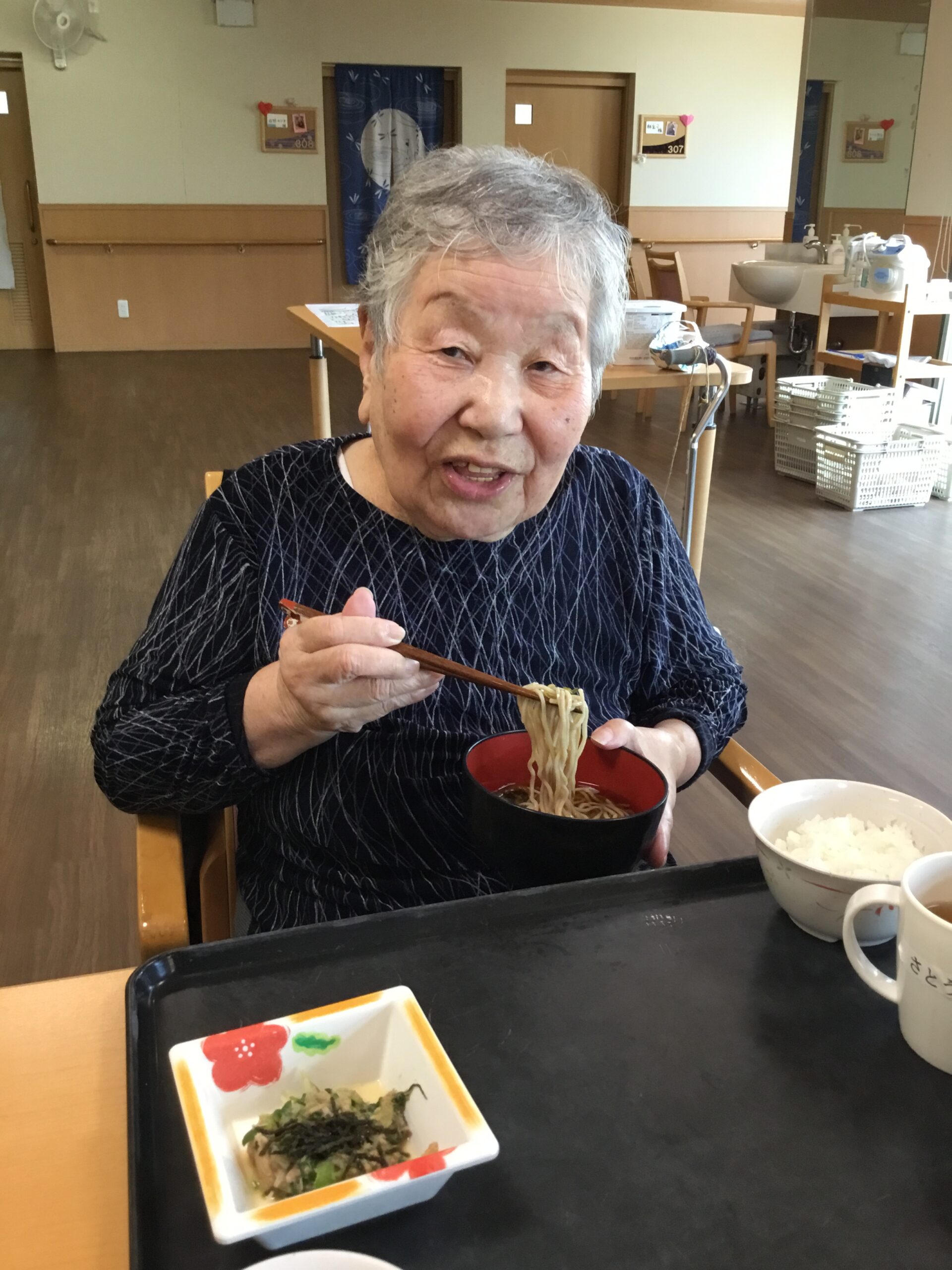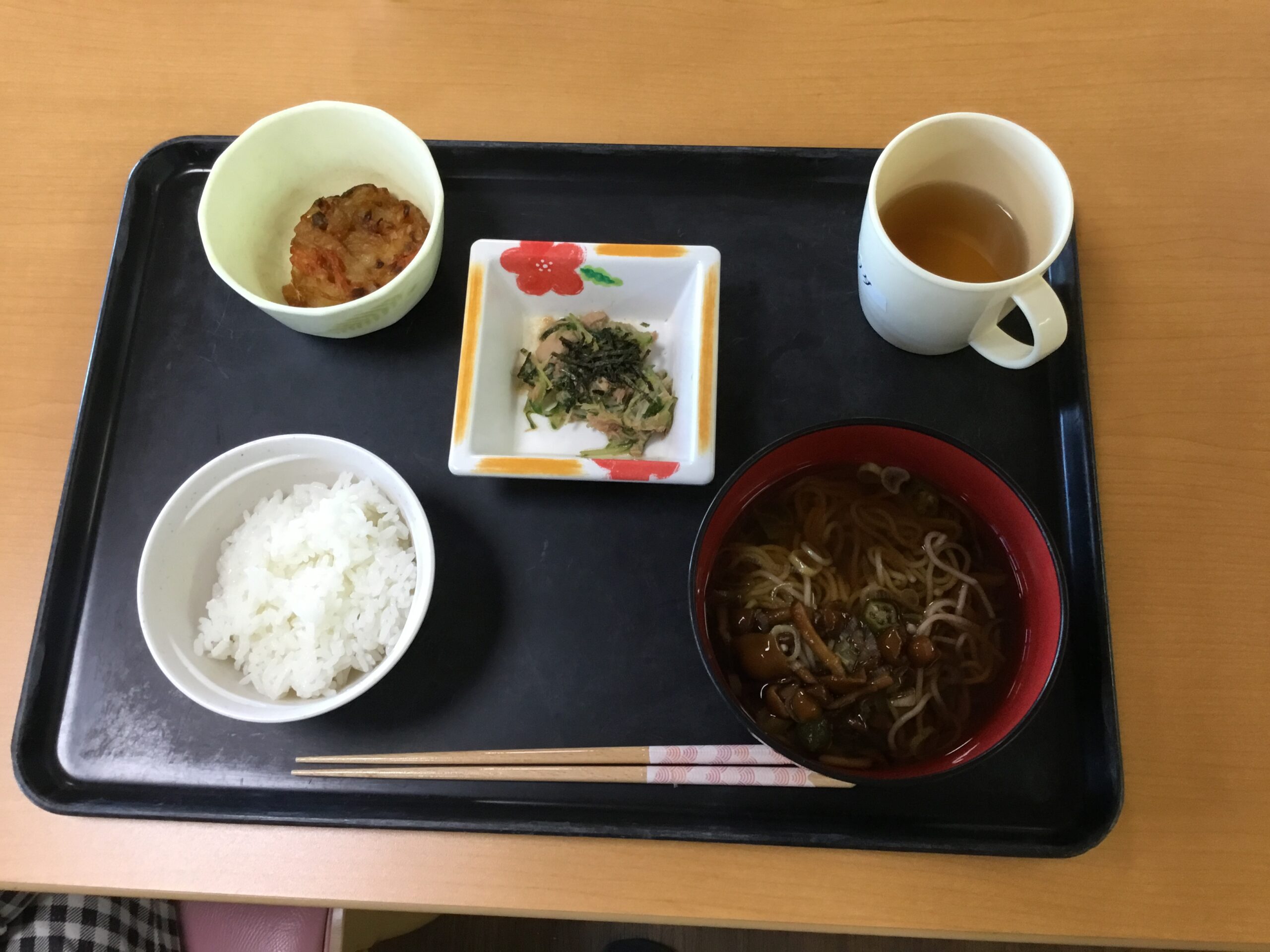 こんにちは、今日の昼食は、なめこそば、かき揚げ、ツナときゅうりのわさび醤油和えです。なめこそばは新鮮ななめこが風味を引き立て温かい出汁に麺がよくからみ非常に美味しく頂く事が出来ました。お昼の館内は皆さんの笑い声と麺をすする大きな音で楽しいひと時を過ごされました😊