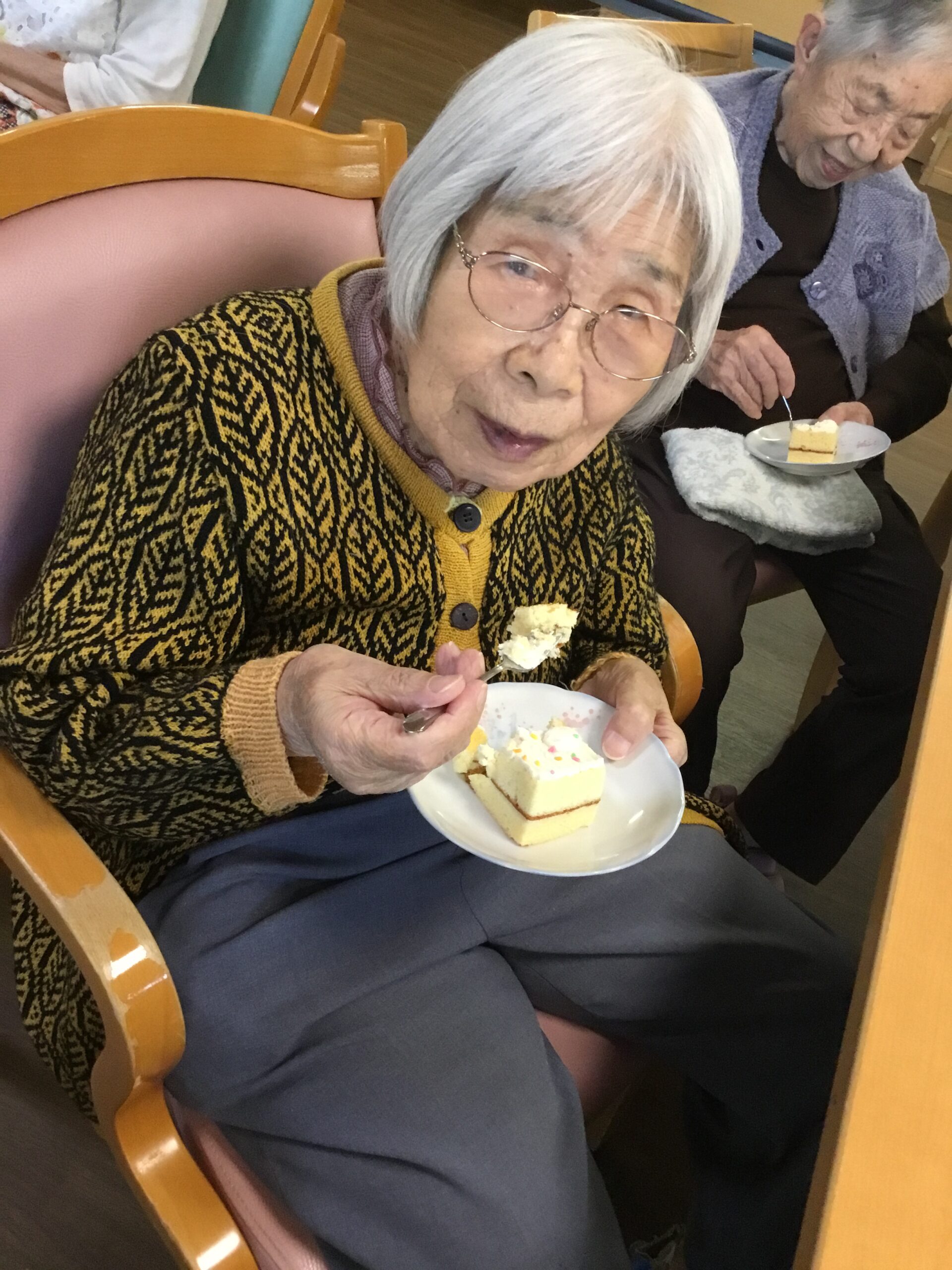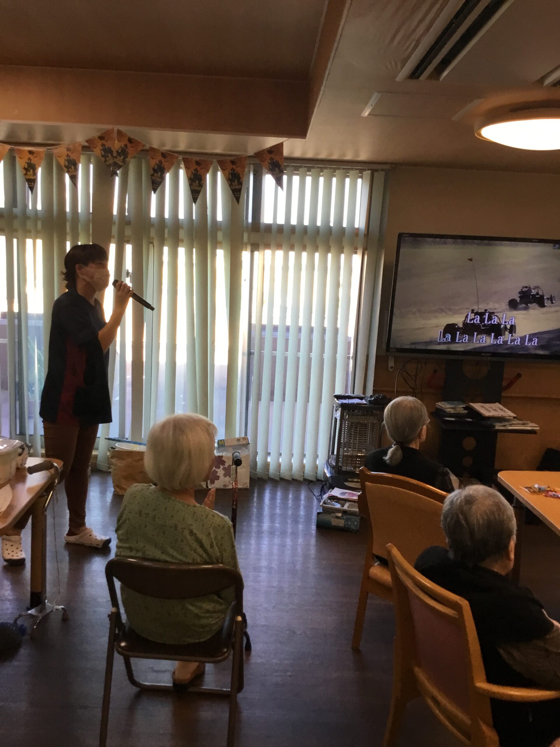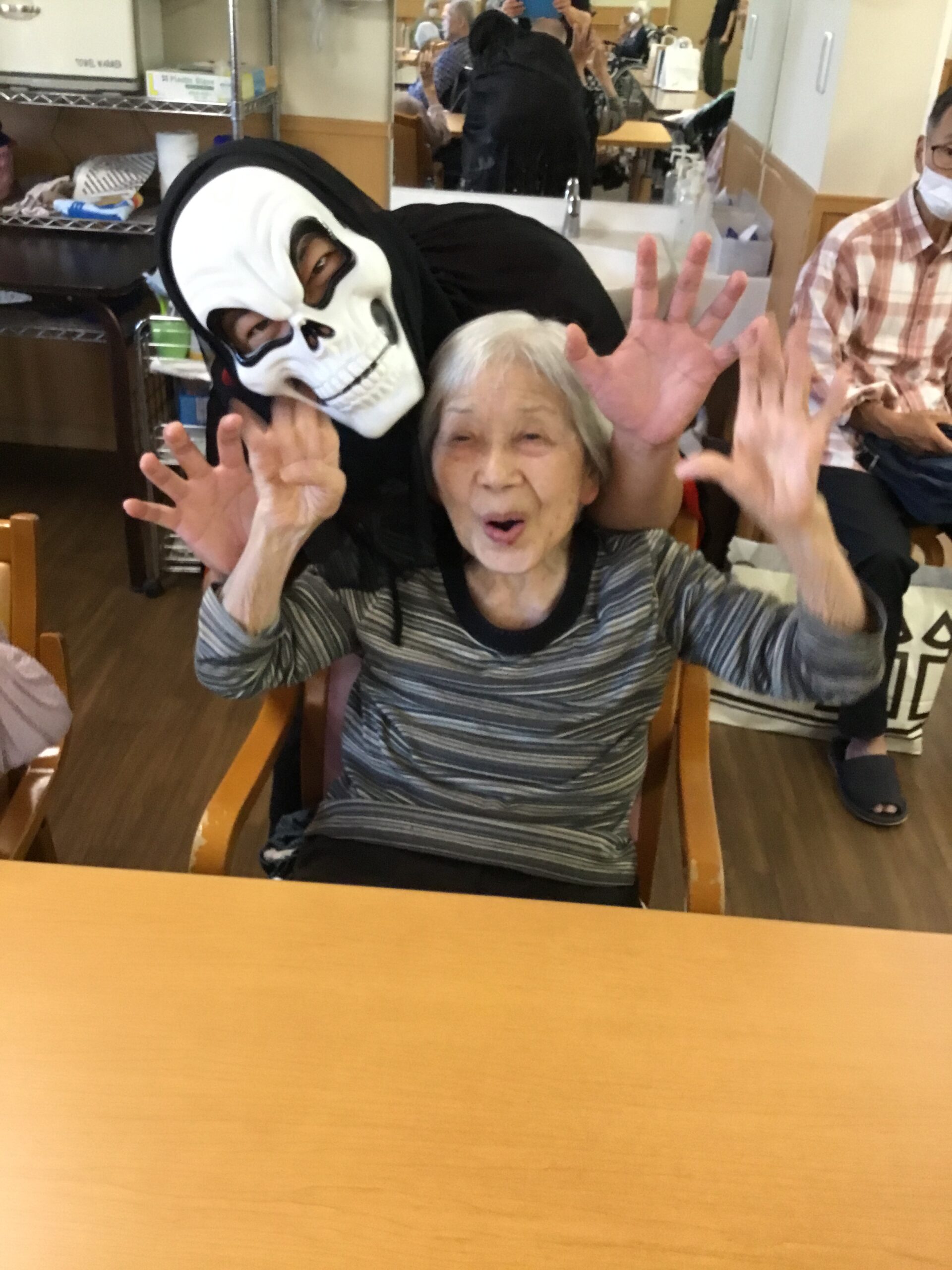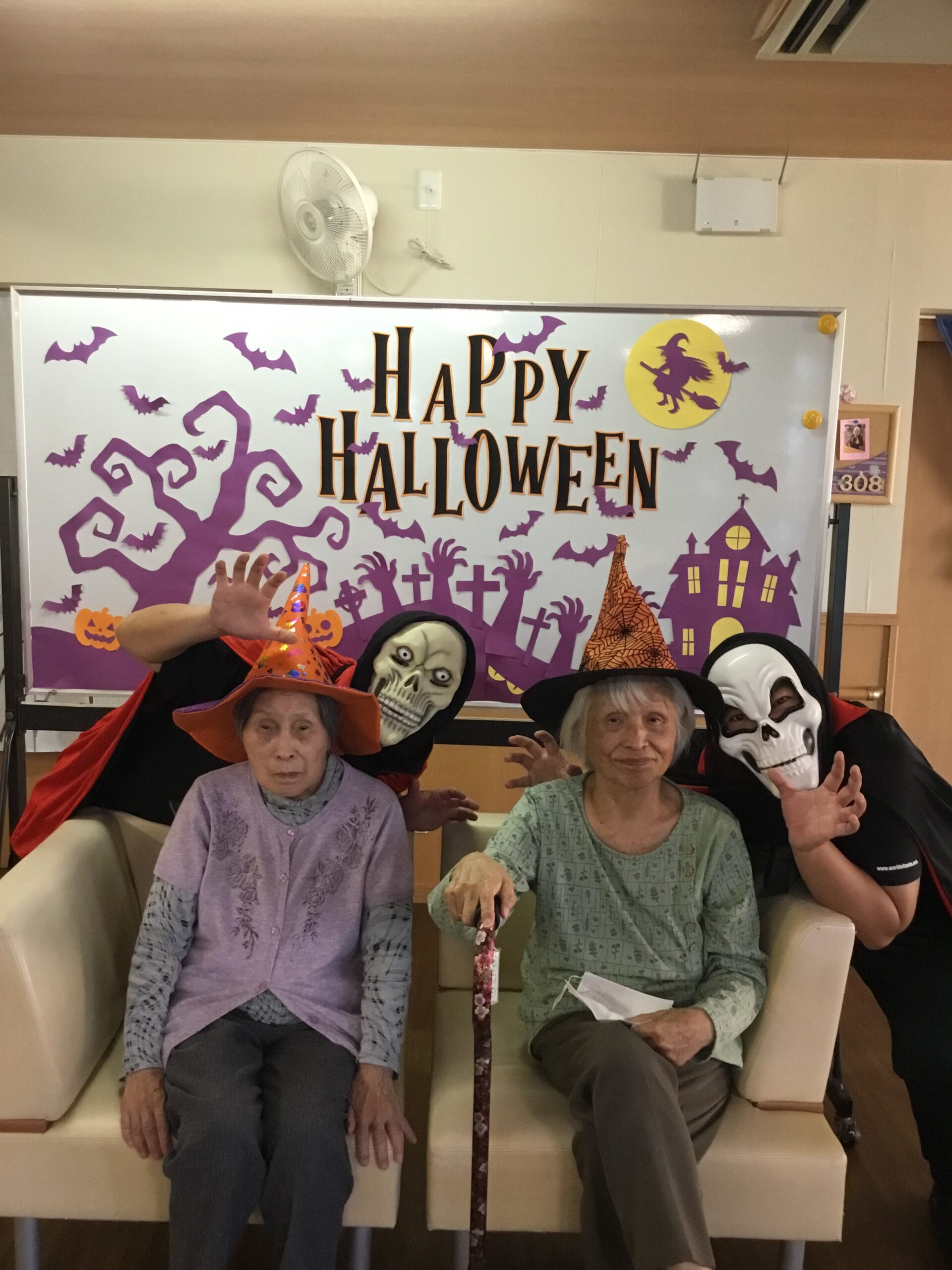 こんにちは、今日は10月生まれの利用者様の誕生日会を行いました。今回はいつもと雰囲気を変えハロウィンの飾り付けで開催いたしました。スタッフがふんするお化けからイタズラとお菓子をもらい皆さんで一緒にカラオケを歌いました。怖いお化けと記念写真を撮ると皆さん悲鳴を上げながら大笑いし大変盛り上がる事が出来ました。その後は、誕生日ケーキを召し上がり楽しい時間を過ごされました👻
