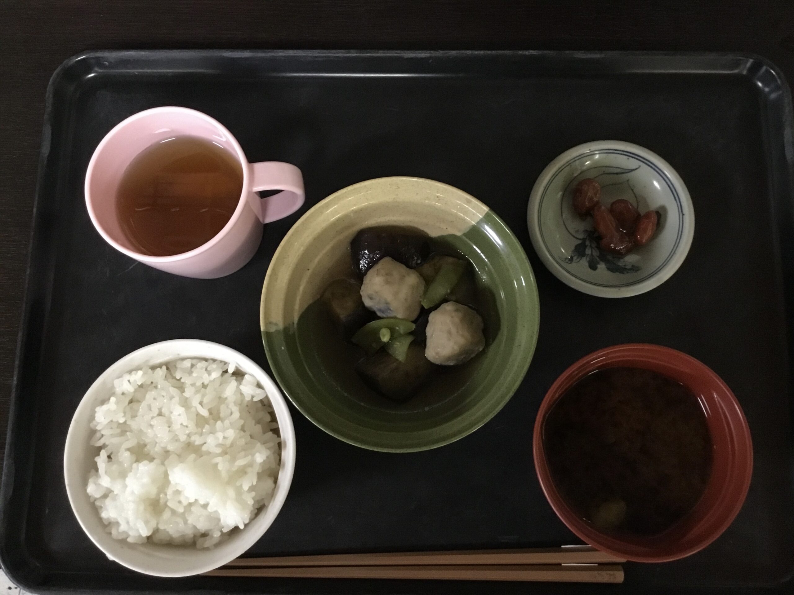今日の朝食は、ご飯、イカ団子の煮物、味噌汁、金時豆、マミーになります。朝食を食べた後は、朝のラジオ体操とコーヒータイムが施設のモーニングルーティンになります。
