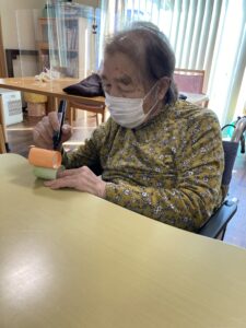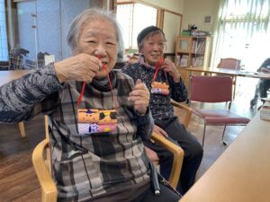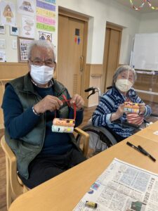 トイレットペーパー芯でお雛様とお内裏様を制作しました。「着物は何色がいいかなあ?」と悩まれたり、「丸くなっているから顔が上手く書けん」と話されながらも皆さん集中して作成されました。