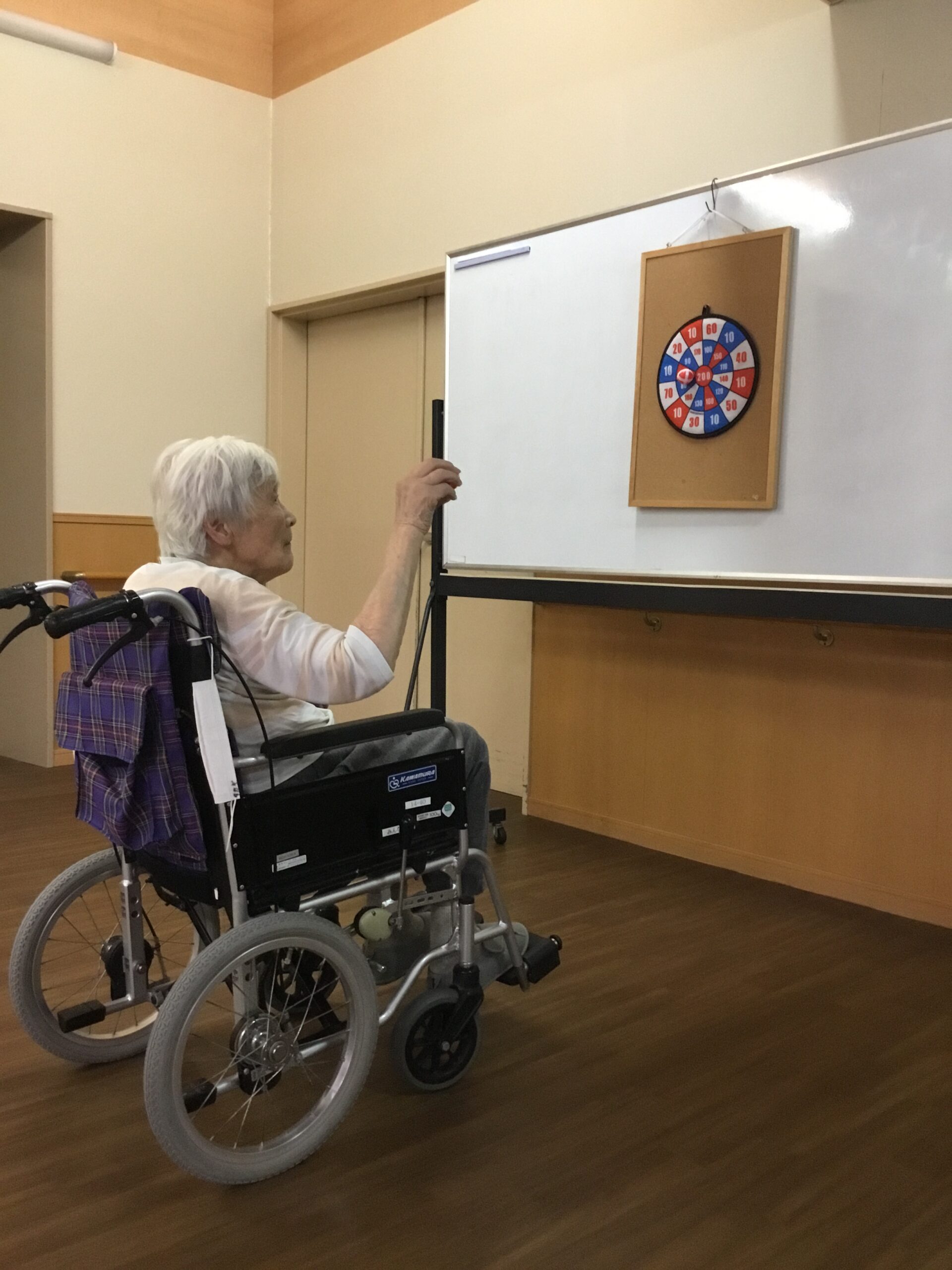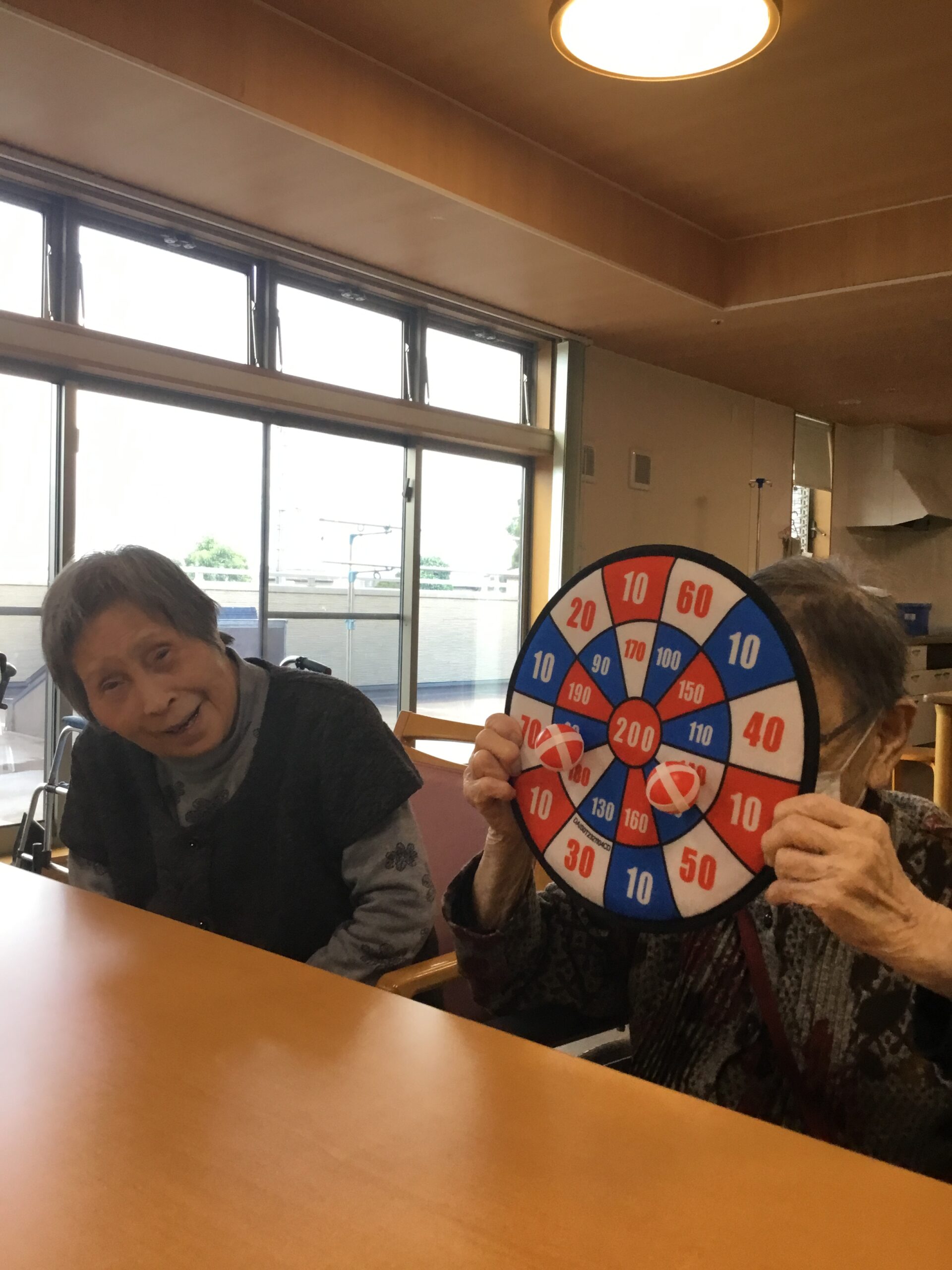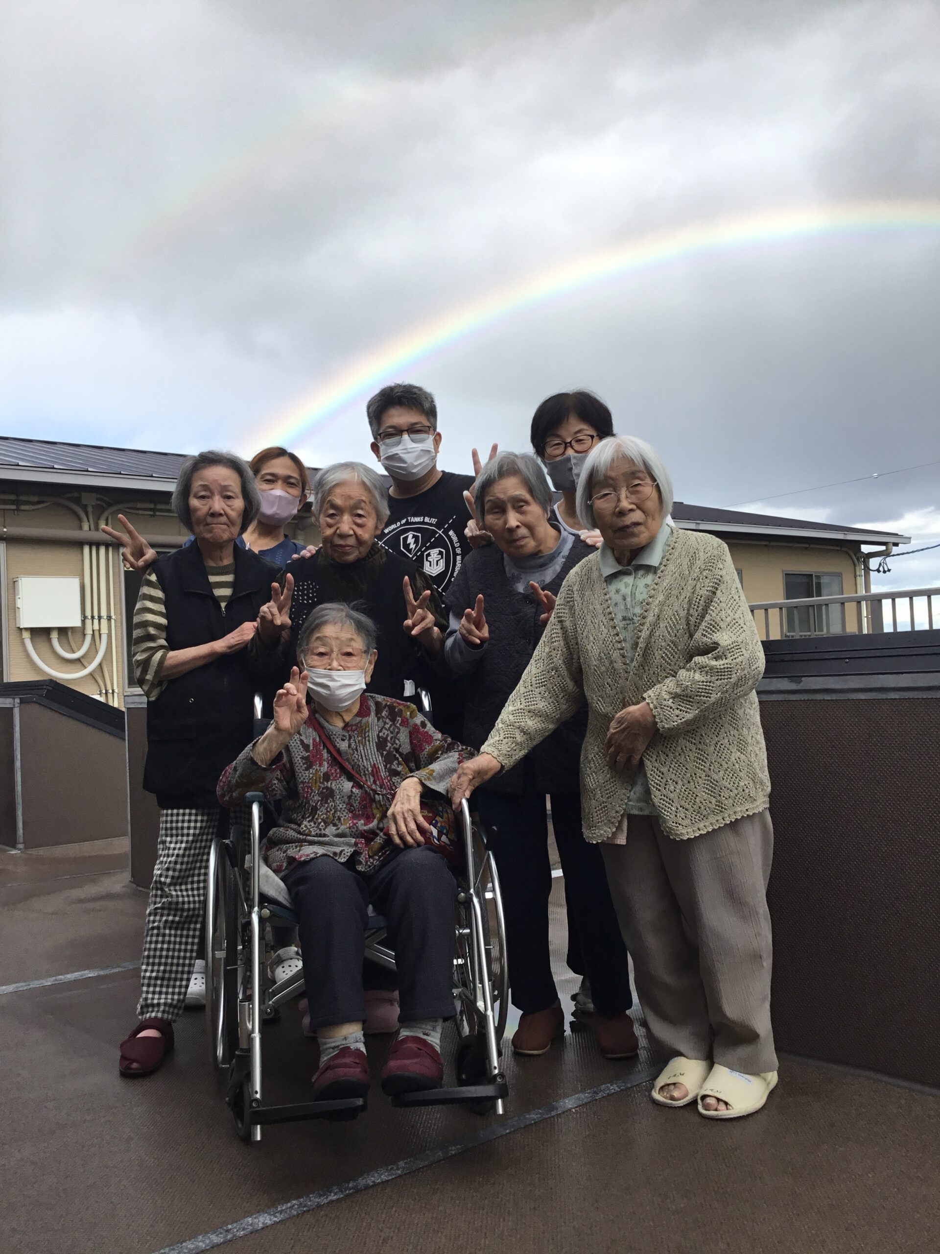 こんにちは、日常の様子をお届けします。館内にて皆さんとダーツをして楽しく遊びました。この日は雨が降っていましたが次第に雨はやみ「虹が見えるよ」と利用者様に教えて頂き、皆さんで外のベランダから虹を鑑賞しなが記念写真を撮る事が出来ました。皆さん幸せな気持ちになりました😊