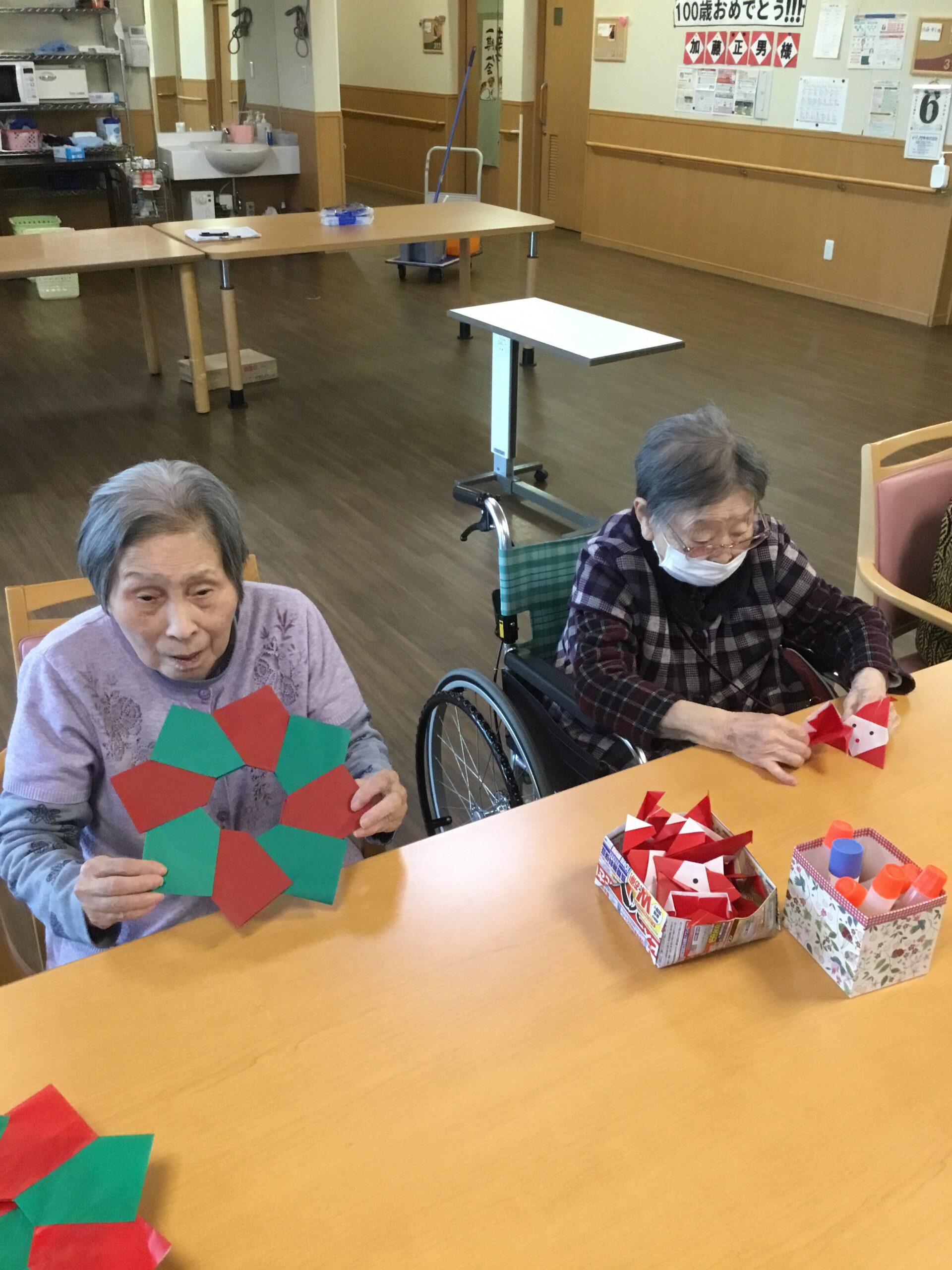 こんにちは、今日は皆さんで一緒に折り紙を折りました。12月なので冬の飾り付けを製作しています。今だにサンタクロースがいると信じている利用者様、職員はクリスマスが来るのを待ちどおしく思っております。プレゼントにはロレックスの腕時計が欲しいなぁ〜😊