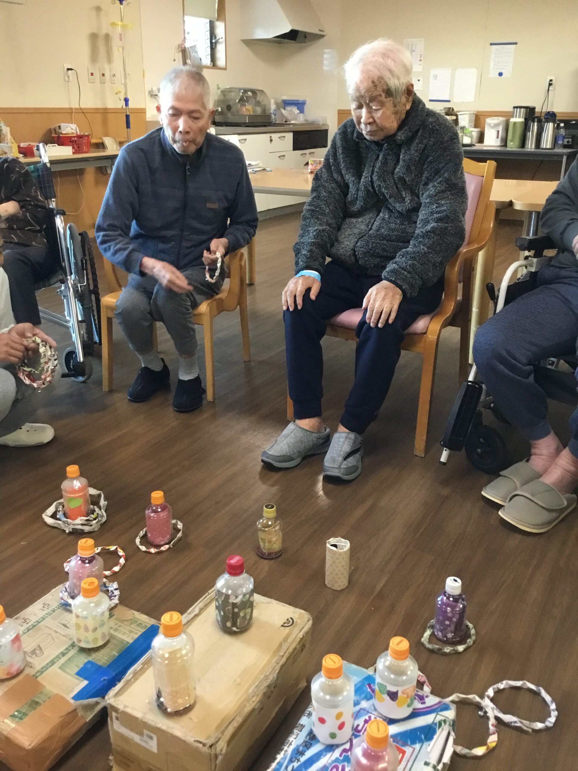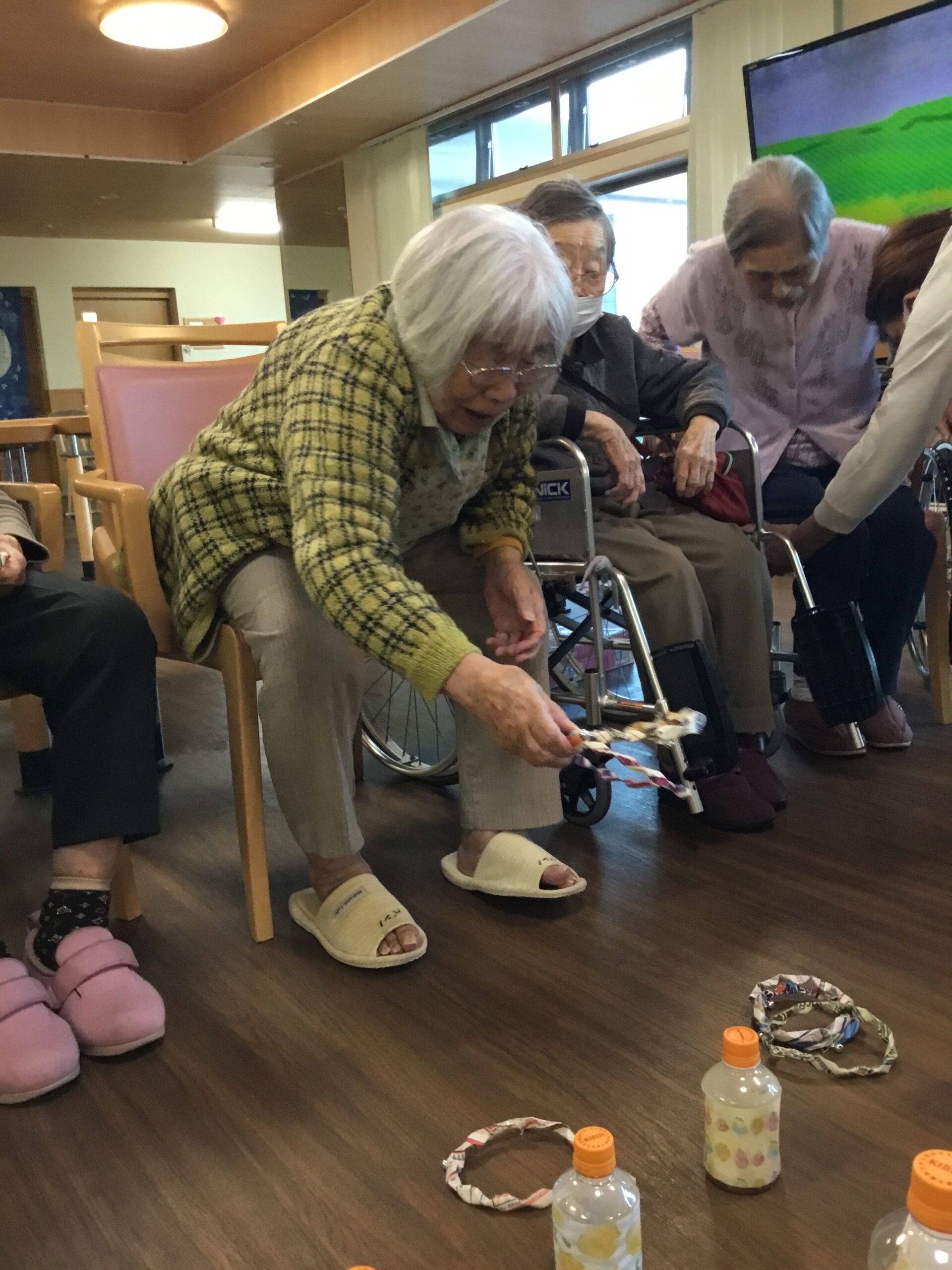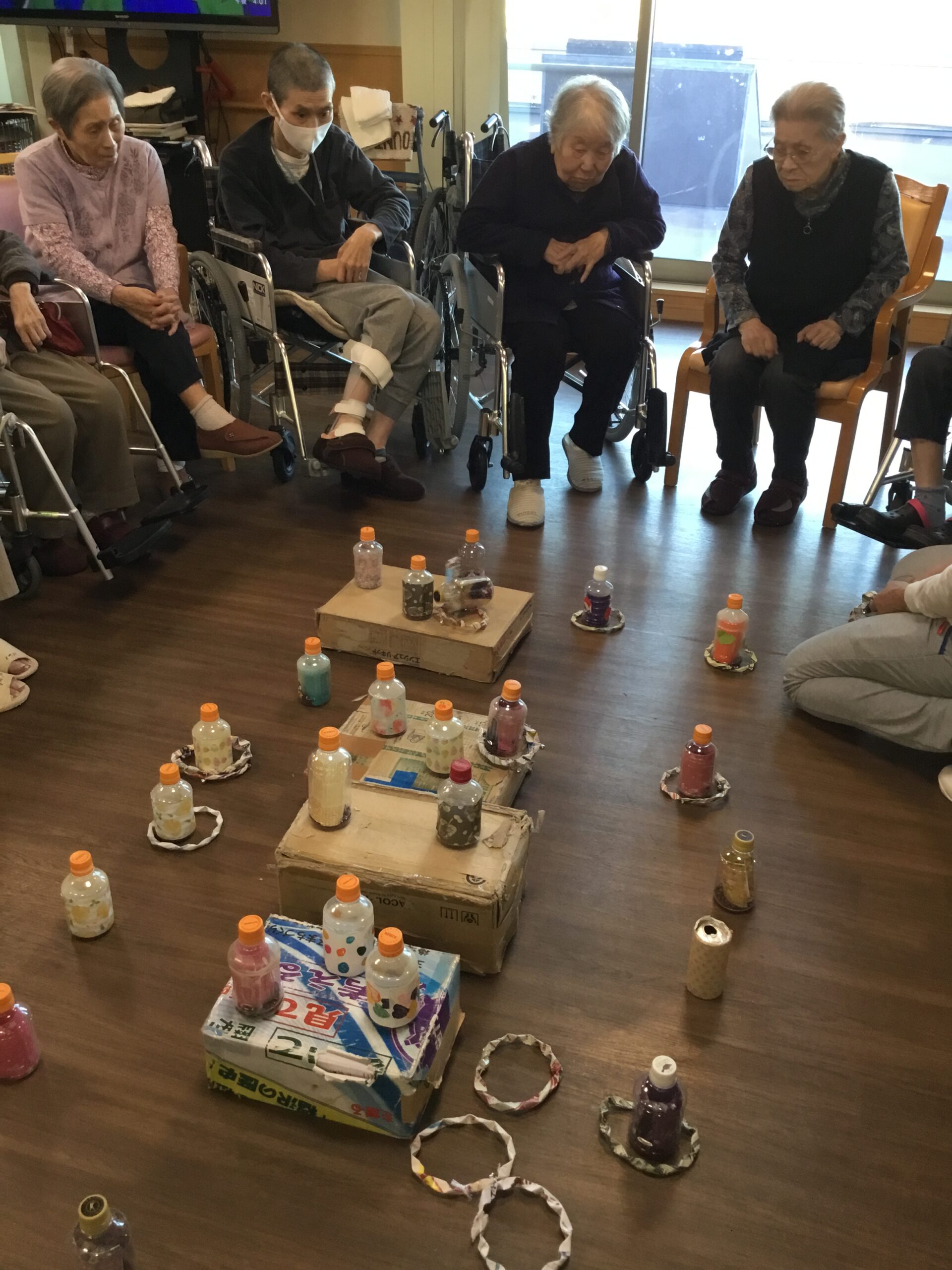 こんにちは、レクリエーションの時間に皆さんで一緒に輪投げを行いました。輪を的確な場所に投げるゲームで得点を競い合いました。皆さんのユニークなテクニックで終始、笑いと拍手で盛り上がる事が出来ました。