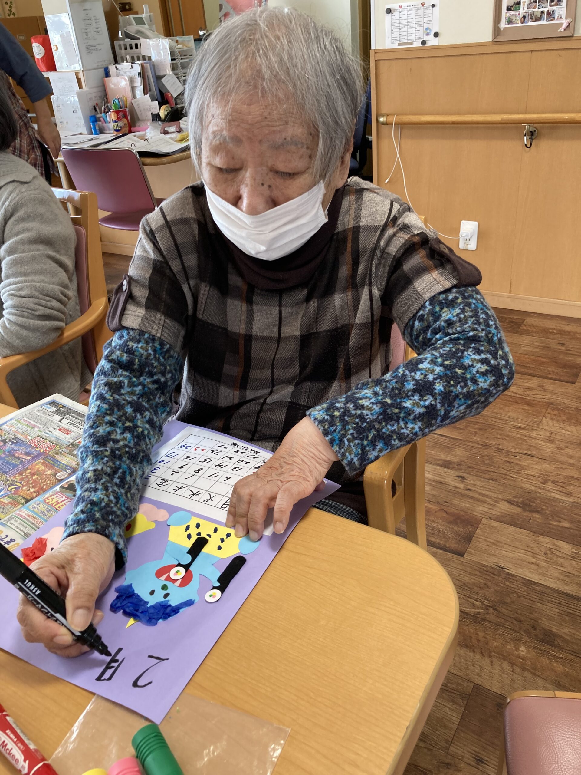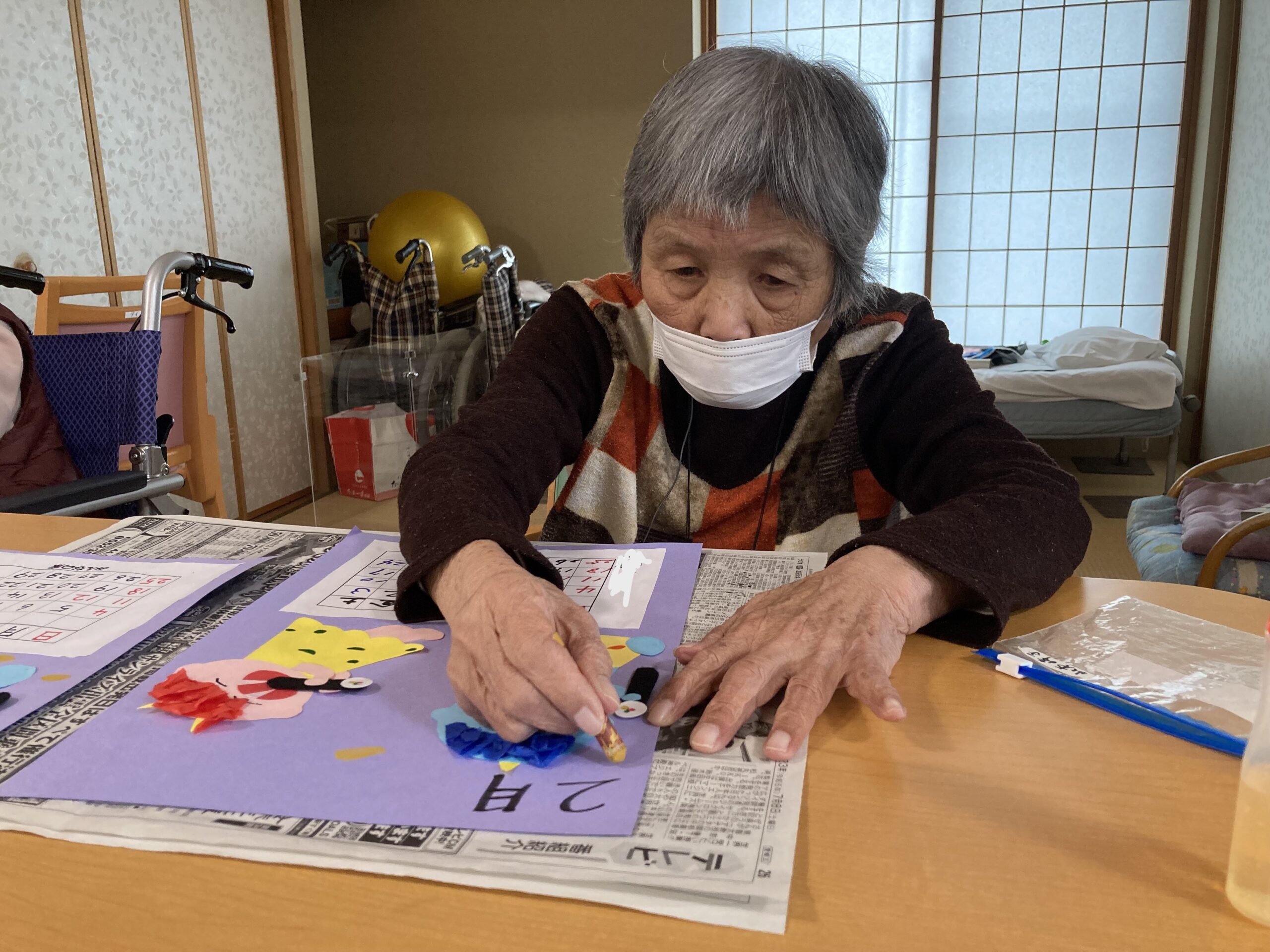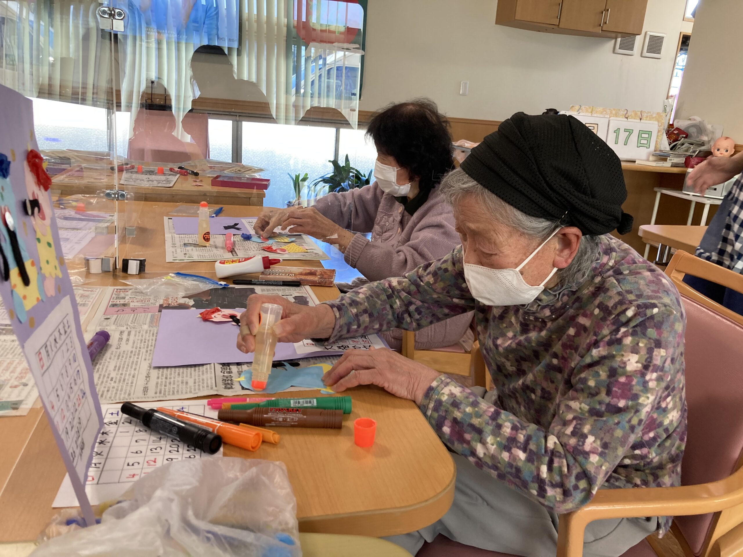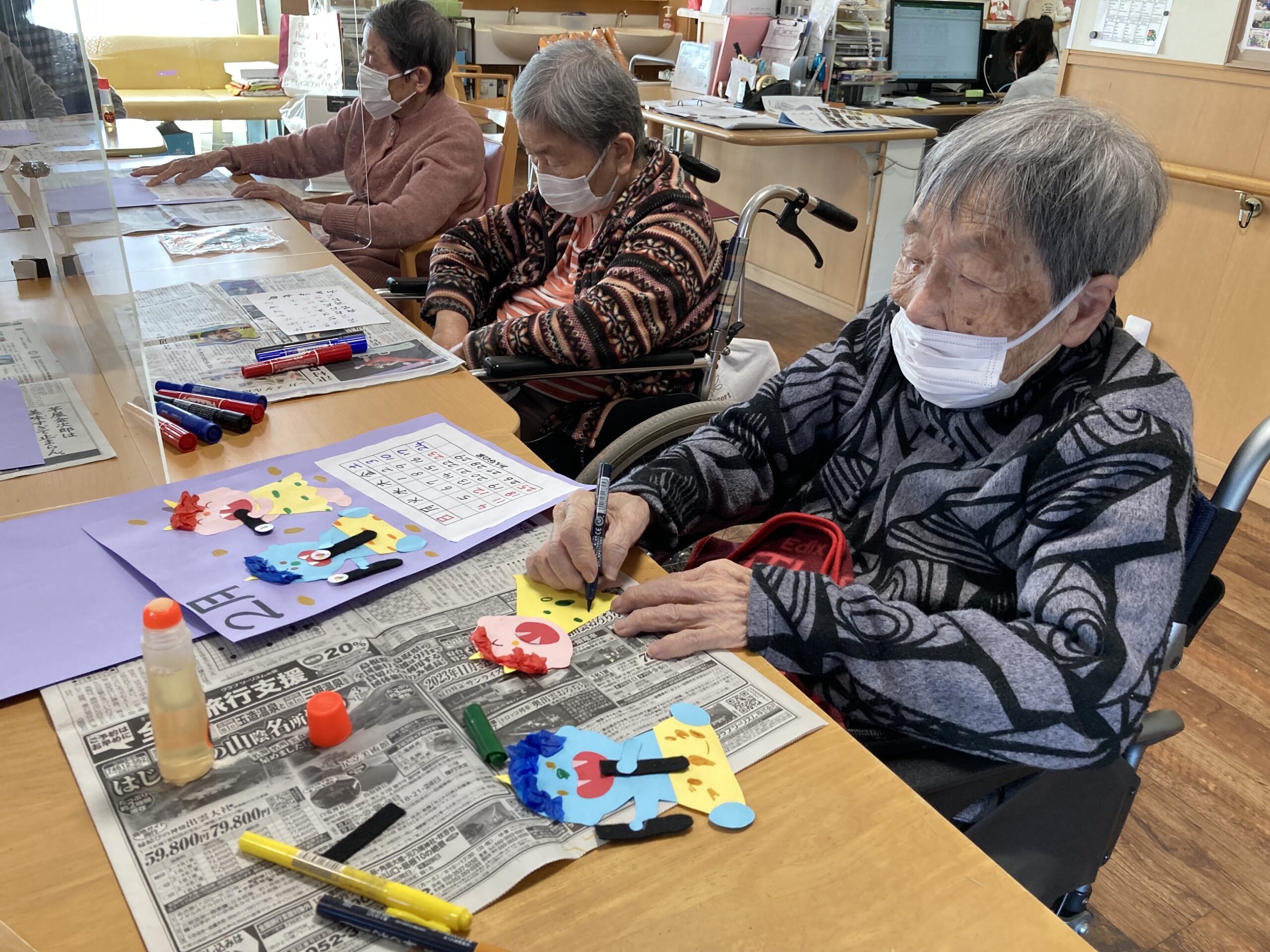 今日から2月となりました。2月といえば『節分』がありますよね!ということで、今月のカレンダーは鬼が恵方巻を食べています。鬼の顔をペンで書いたり、花紙で髪の毛をはったり、パンツの模様をかいたりと皆さん真剣に取り組まれていました。恵方巻の海苔の部分はフェルトで表現しました。完成すると、皆さん顔やパンツのもようがそれぞれで「可愛い~」と喜ばれていました。
