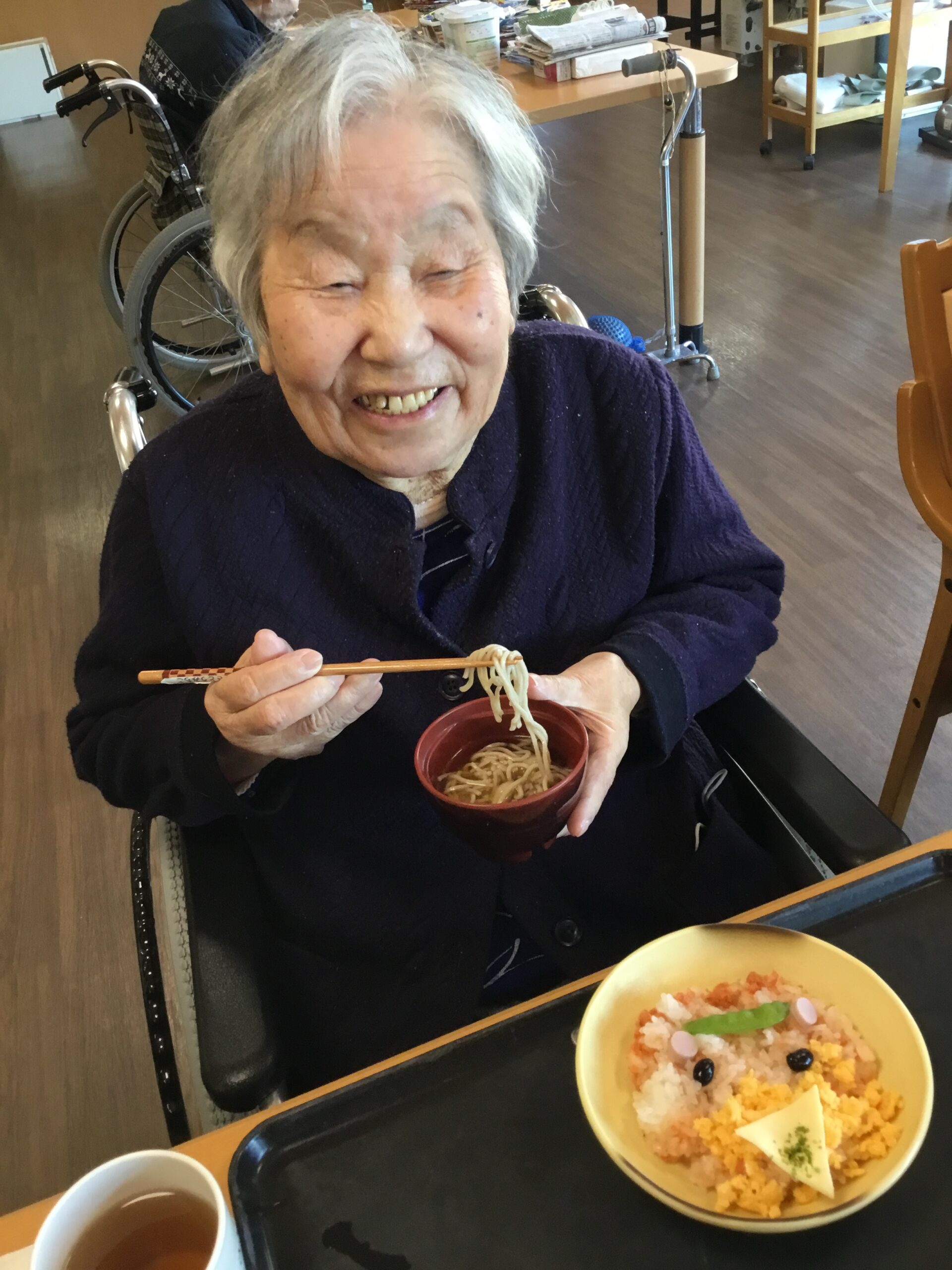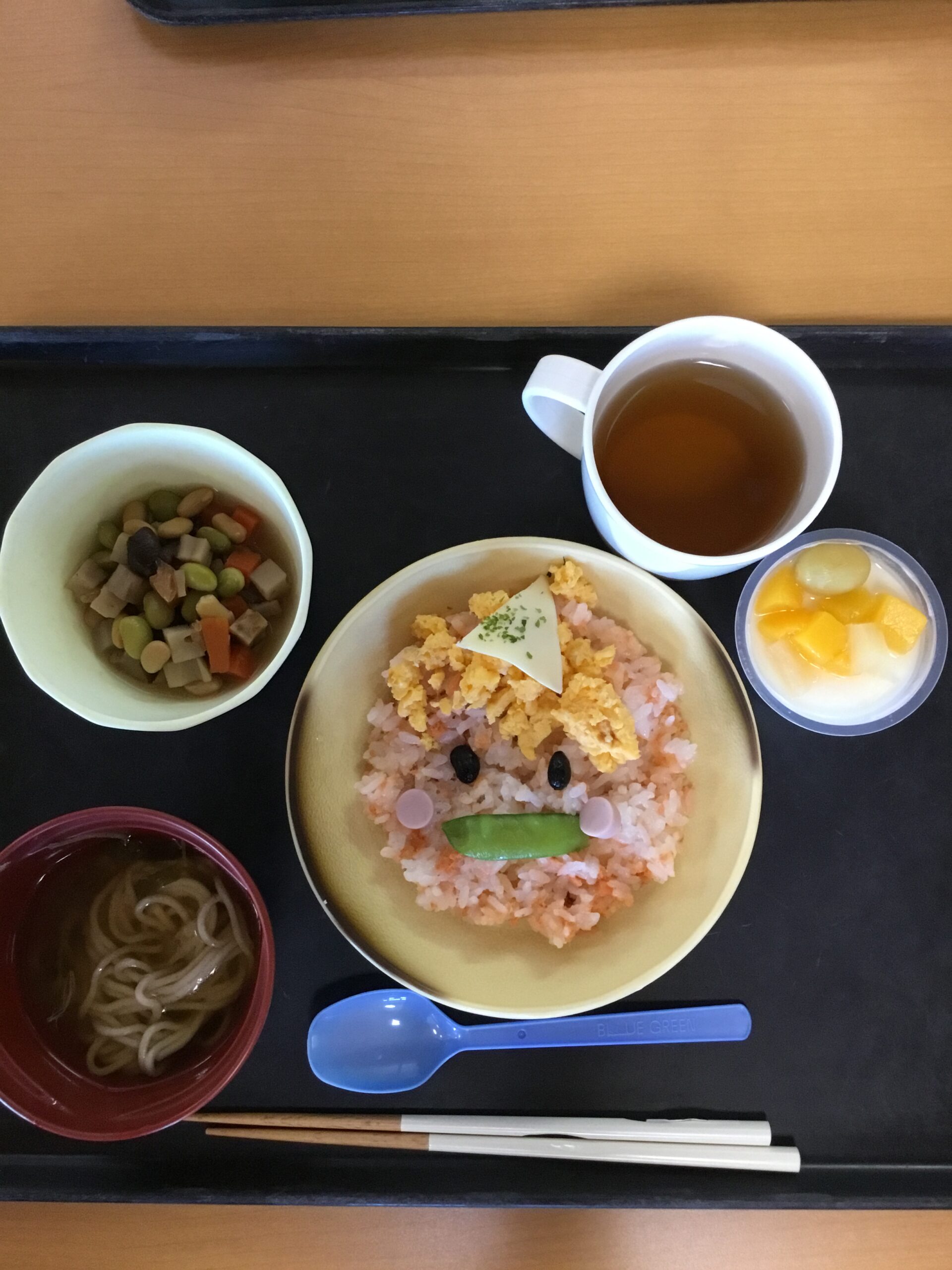 今日は2月3日、節分の日。メニューは五目ちらし、煮豆、一口けんちんそば、白いプリンになります。鬼の顔になった五目ちらしが可愛くて食べるのがもったいない気持ちになりました。15時のおやつには、鬼饅頭を頂きました。