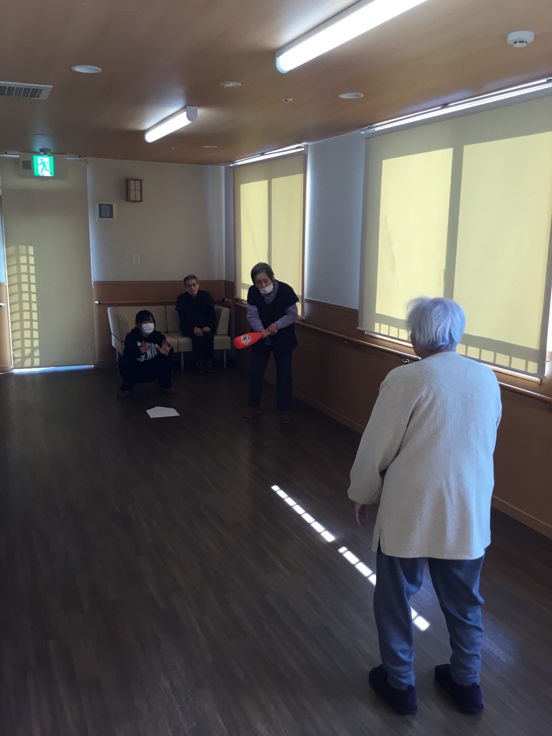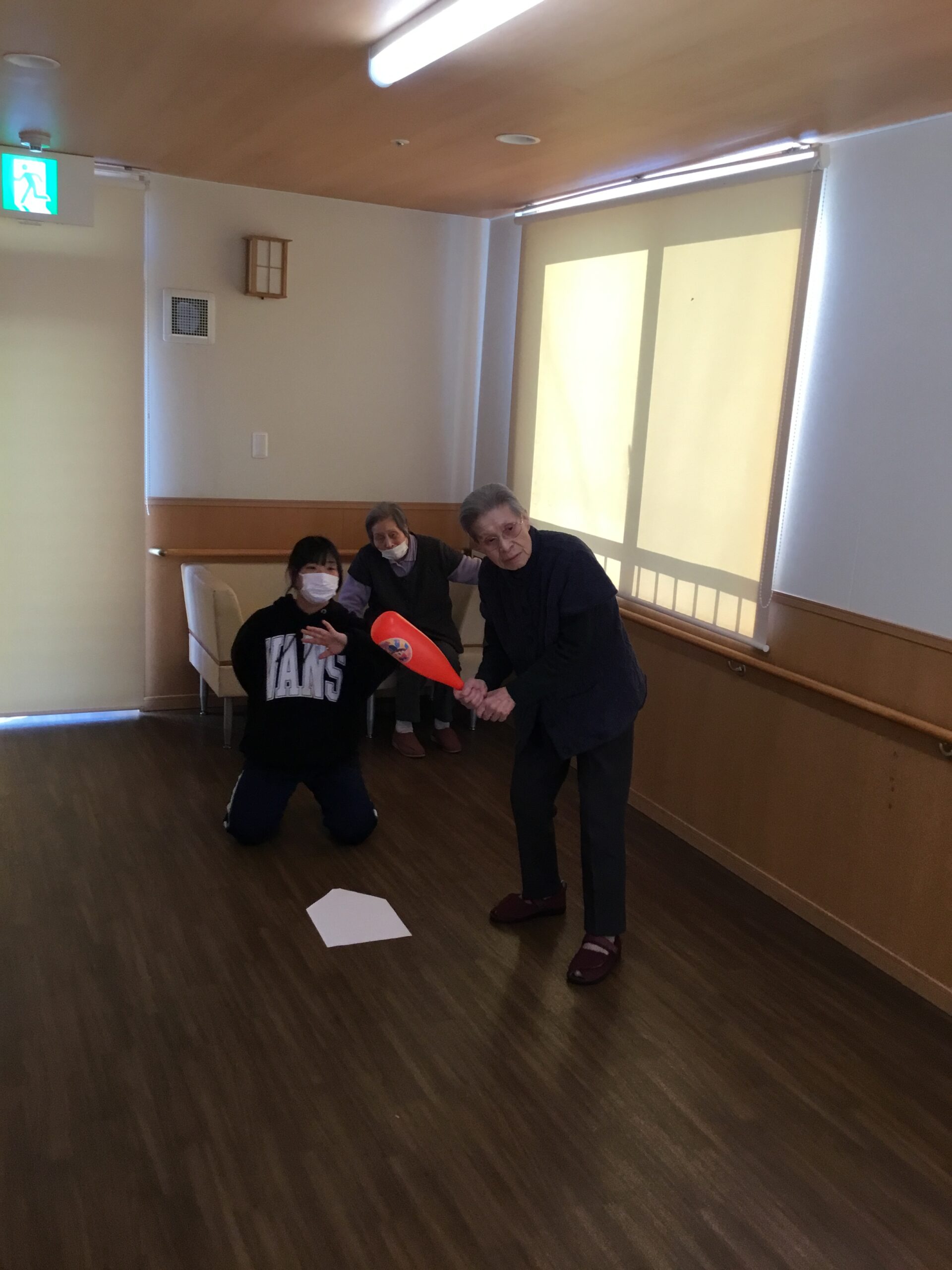 こんにちは、今日は館内で野球をしました。「学生時代はソフトボールをしてました」と言われる利用者様とスタッフで対戦です。ボールとバットを握ると92歳とは思えない元気な身のこなしで投げたり打ったりと楽しく身体を動かす事が出来ました。