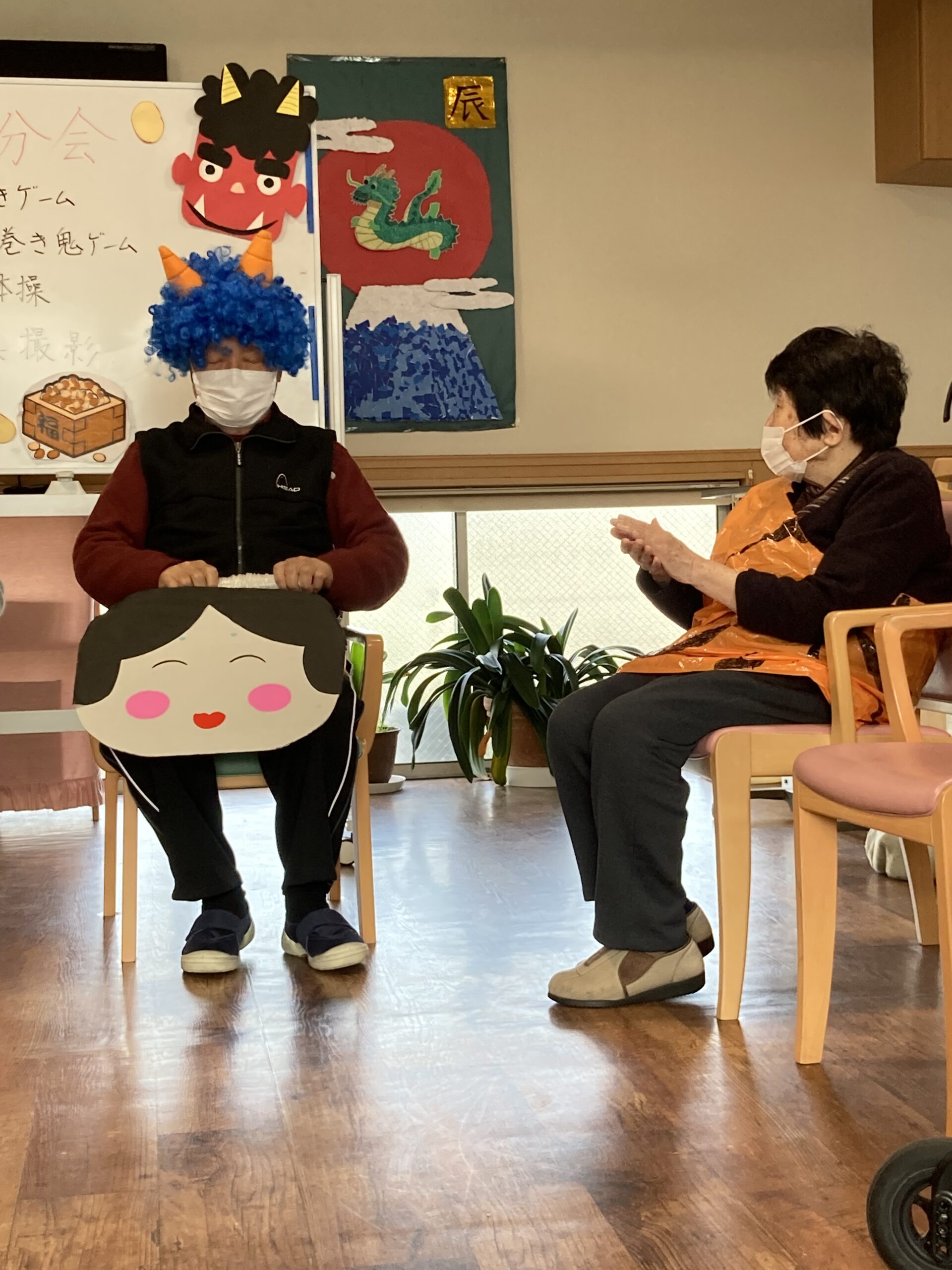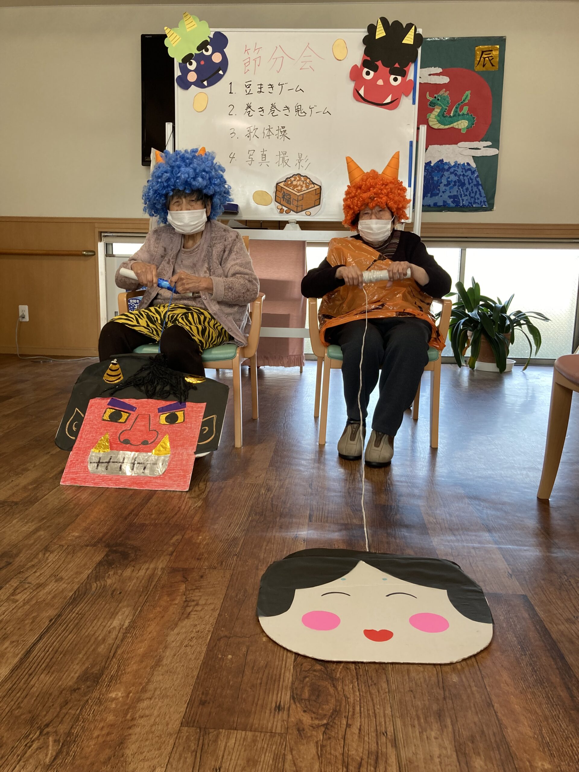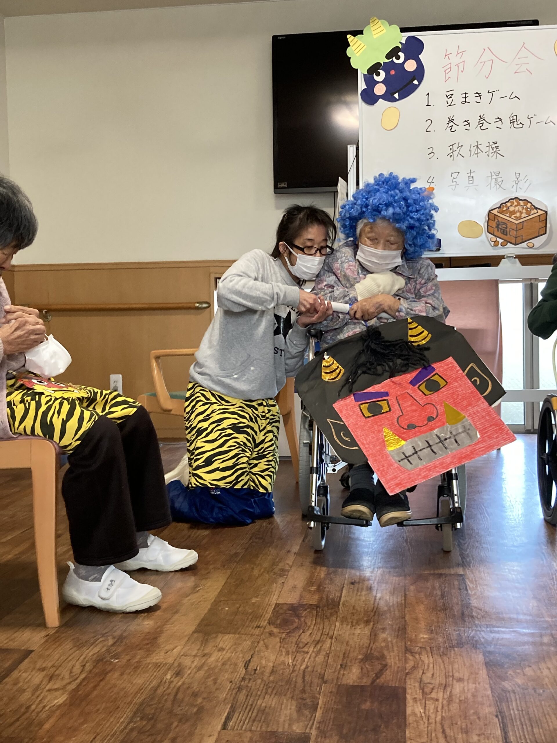3日、鬼の衣装で『節分会』を行いました。巻き巻き鬼ゲームでは、手元のヒモを一生懸命に巻いて鬼やお多福を引き寄せることが出来き、また、順番待ちをされている方は「○○さんがんばってー」や「もう少し!」と声援を送られていました。豆まきゲームでは「鬼はーそと」「福はーうち」の掛け声でお手玉をなげ、上手く鬼に当てられず残念がる様子が見られましたが、鬼に当て、見事、お多福の顔が見られたときは「やったー!」と笑顔が見られました。