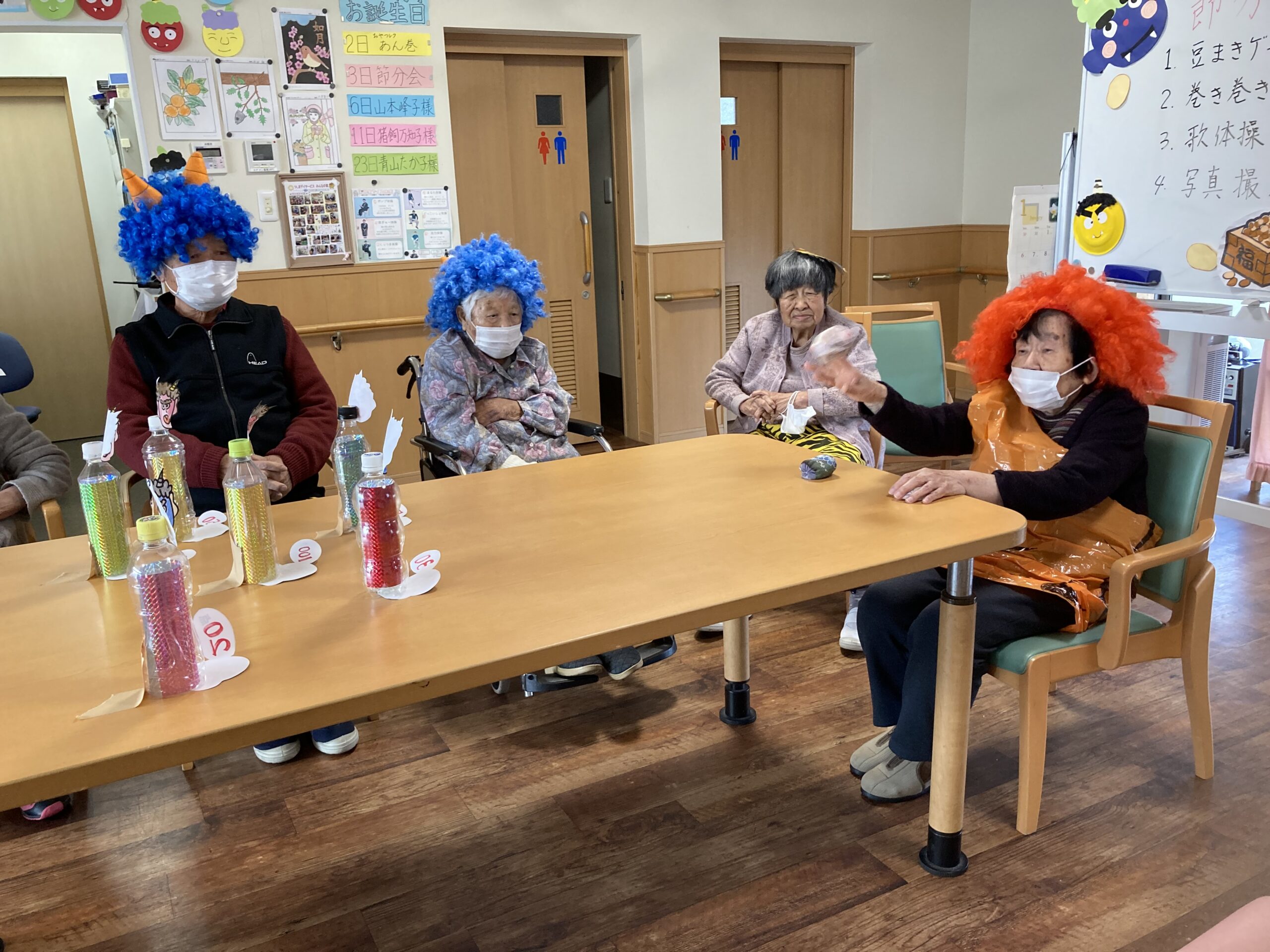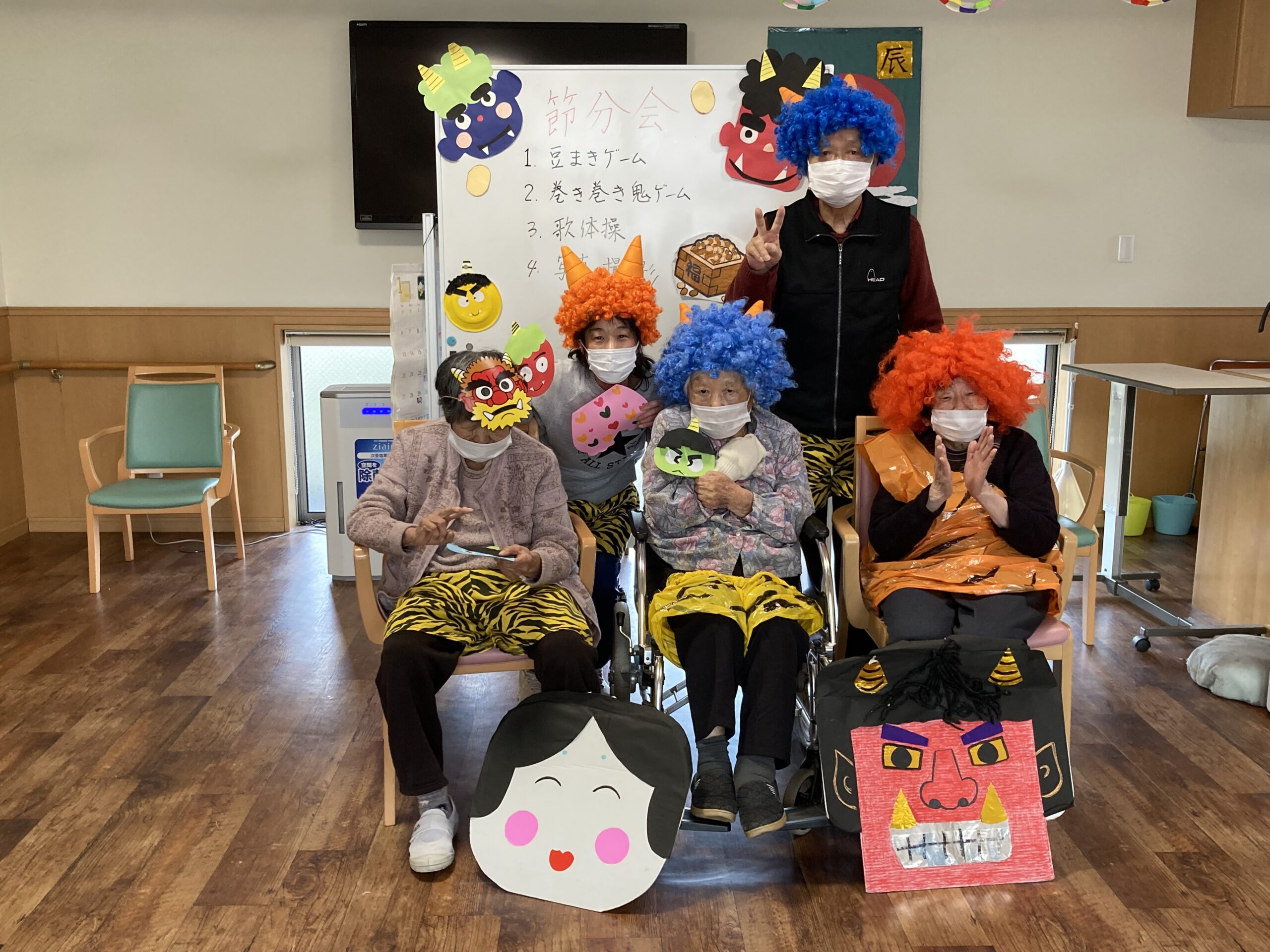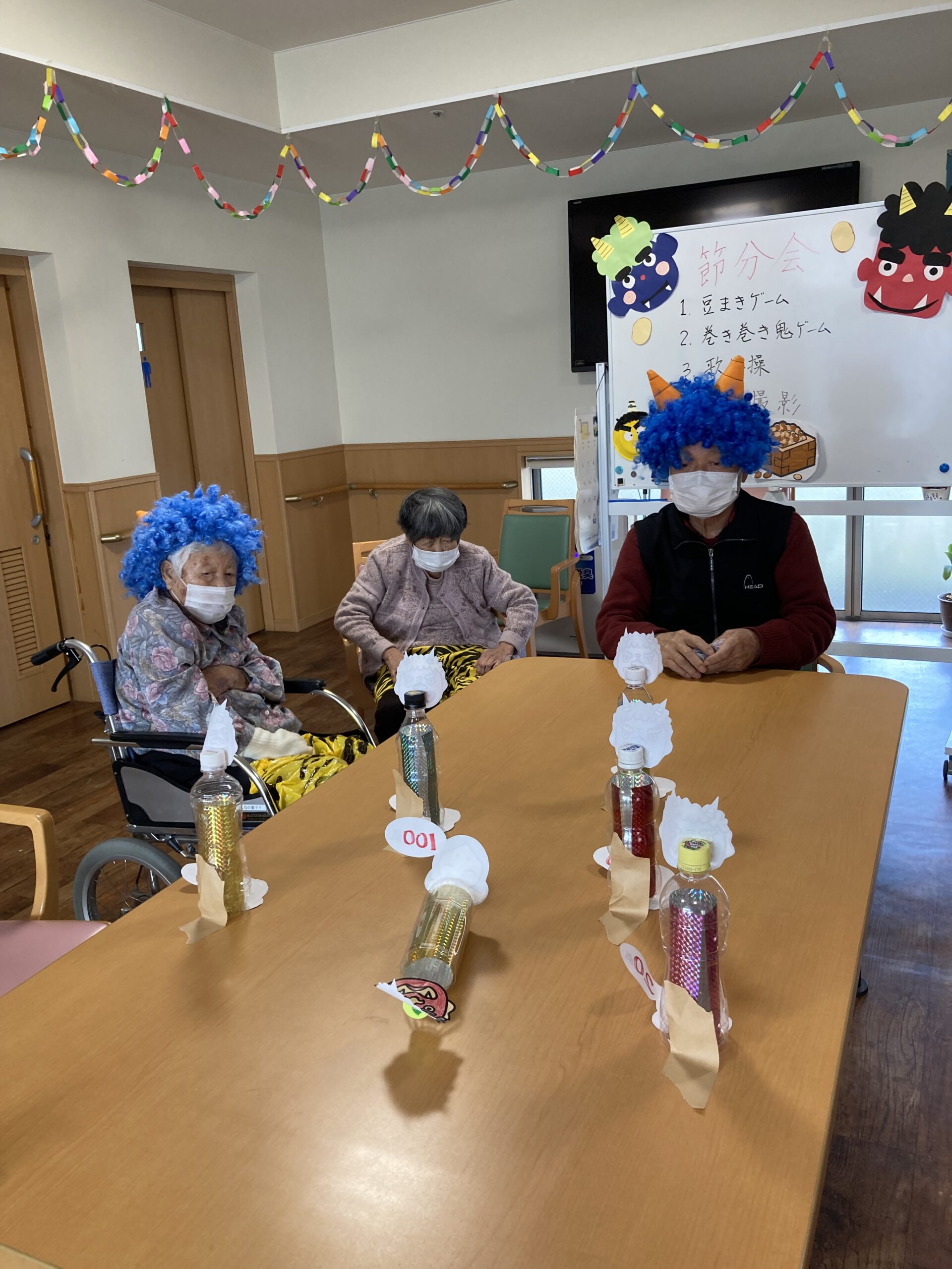 3日、鬼の衣装で『節分会』を行いました。巻き巻き鬼ゲームでは、手元のヒモを一生懸命に巻いて鬼やお多福を引き寄せることが出来き、また、順番待ちをされている方は「○○さんがんばってー」や「もう少し!」と声援を送られていました。豆まきゲームでは「鬼はーそと」「福はーうち」の掛け声でお手玉をなげ、上手く鬼に当てられず残念がる様子が見られましたが、鬼に当て、見事、お多福の顔が見られたときは「やったー!」と笑顔が見られました。