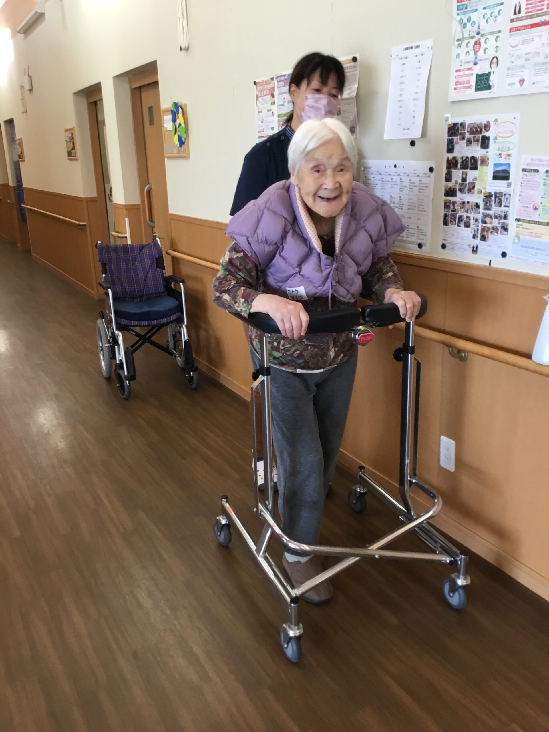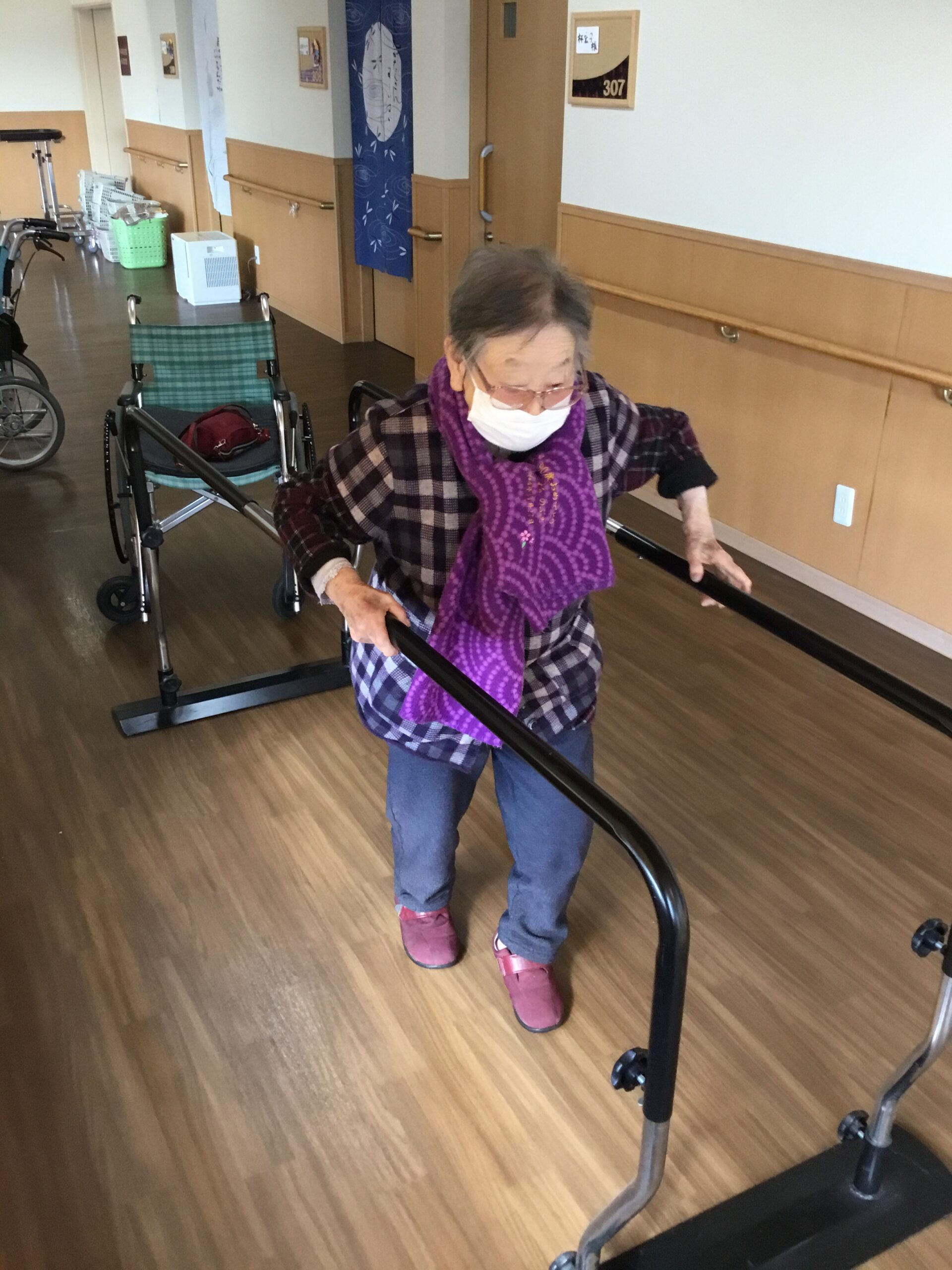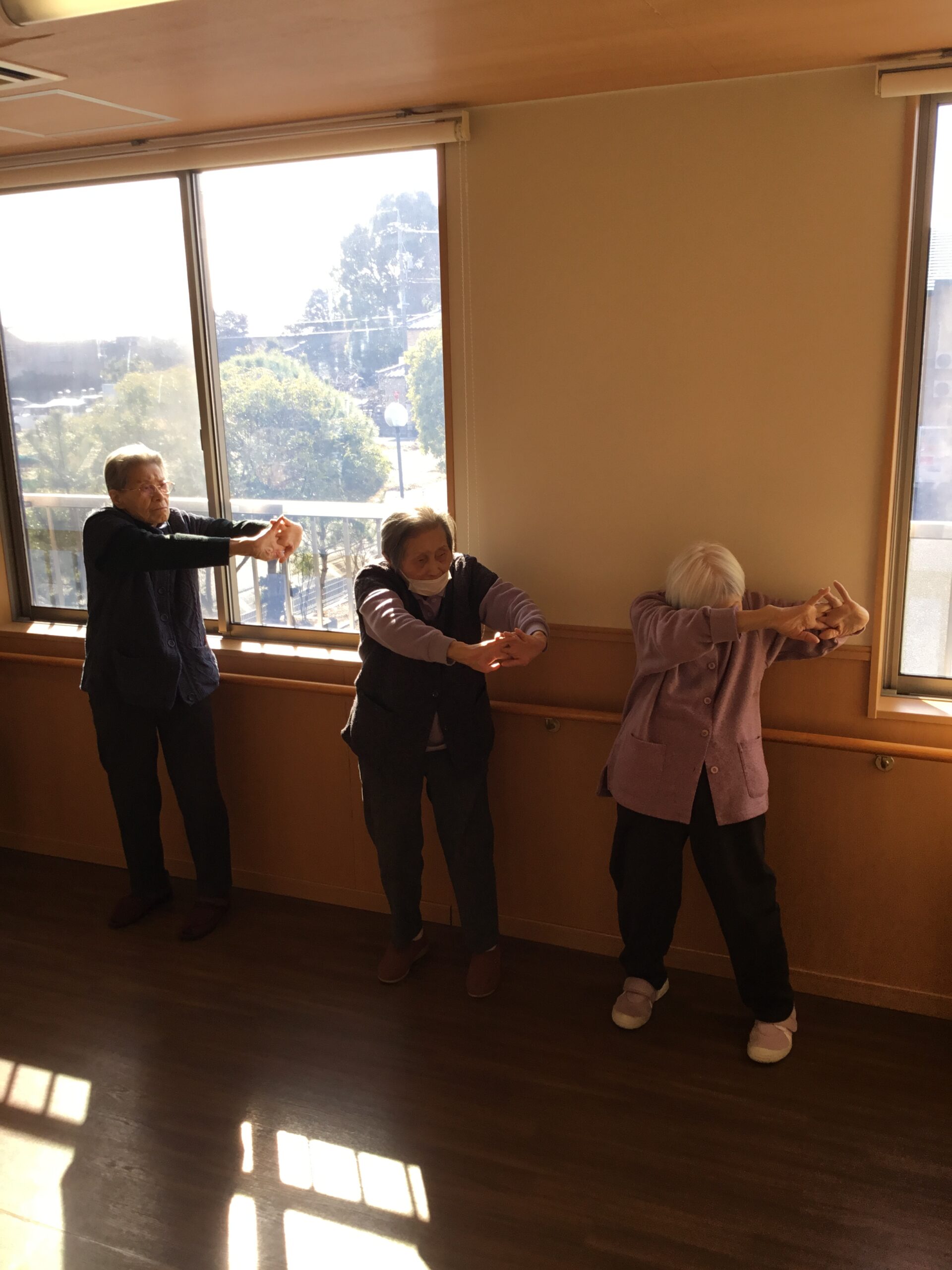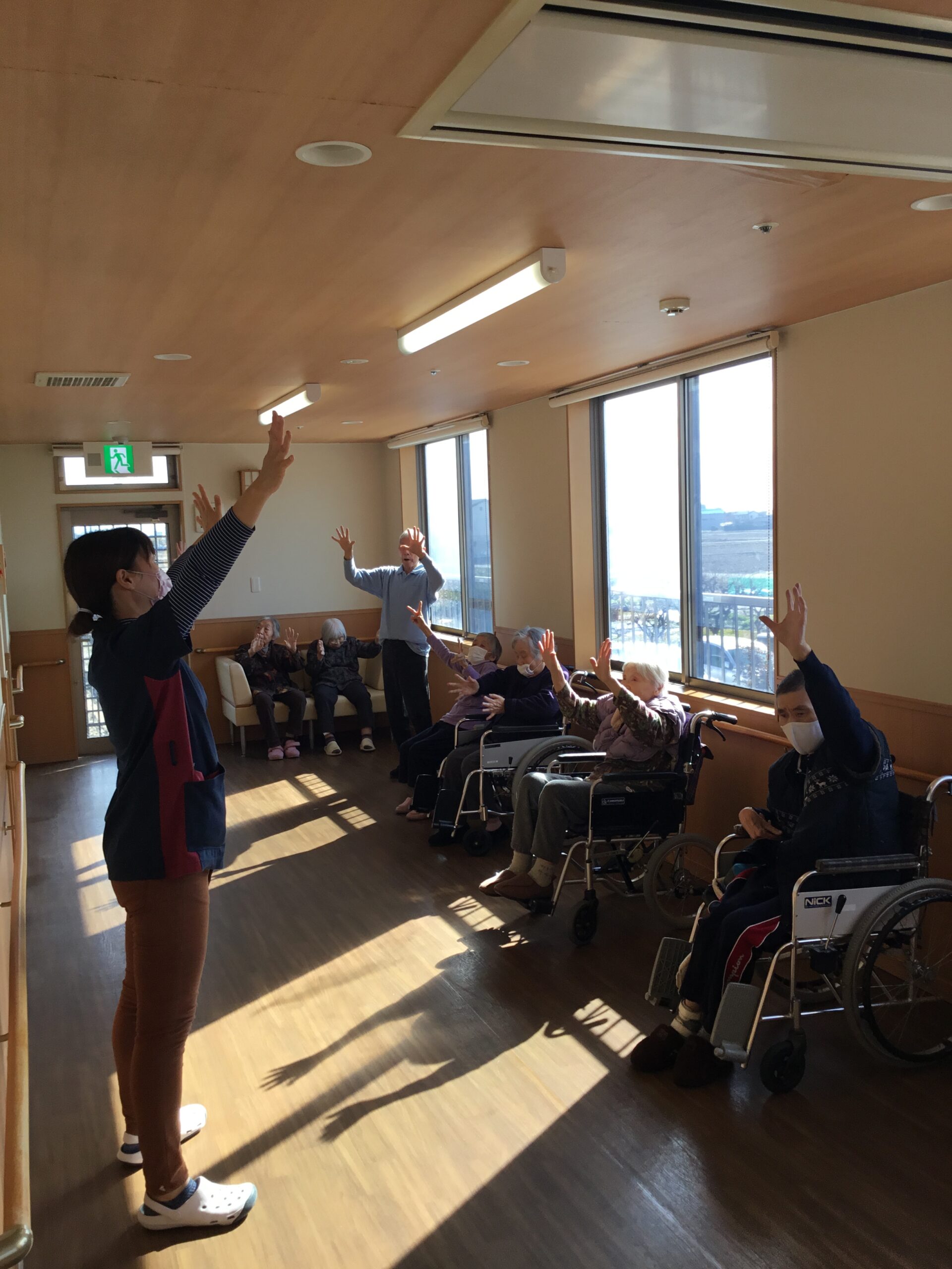 こんにちは、今日も朝から皆さんで機能訓練を行いました。集団での体操や歩行訓練、高齢者の方々が健康的で活動的な生活を送る為には大切な訓練になります。