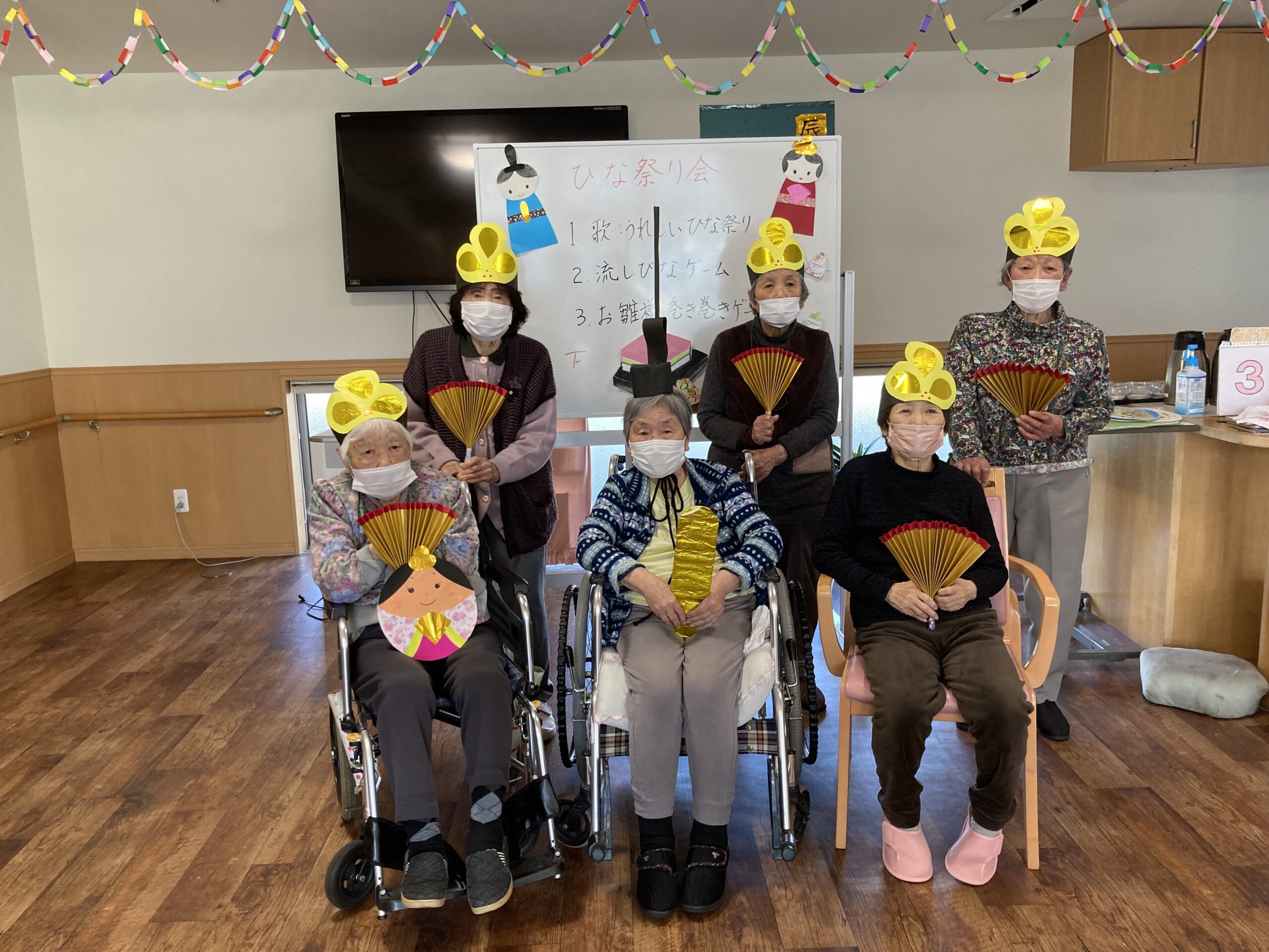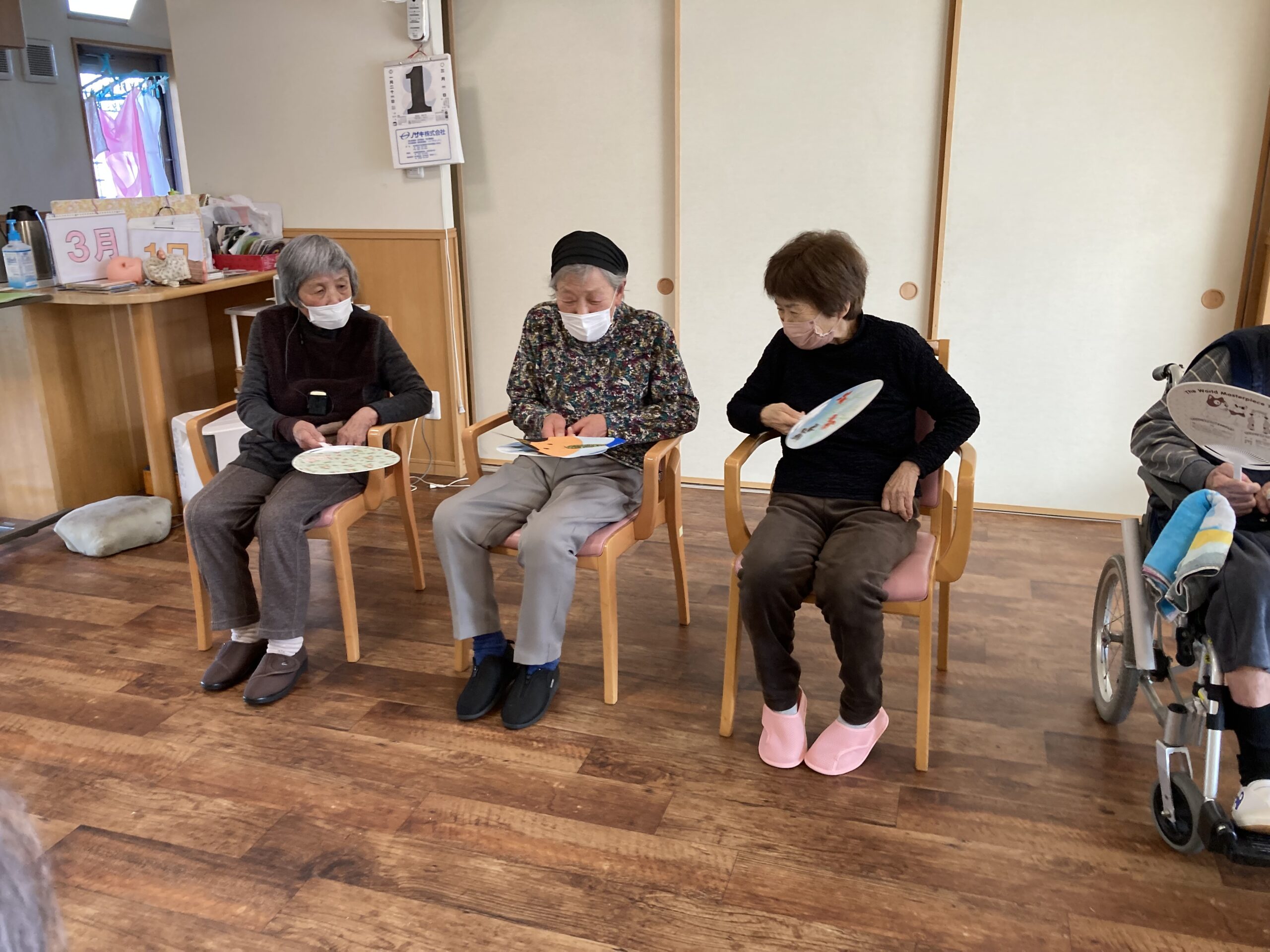 3月と言えば「ひな祭り!」。ひな祭り会を行いました。歌「うれしいひな祭り」を皆さんで歌い、その後ゲームを楽しまれました。流しびなゲームでは、お雛様チームとお内裏様チームに分かれそれぞれ、うちわでお雛様とお内裏様を運び、競争しました。僅差でお雛様チームが勝ったり、お内裏様チームが勝ったり・・・結果は・・・同点!!一生懸命戦い、終わったあとは、「動いたで暑いわ」と話され、もっているうちわで仰いでいました。お雛様巻き巻きゲームでは、新聞紙を巻いてコースから外れないように慎重に引き寄せることが出来ました。最後はお手製の冠と扇で写真撮影をし、笑顔が見られました。