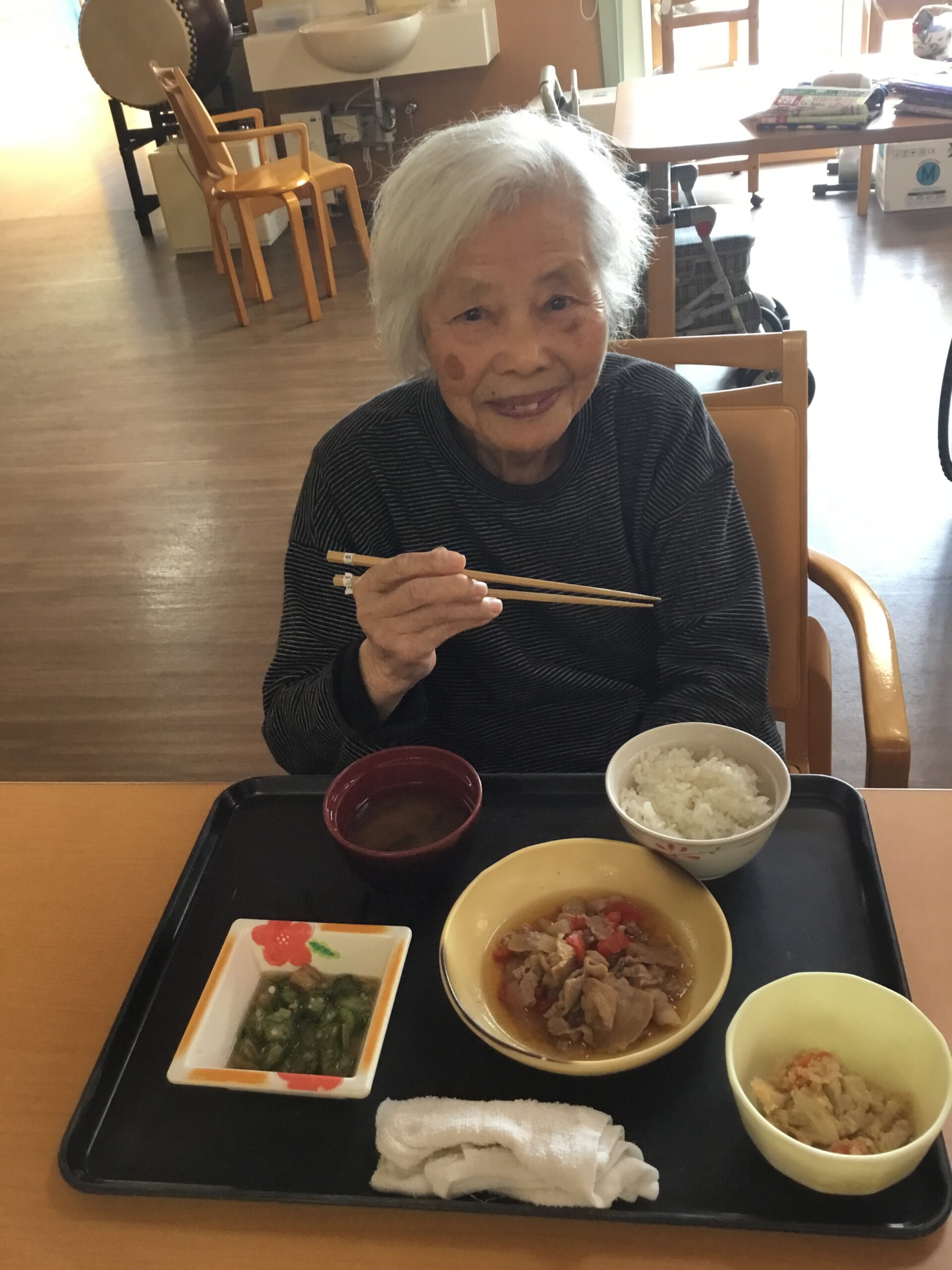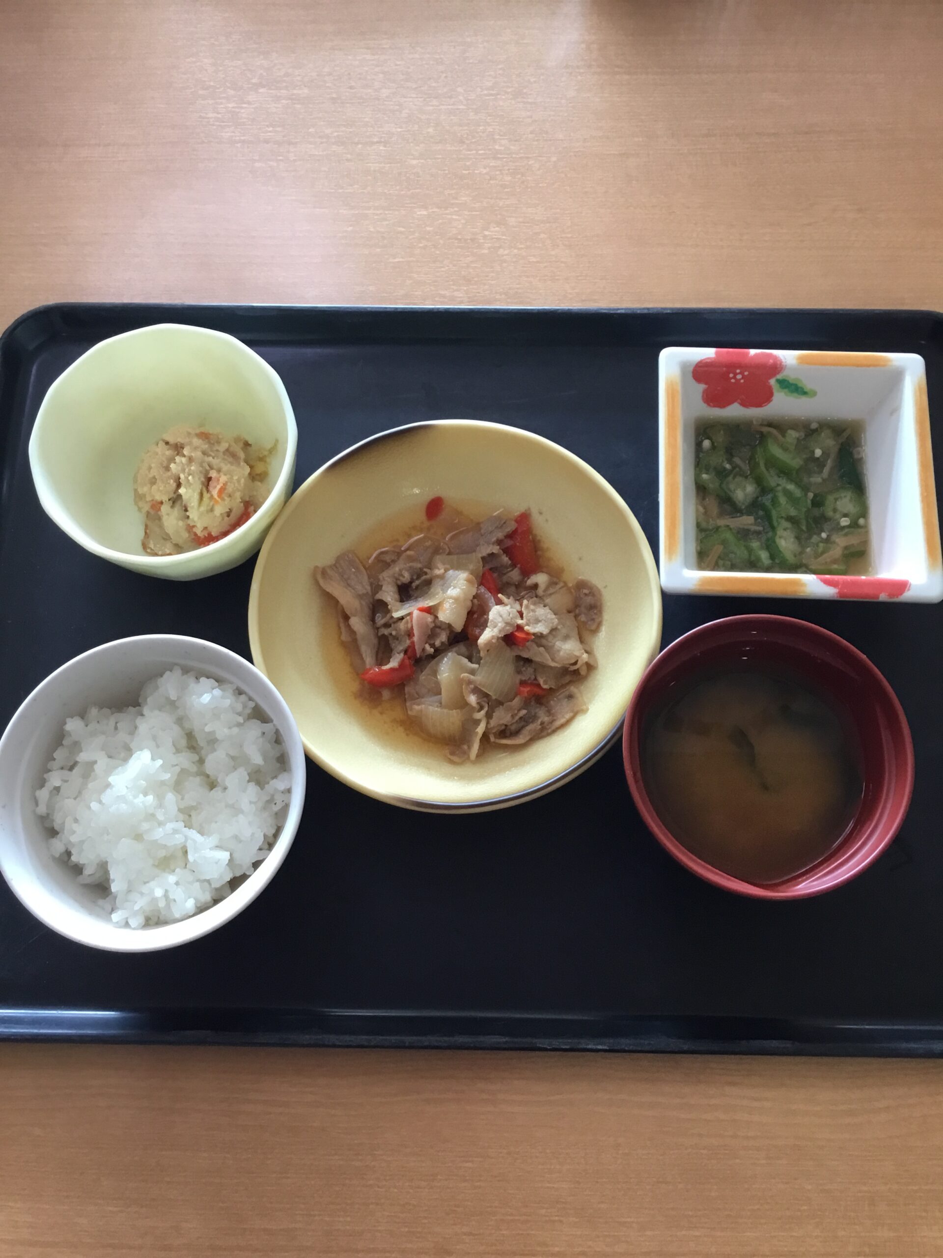 本日の昼食は、ご飯、豚肉の生姜煮、卯の花炒り煮、オクラおろし、味噌汁になります。今日もしっかり食べて午後から元気に体操したいと思います。