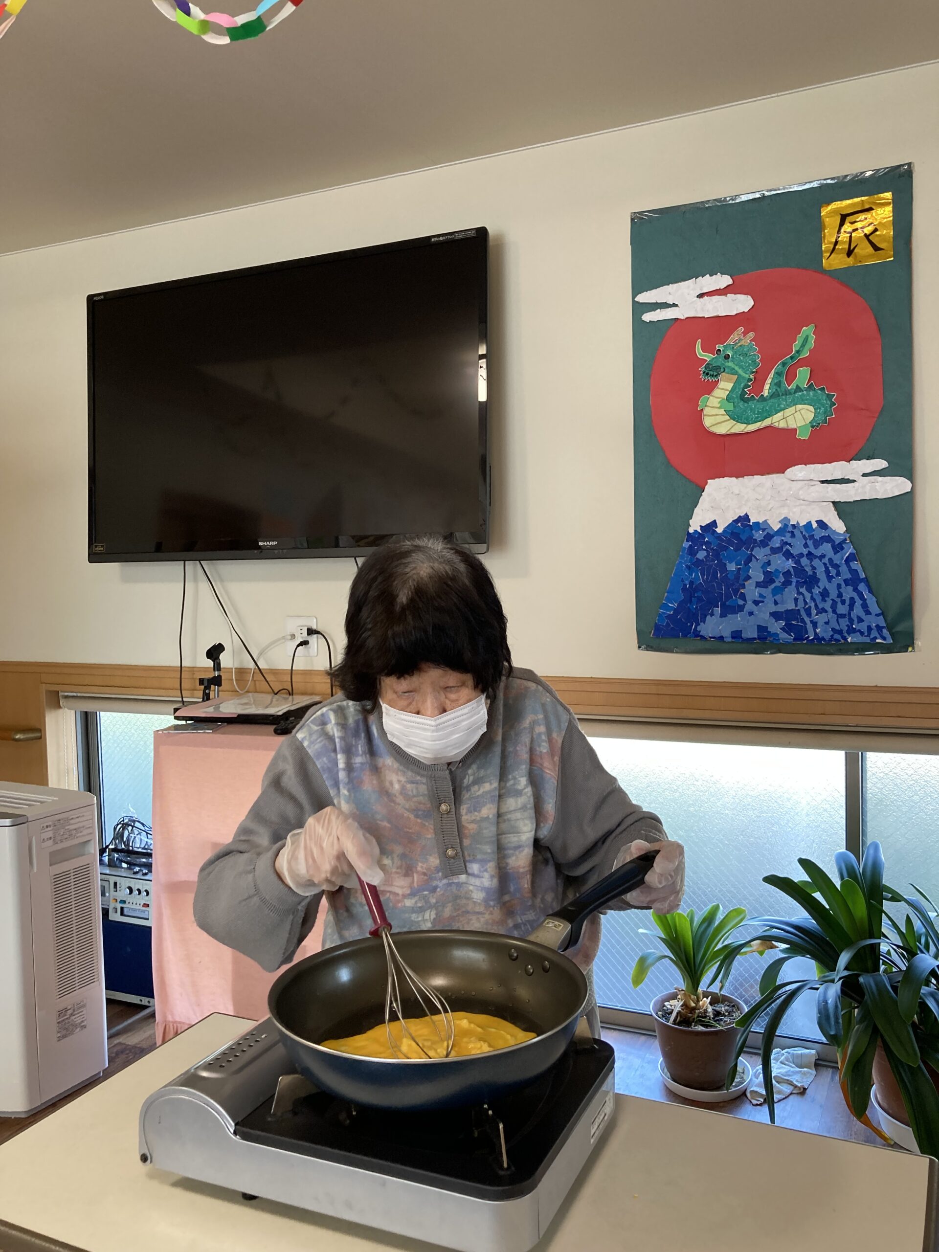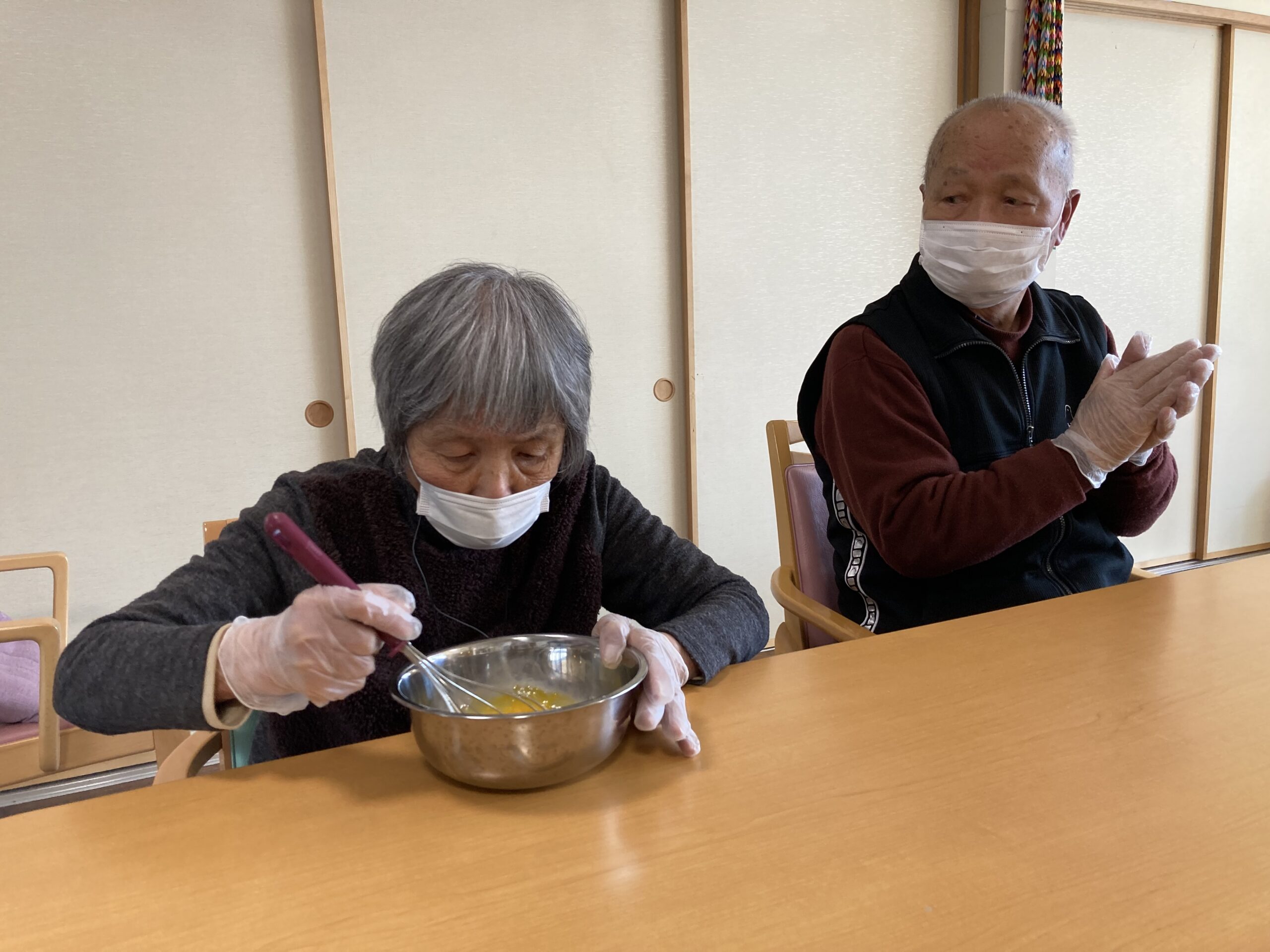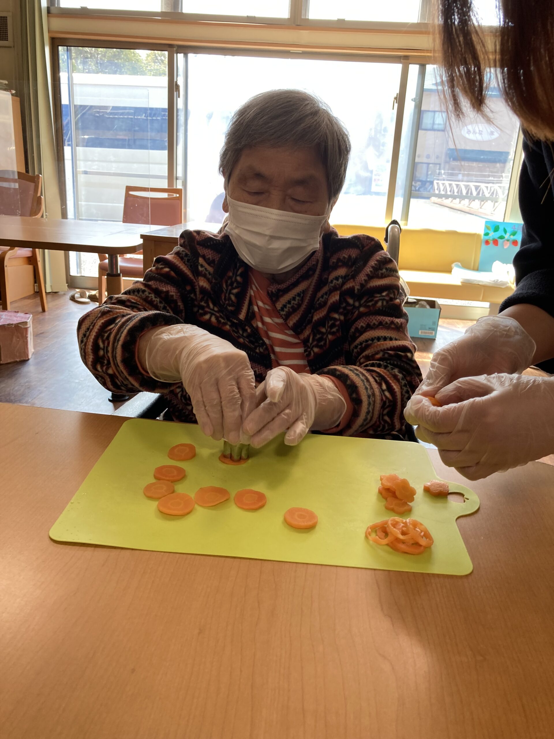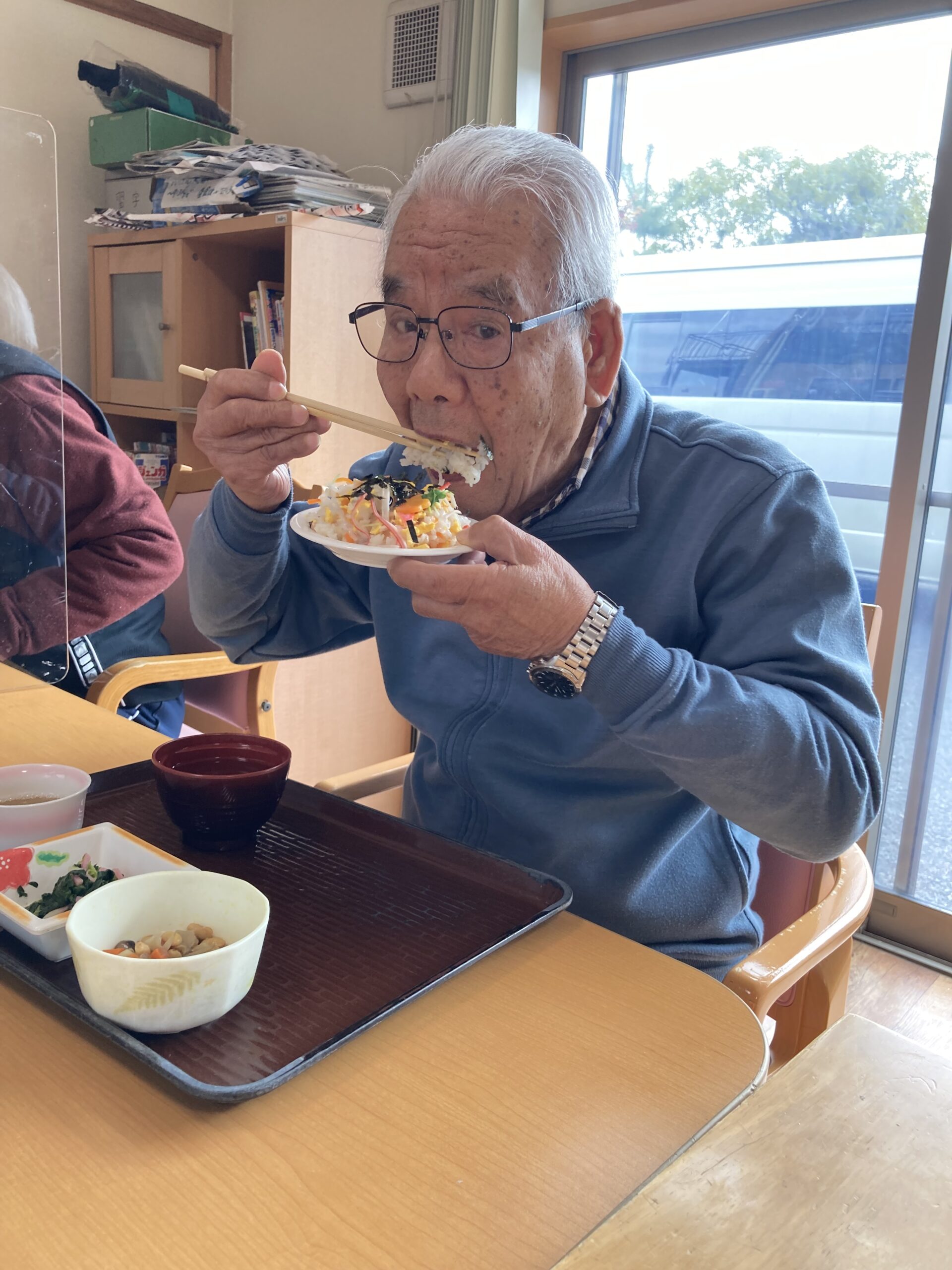 ランチレクリエーションでちらし寿司作りをしました。卵を割って焼いたり、カニカマを割いたり、人参の型抜きをし楽しまれました。具の準備ができ、皆さんで盛り付けをすると「色がきれい」「美味しそう」と笑顔が見られました。昼食時には「美味しくできた」と話され皆さん、完食されました。