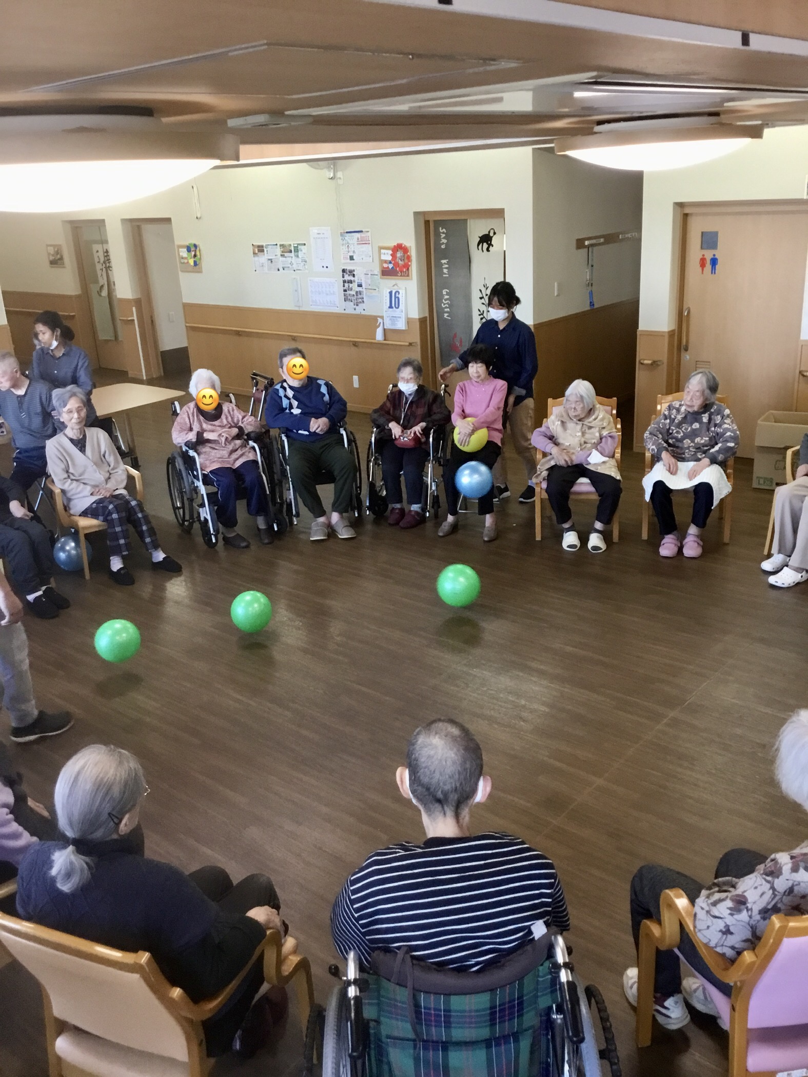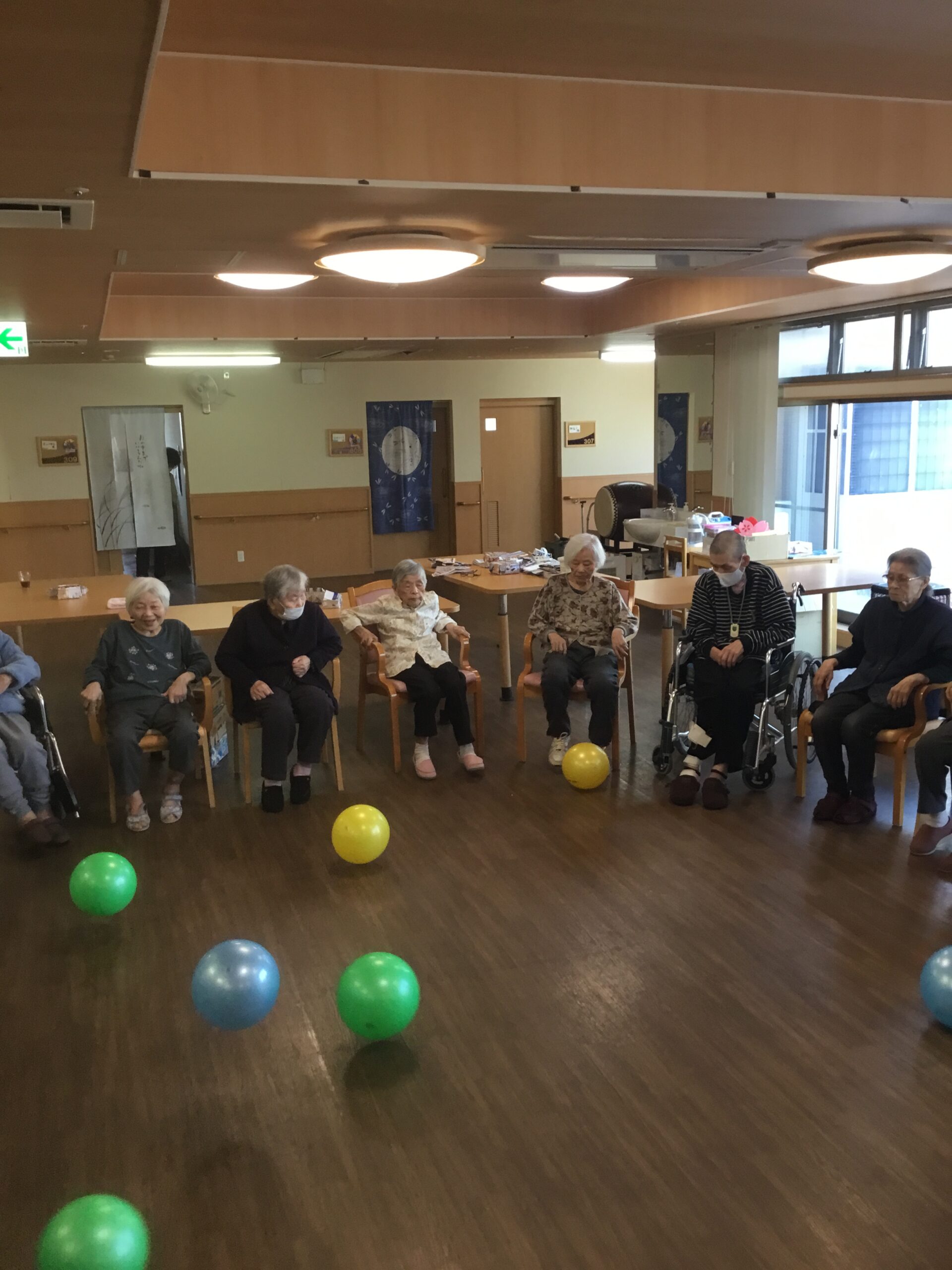 レクリエーションの様子です。今日は皆さんで集まりボールを使って身体を動かしました。他のフロアーの利用者様も一緒に輪になって力いっぱいボールを蹴り上げしっかり運動する事が出来ました。