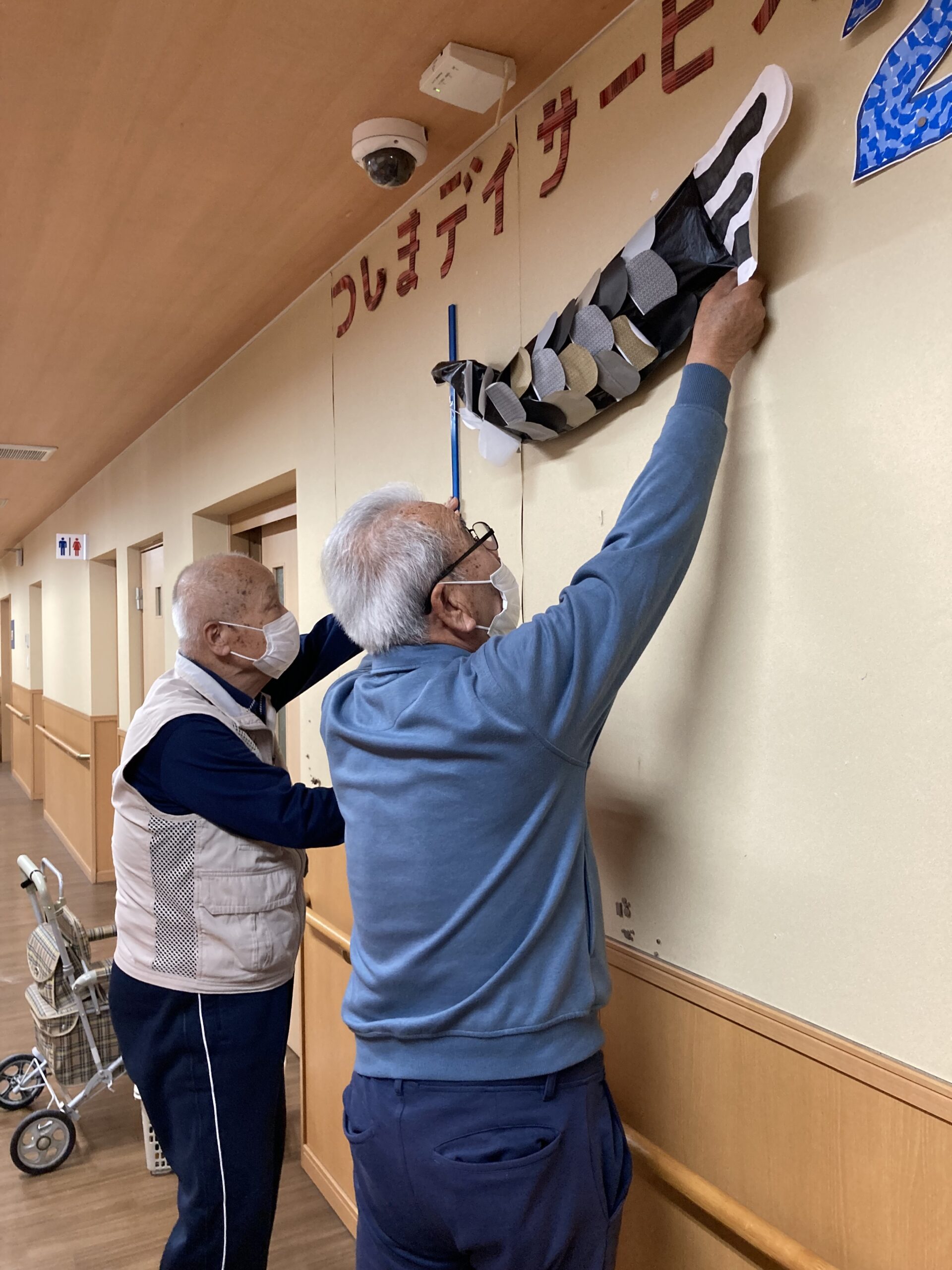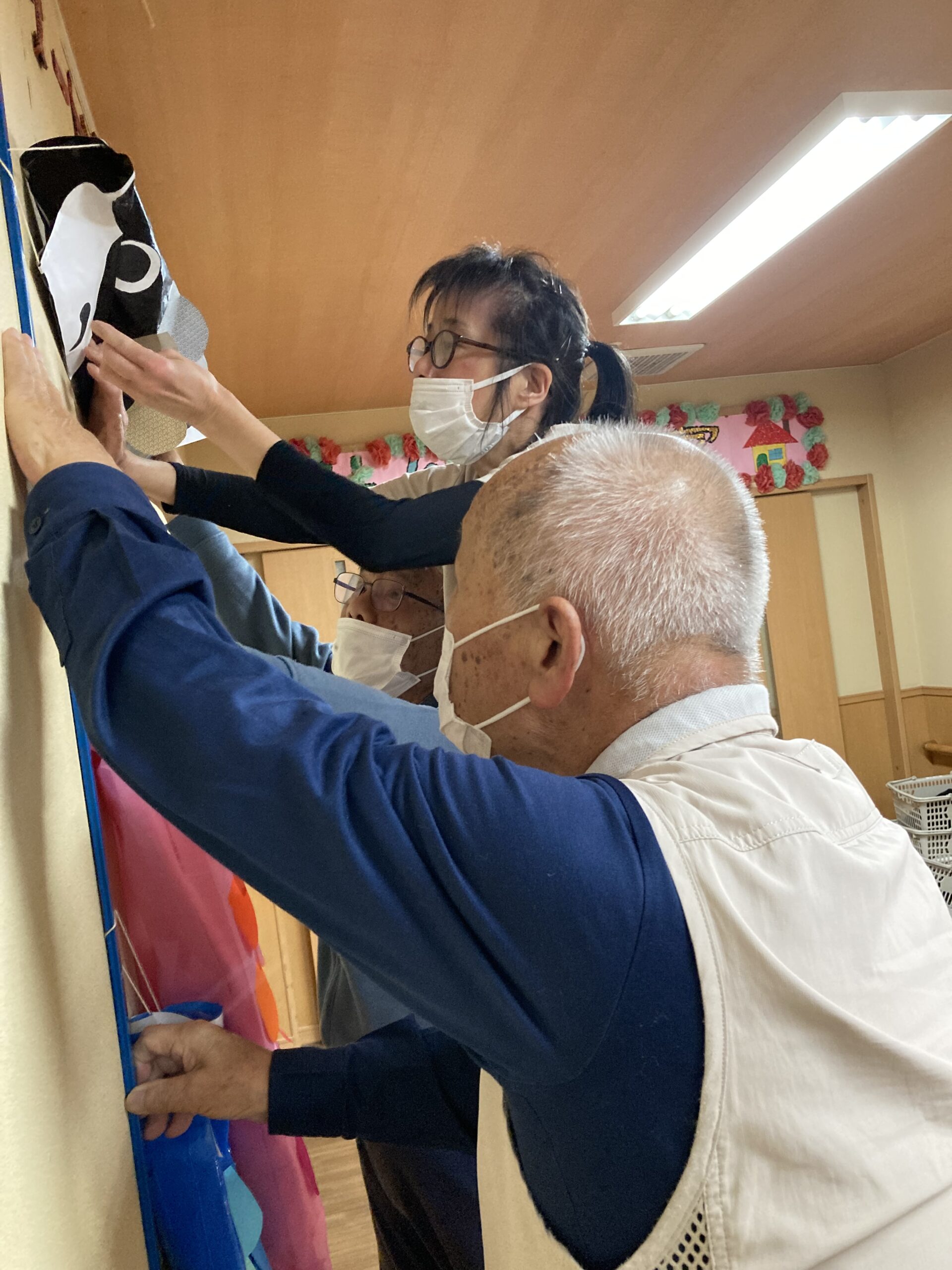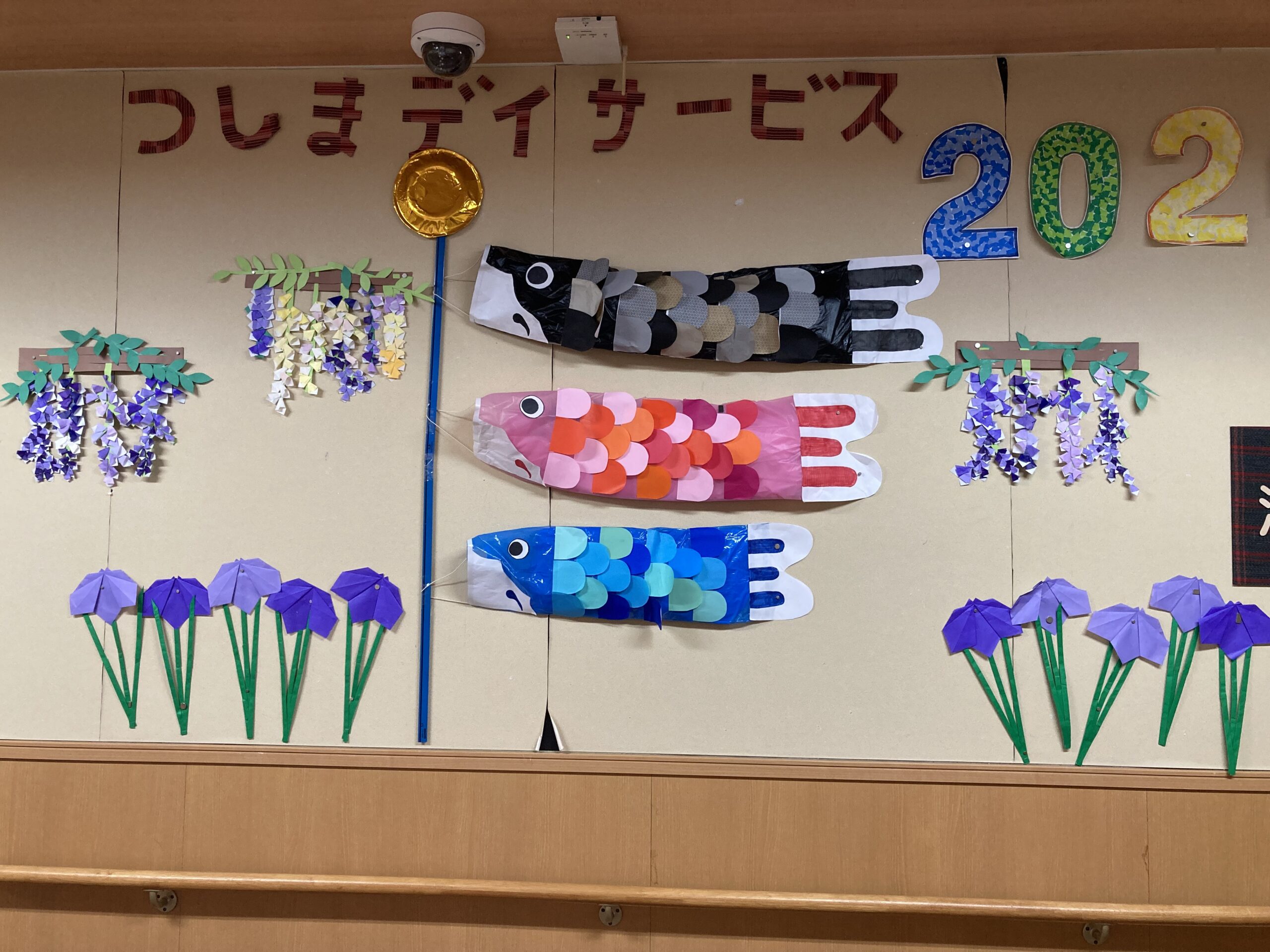 デイサービスの壁面も桜から藤の花や鯉のぼり等に変えました。