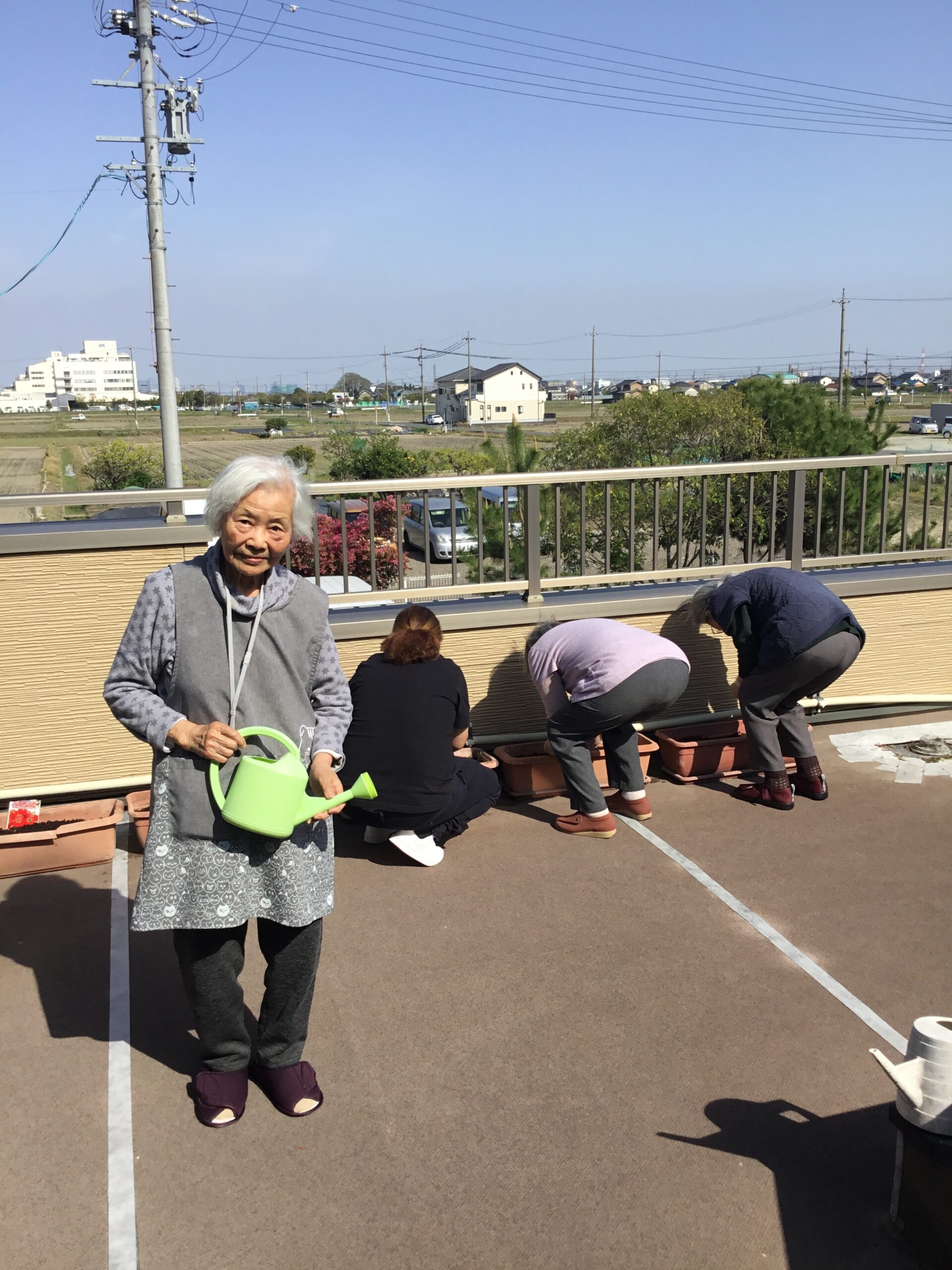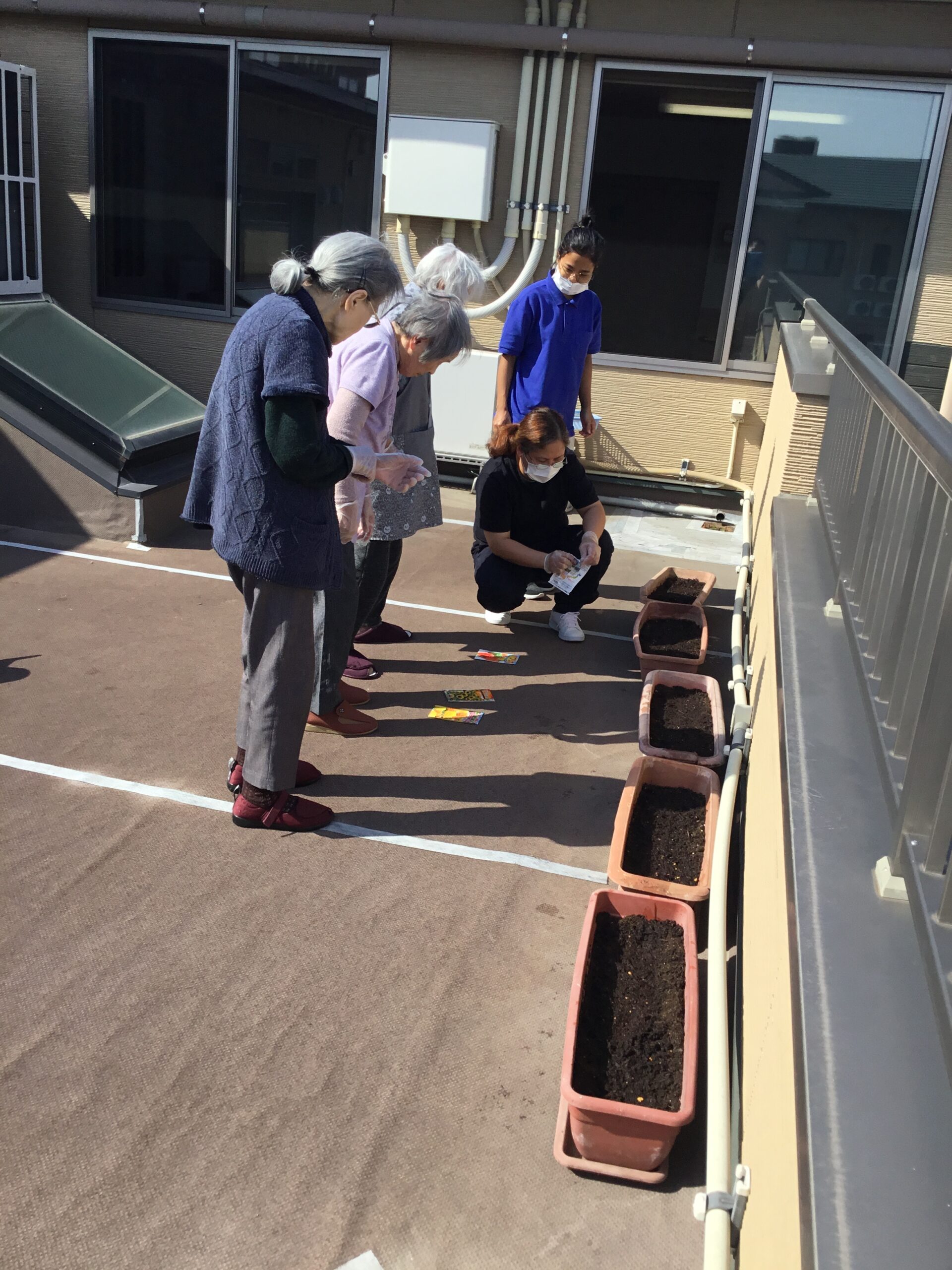 こんにちは、今日は施設のベランダでひまわりや野菜の種を皆さんで一緒に植えました。昔、畑仕事をされていた方のアドバイスを聞きながら楽しく行えました。早く芽が出るのが楽しみです。