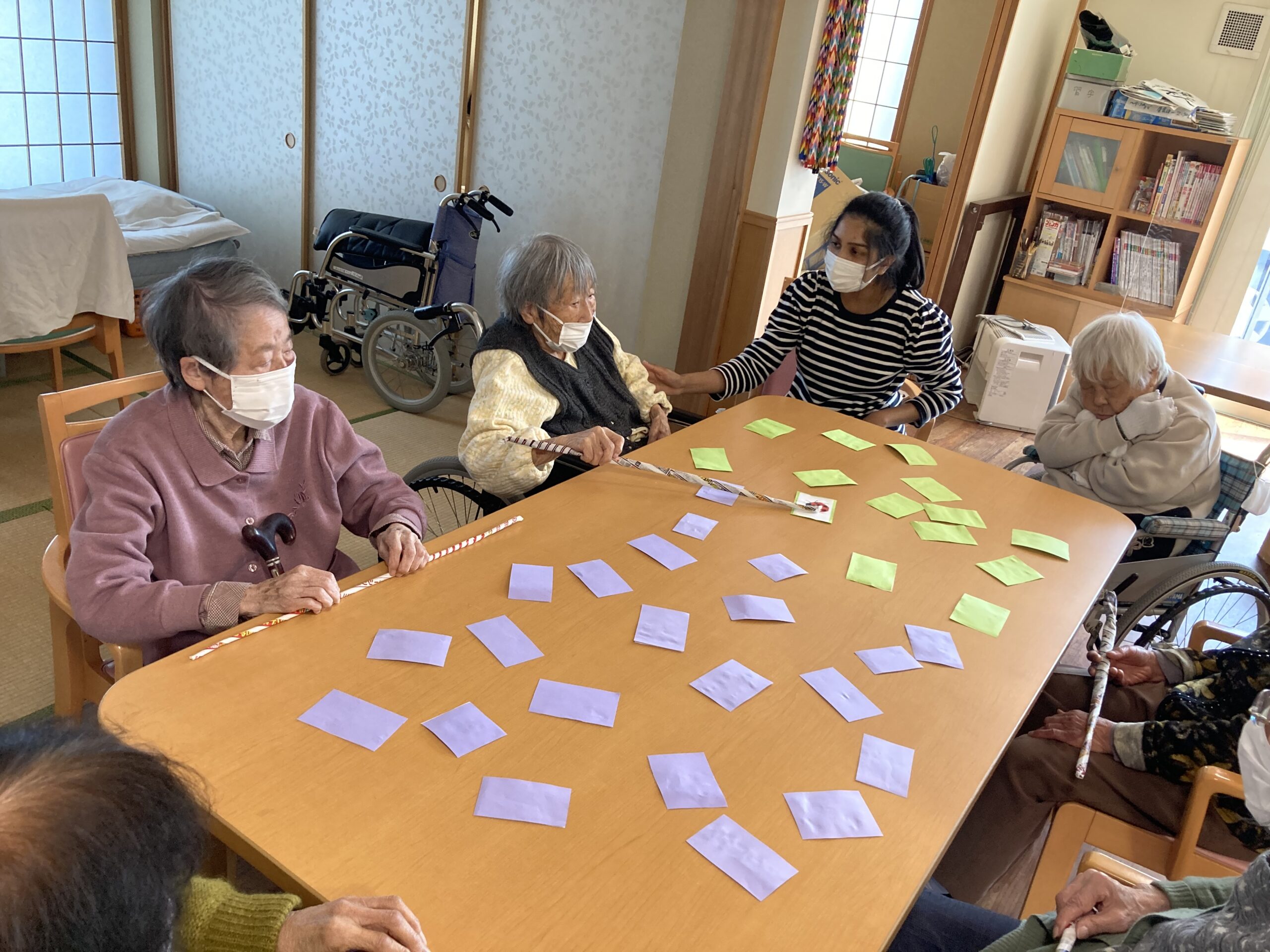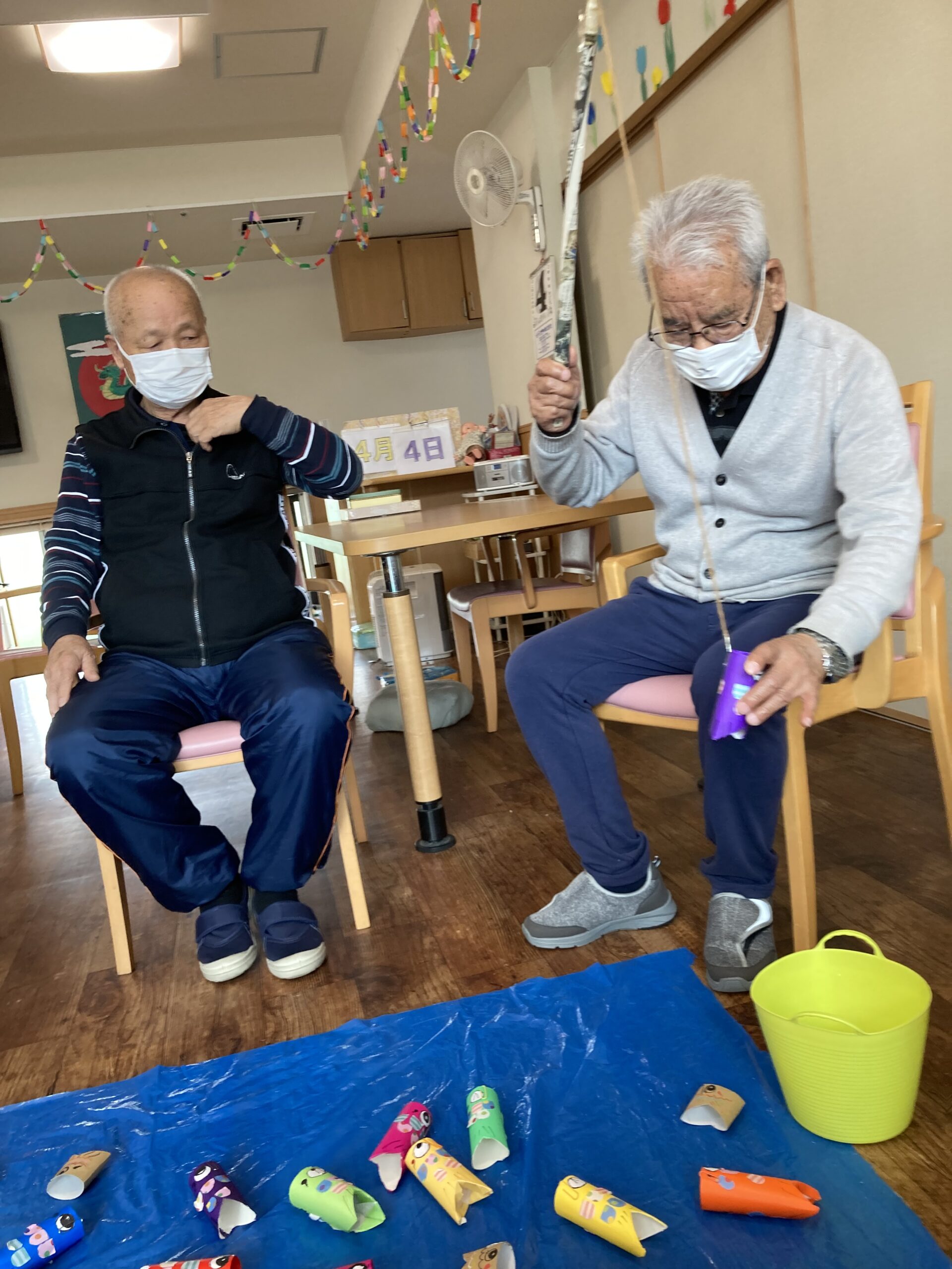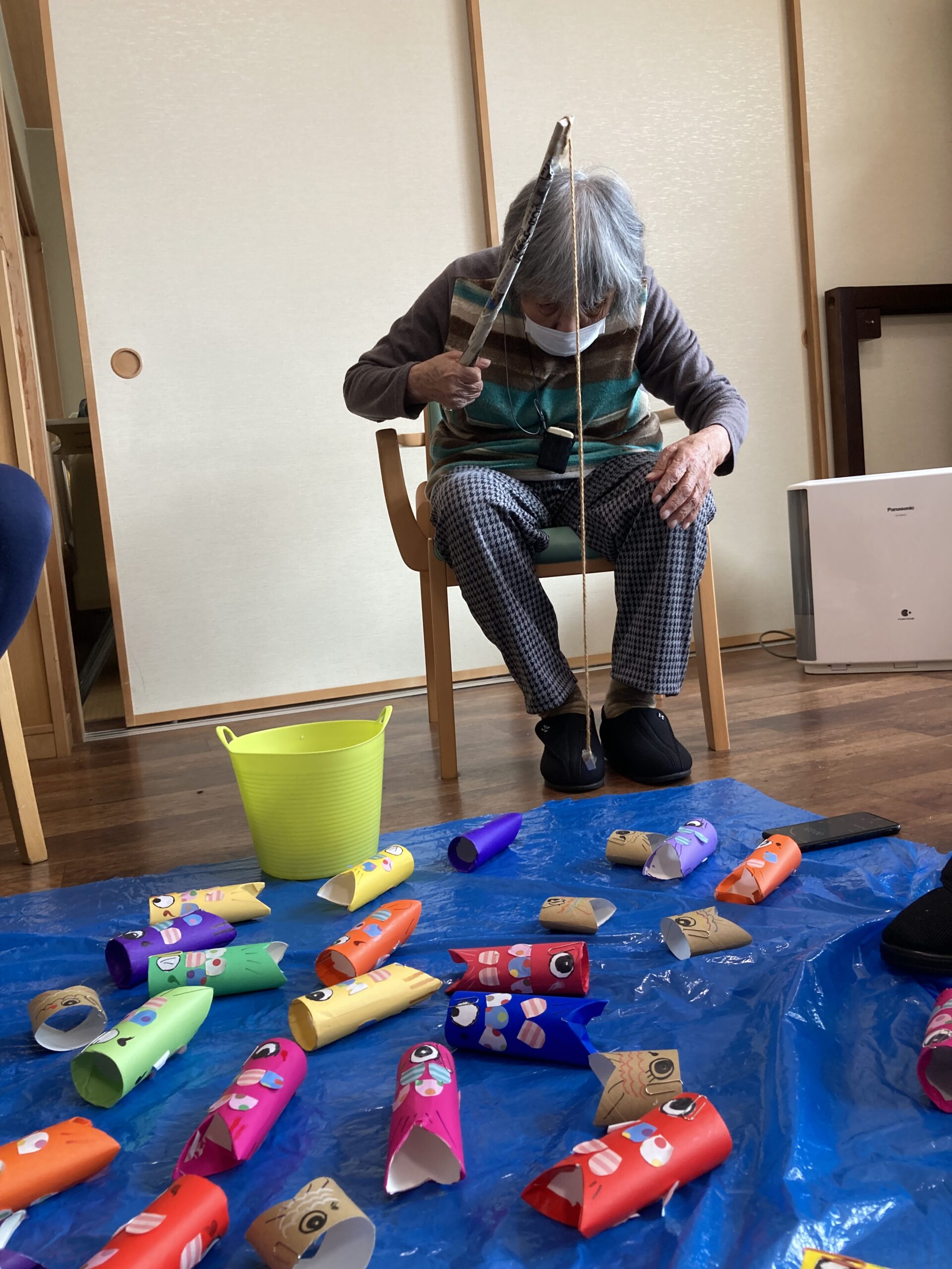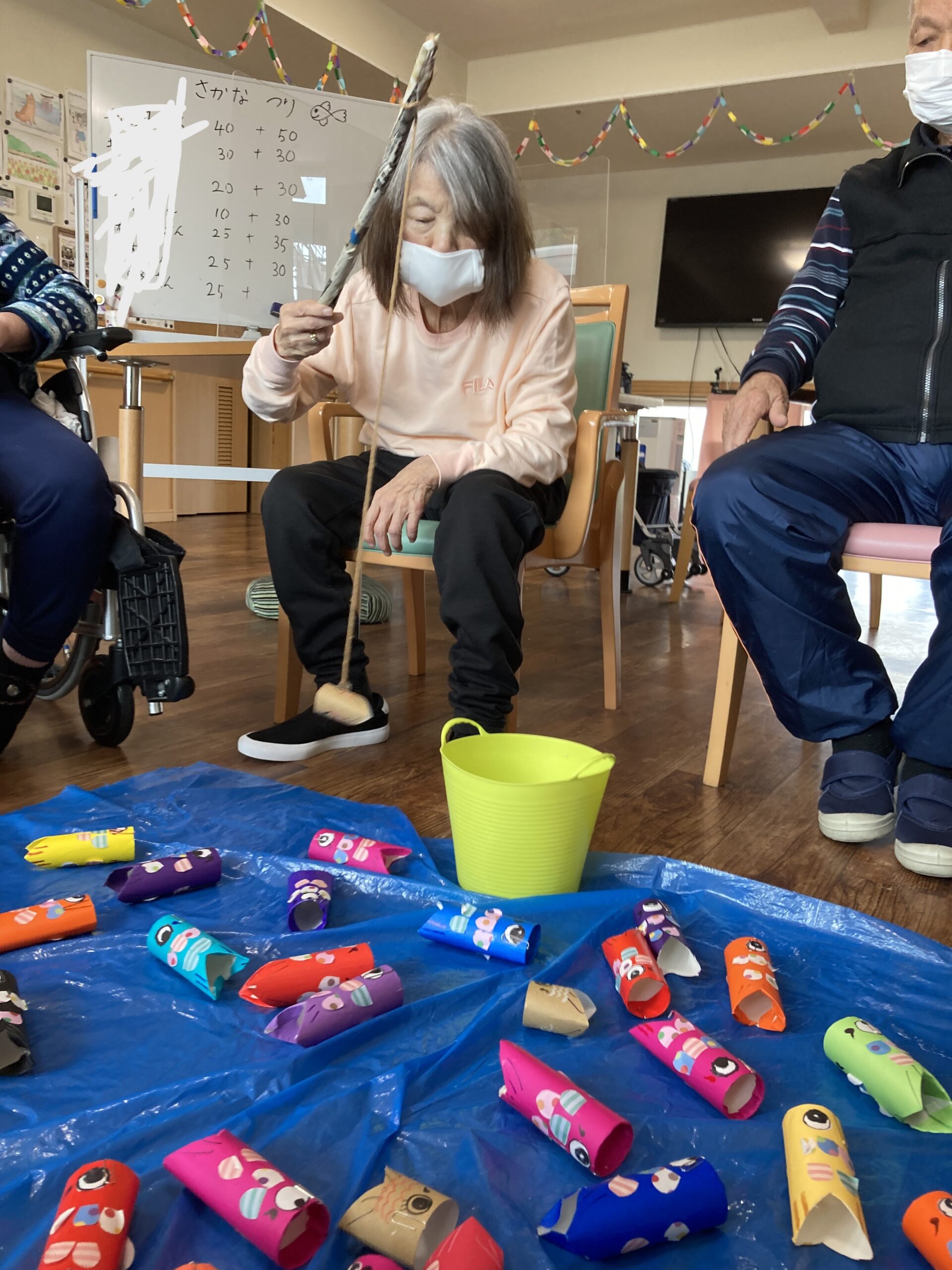 レクリエーションで魚釣り🐟や絵合わせをして楽しまれました。魚釣りでは釣り上げる事が難しく残念がる姿が見られましたが、釣り上げると「釣れた釣れた!」と笑顔が見られました。