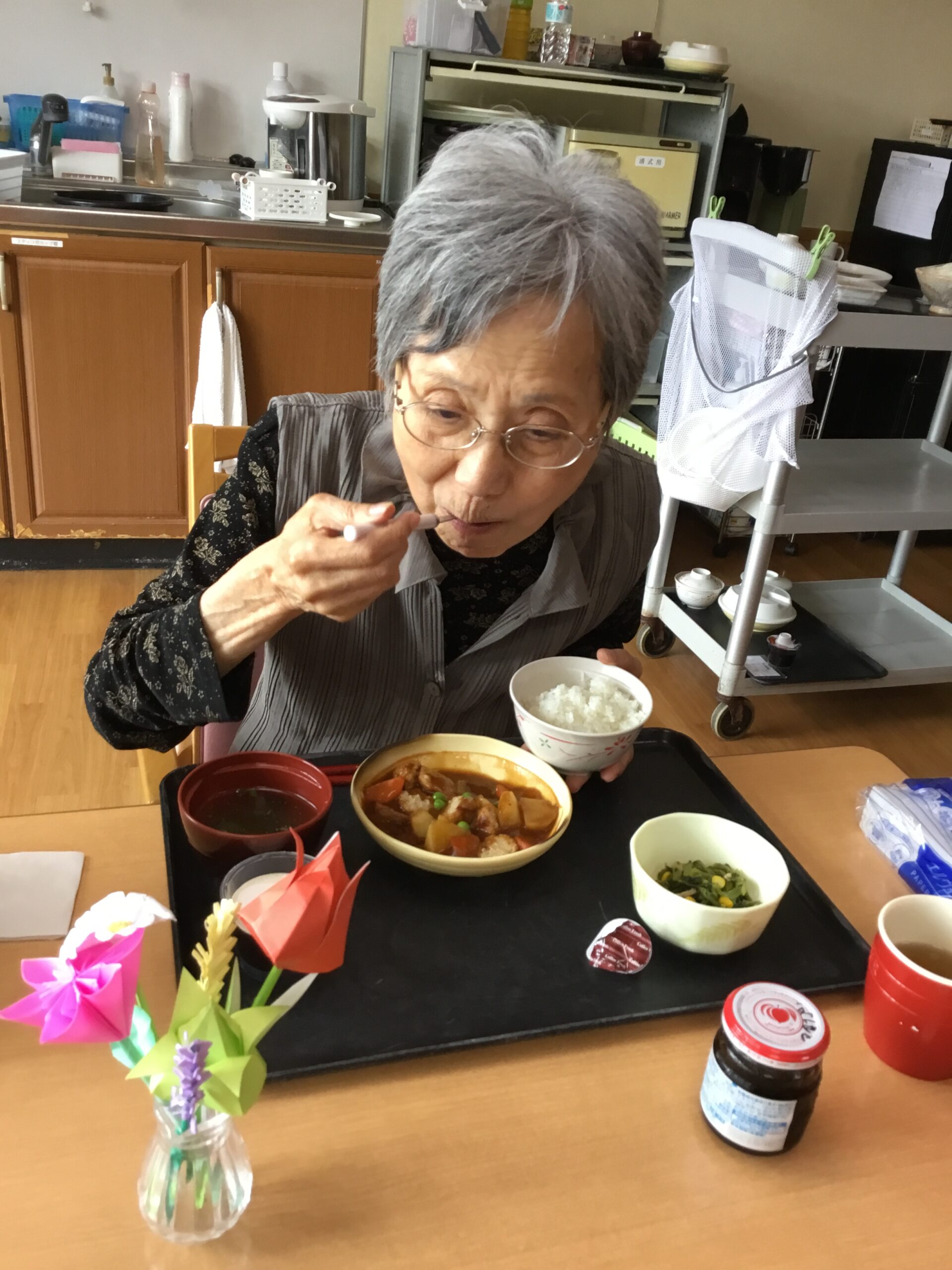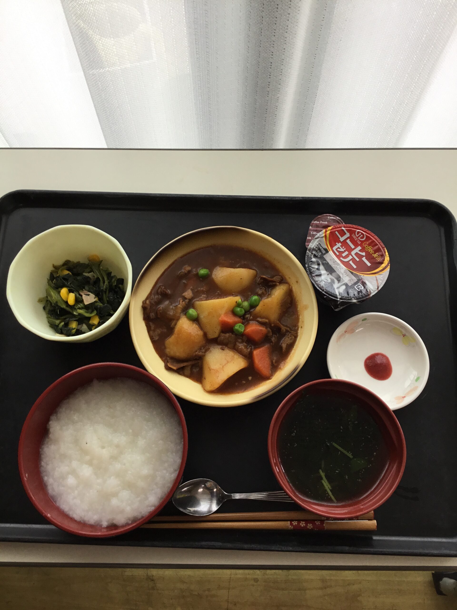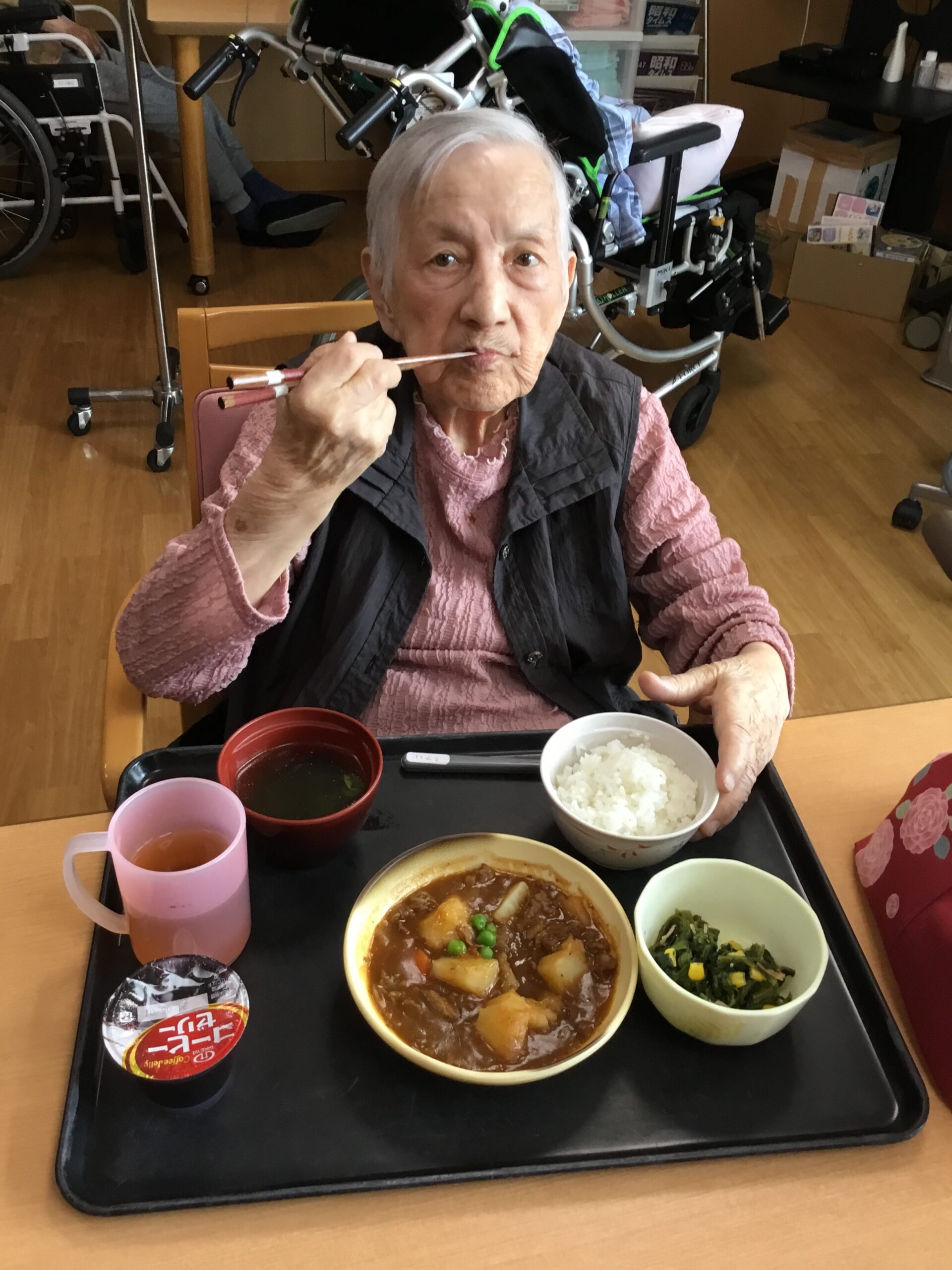 本日の昼食はビーフシチュー、スープ、ほうれん草のソテー、コーヒーゼリーです。温かいビーフシチューは柔らかく煮込まれた牛肉は食べやすく高齢者の方にも食べやすいメニューでした。栄養満点で皆さん喜ばれて食べられました。