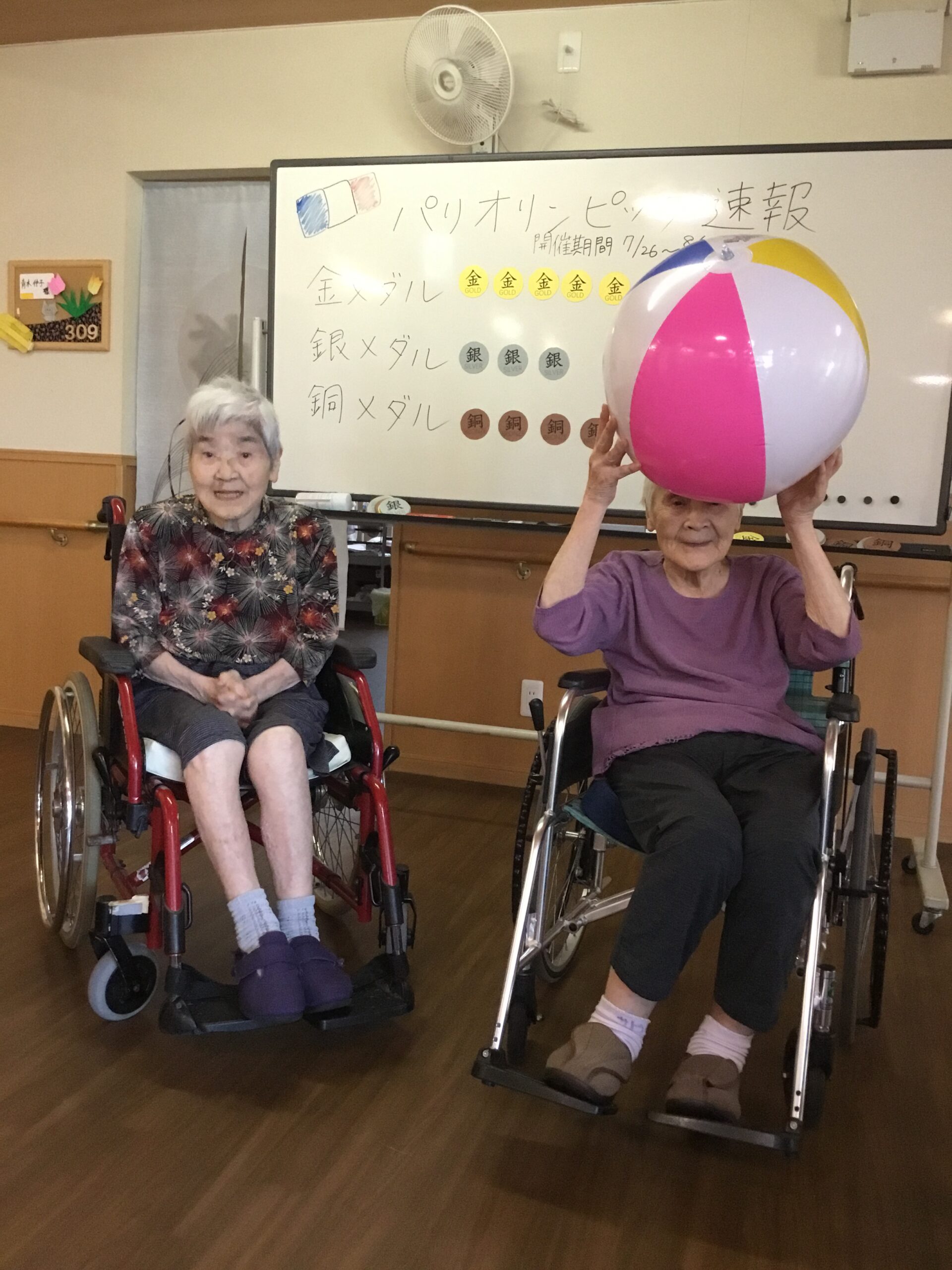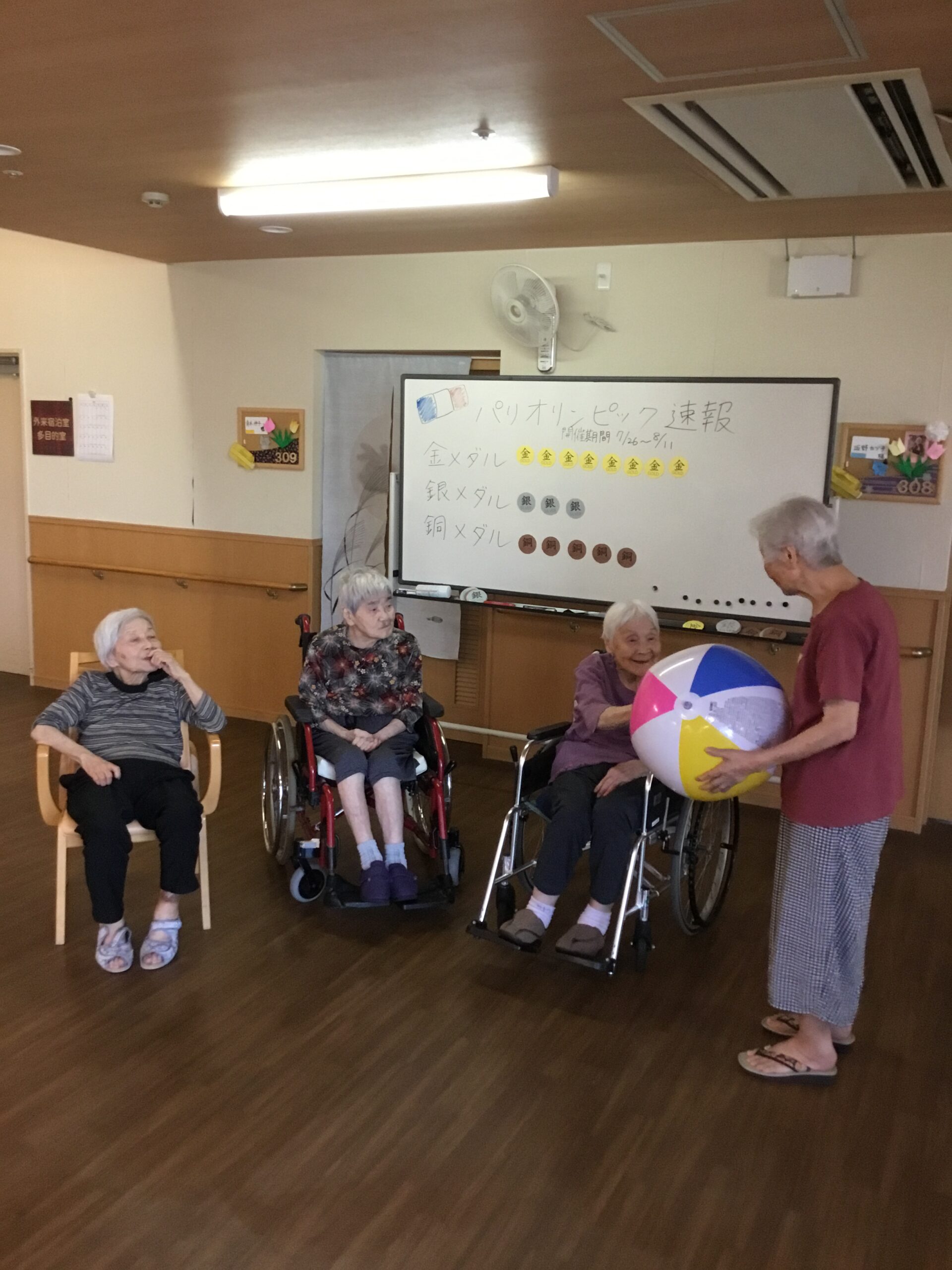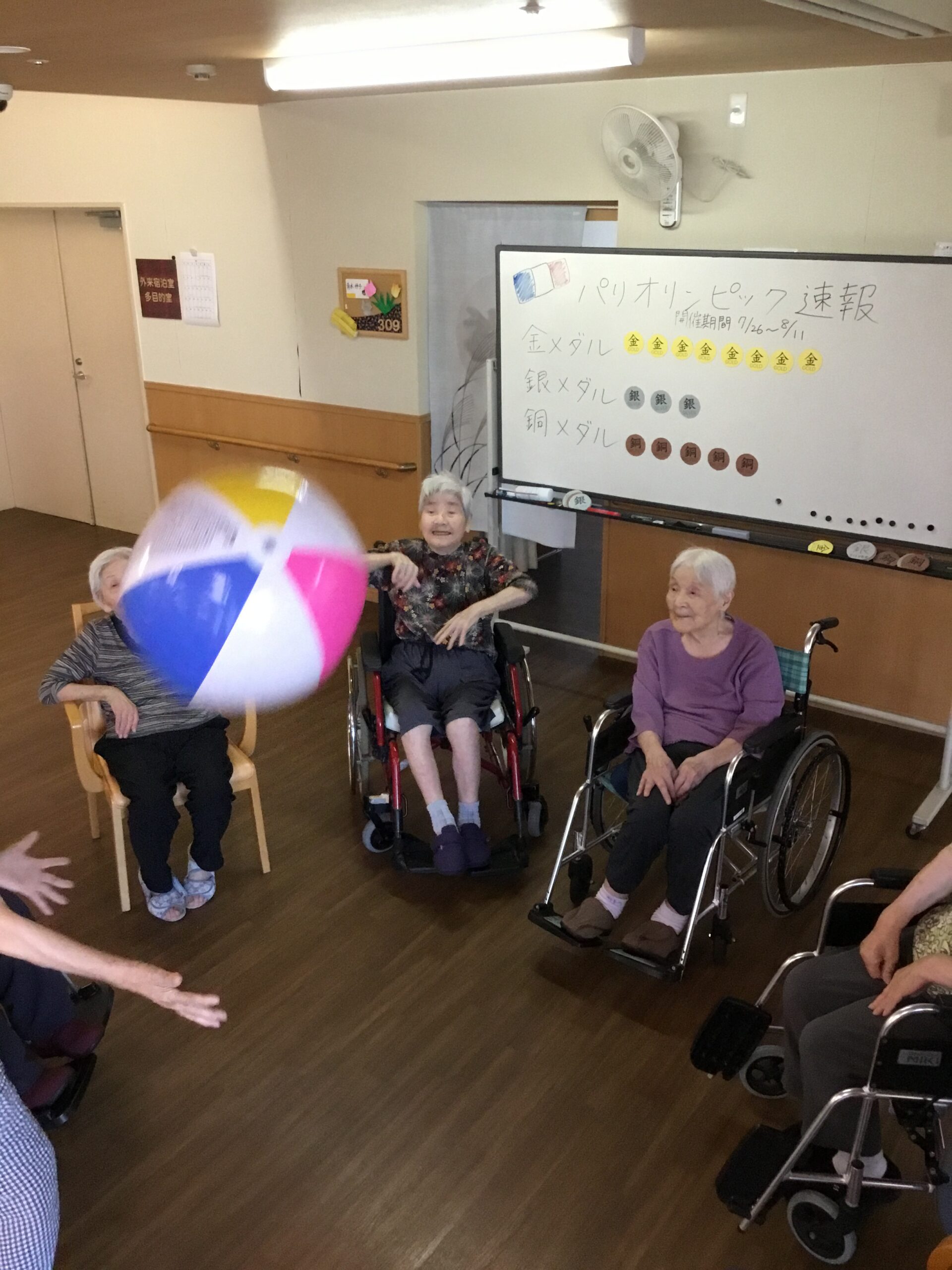 こんにちは、レクリエーションの様子をお伝えします。今日は皆さんで一緒にビーチボールでバレーをして遊びました。毎日、暑い日が続いておりますが負けずにしっかり身体を動かしております。