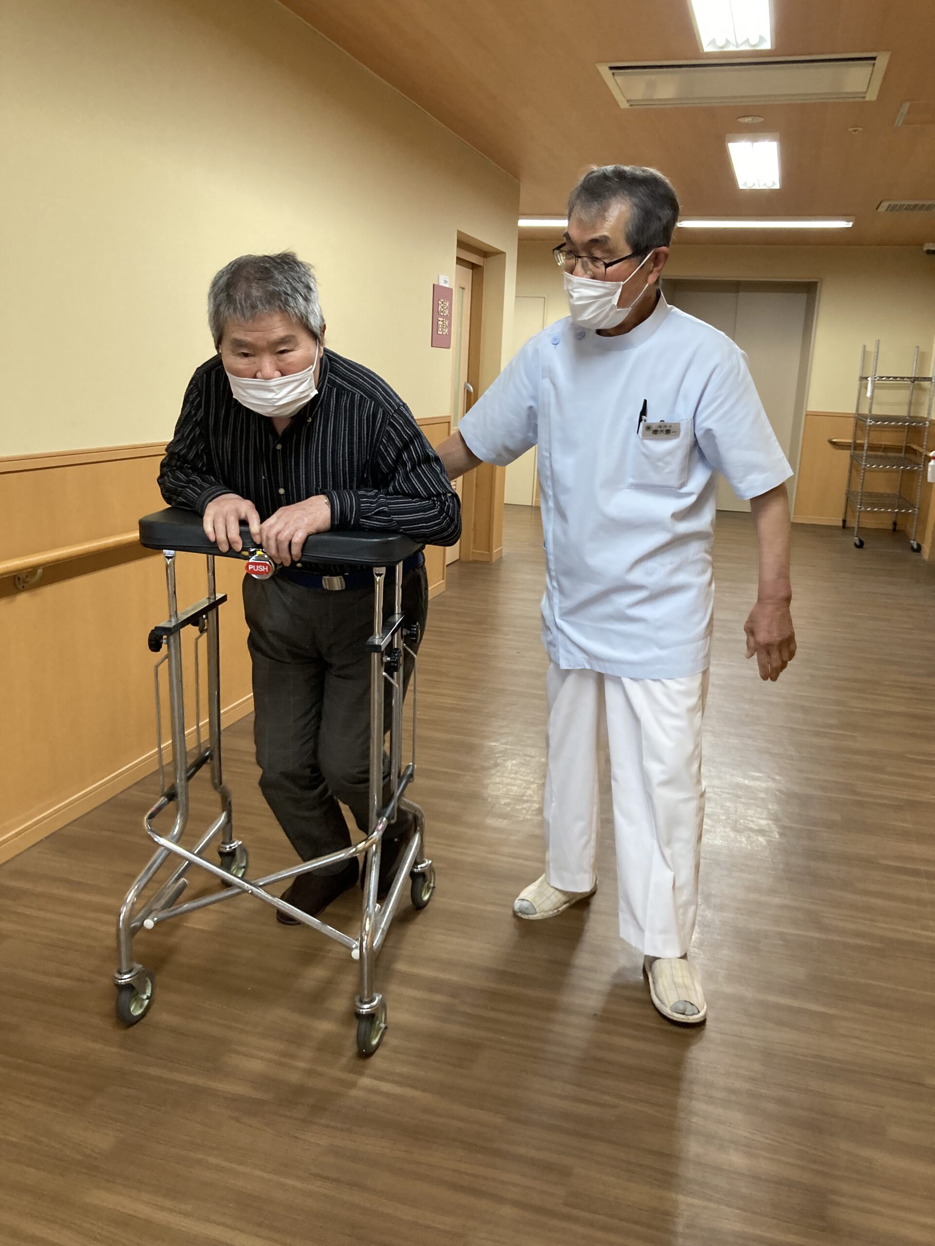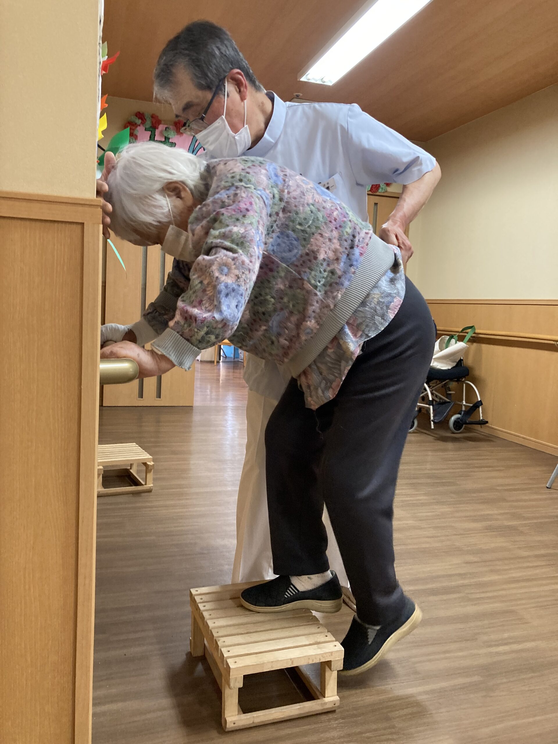 数を数えながら”踏み台昇降”をされたり、”歩行器”で指導員と廊下をゆっくり歩かれたり、指の運動で箸を使われたりと個々に合わせたプログラムで毎日行っております。