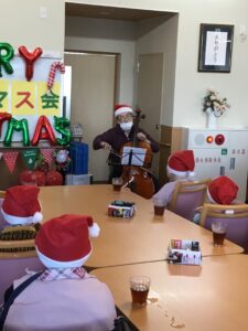スタッフによるハンドベルやチェロの演奏を聴き、きよしこの夜などを歌いました。