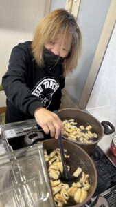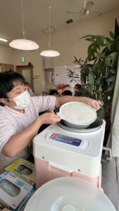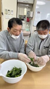 いつものように必要な物を利用者様と一緒に買い物へ購入。餅つき当日は餅を作る係、お雑煮の用意をする係、きな粉を準備する係とグループに分かれて調理を開始。みんなで協力してできたお餅をきな粉、海苔巻き、粒あん、お雑煮とそれぞれが食べたいものを選んで美味しく頂きました。