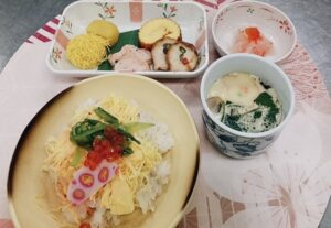 ちらし寿司に茶碗蒸し、おせち盛り合わせの正月御膳です。