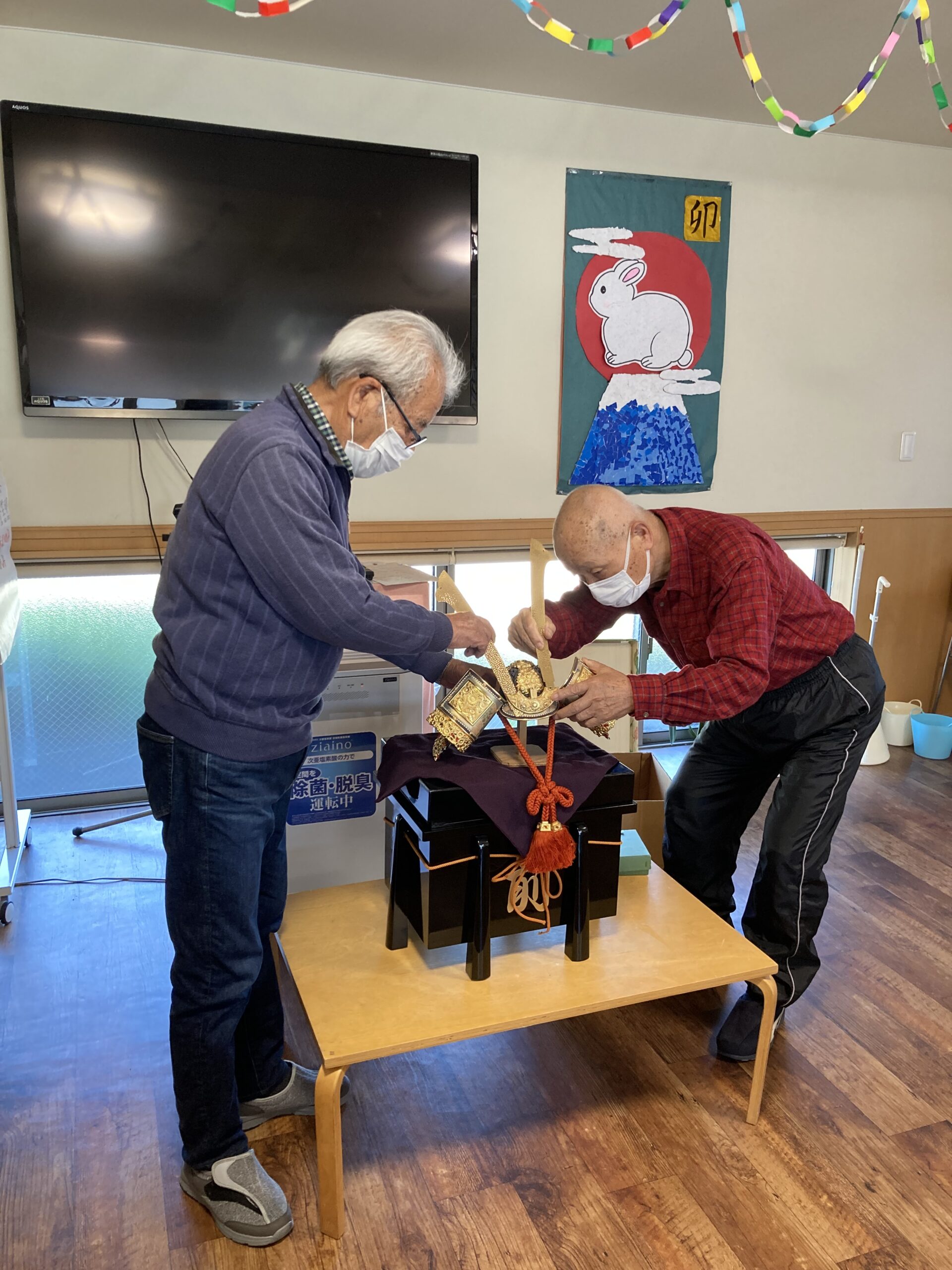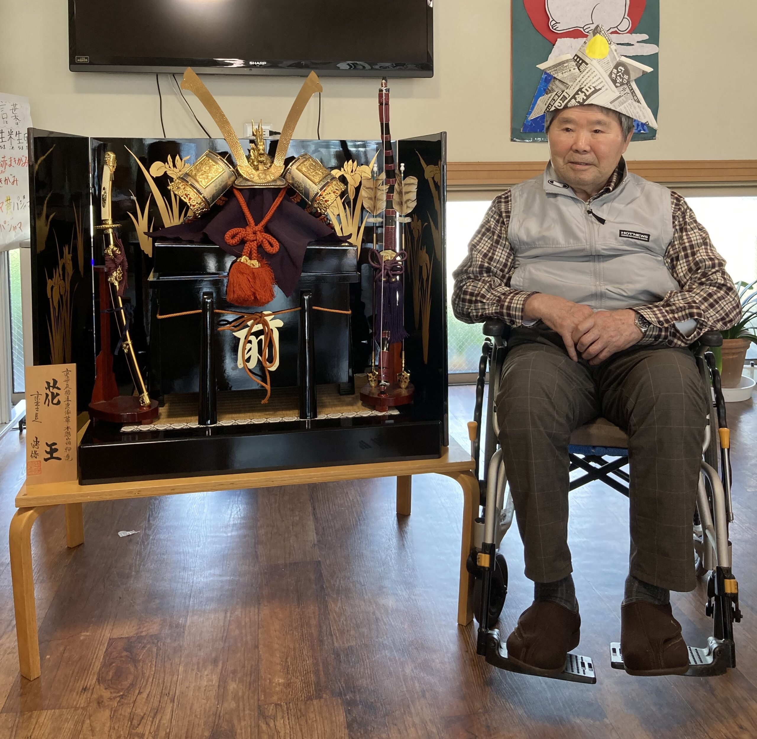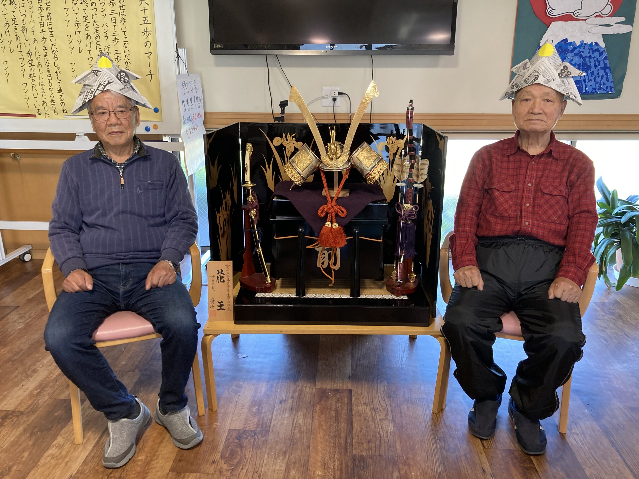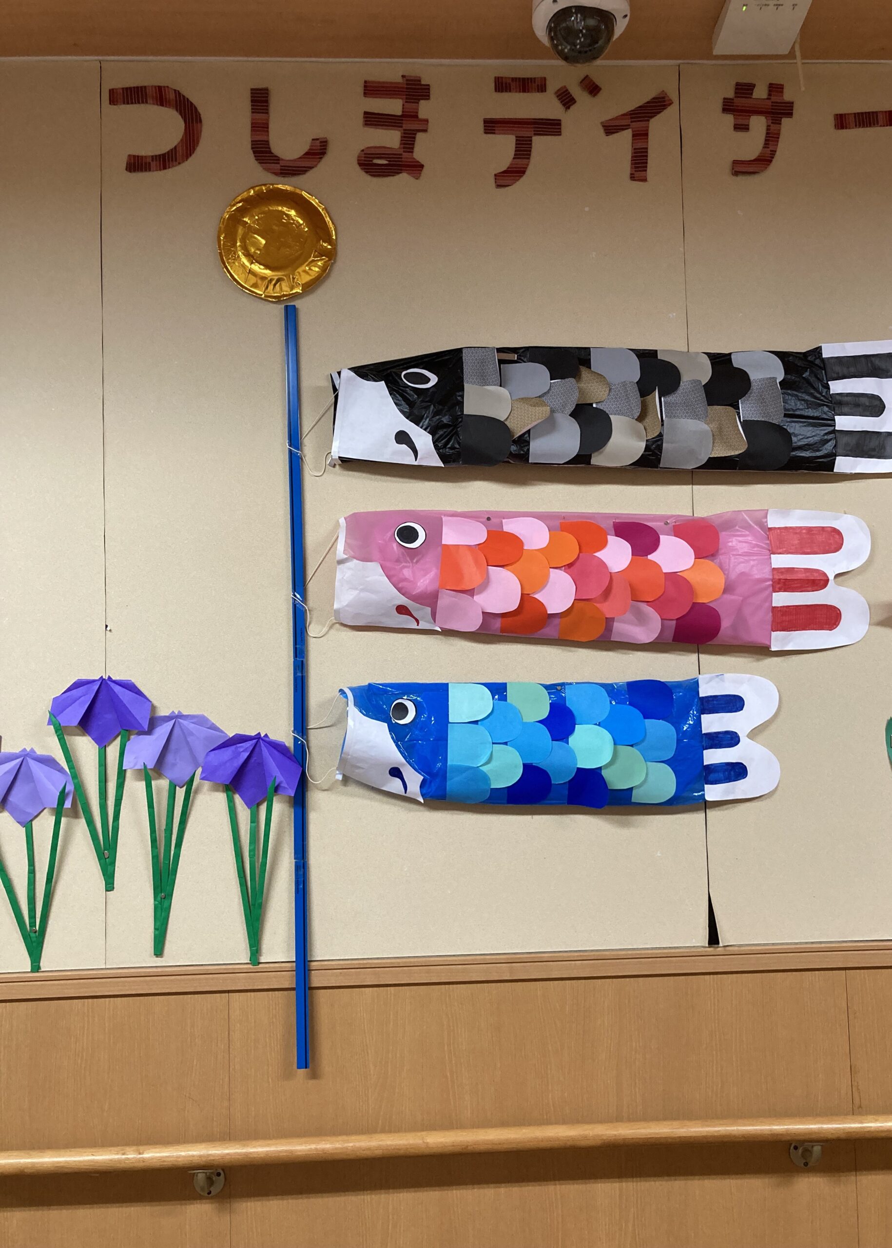 5月5日『端午の節句』が近いので ”兜” を飾りました。「子供が小さい頃は毎年飾ったよー」「鯉のぼりもあげたよー」と話が盛り上がりました。デイサービス入口の壁面にも “鯉のぼり”  を飾りました。