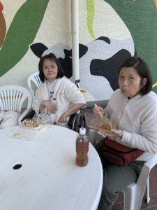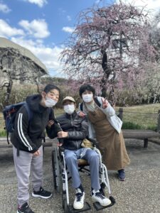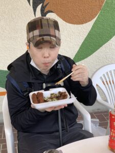 3/20、23に名古屋市農業センターへしだれ梅を見に行きました。天気も良く暖かい気候で過ごしやすく、園内で販売されている食事をそれぞれ自分で選んで購入し、青空の元みんなで美味しく頂きました。食後には3人1組で職員を入れたグループに分かれ、それぞれが園内をどのように散策するかを相談して決められ、園内にあるしだれ梅園できれいに咲いた梅の花を見たりふれあい広場にいる動物とふれ合ったりとみなさん決められた時間で自由に楽しまれてました。外での食事や季節を感じる植物、動物とのふれ合いを通して日頃のストレス発散や気分転換にできた様子で「楽しかった」「ごはん美味しかった」など喜びの声がたくさん返ってきました。