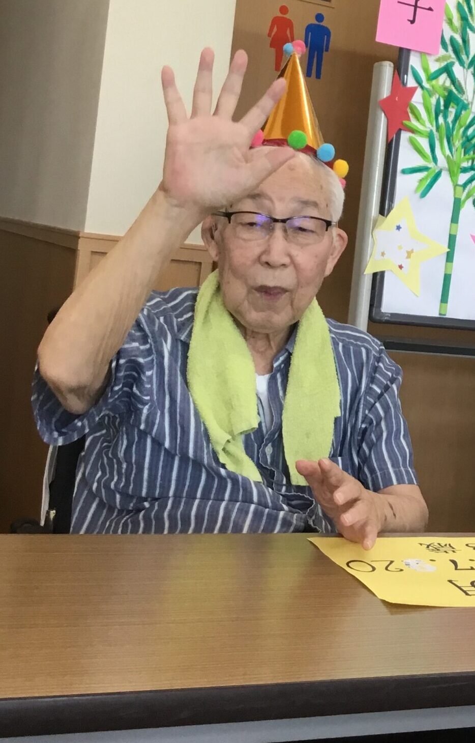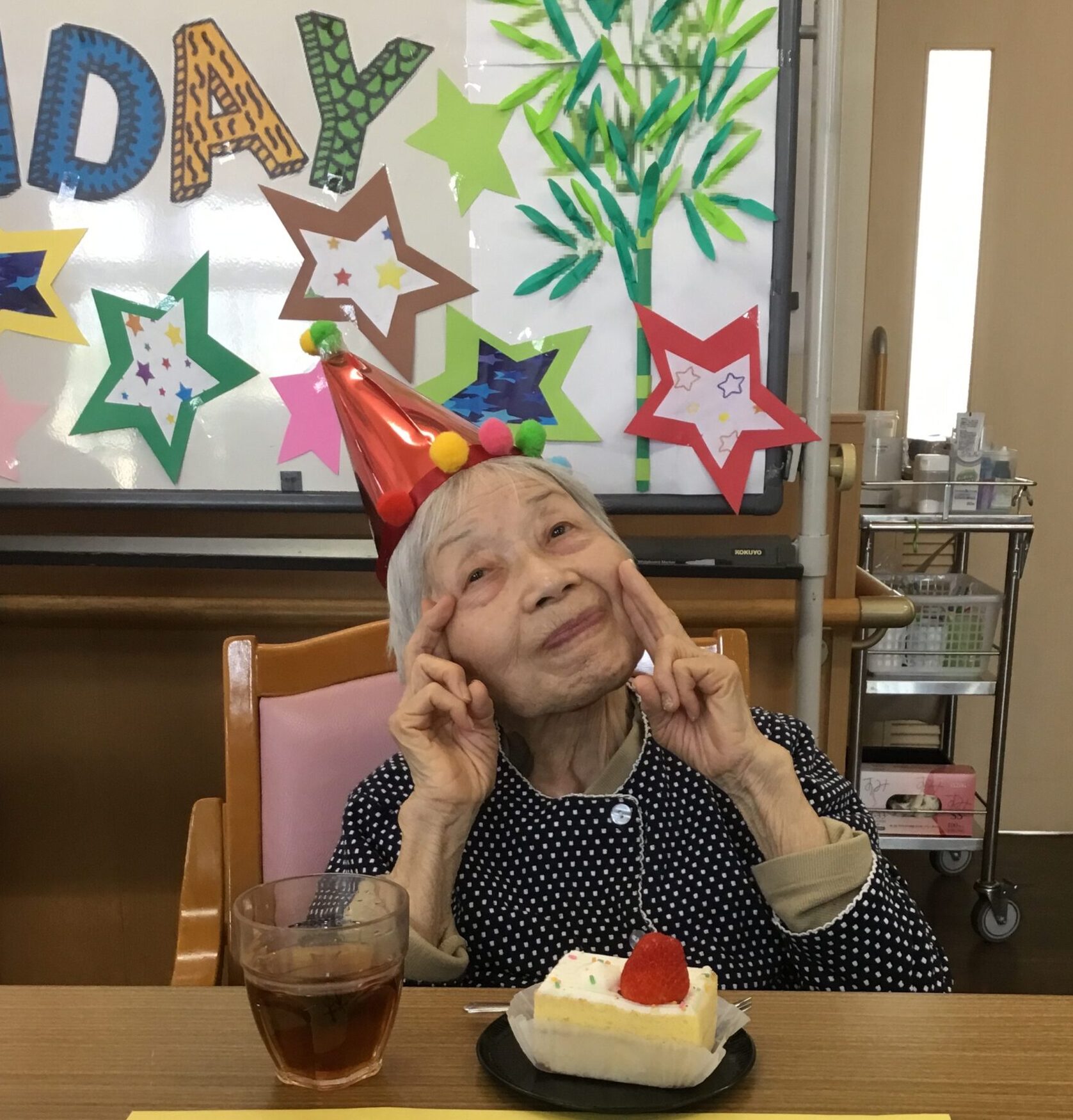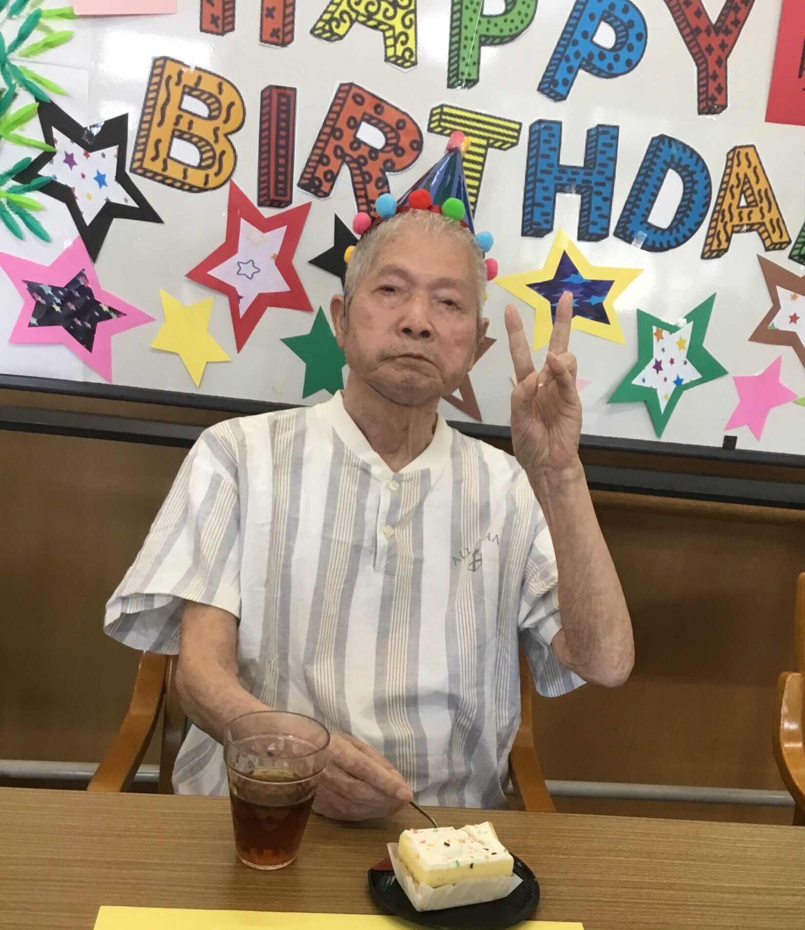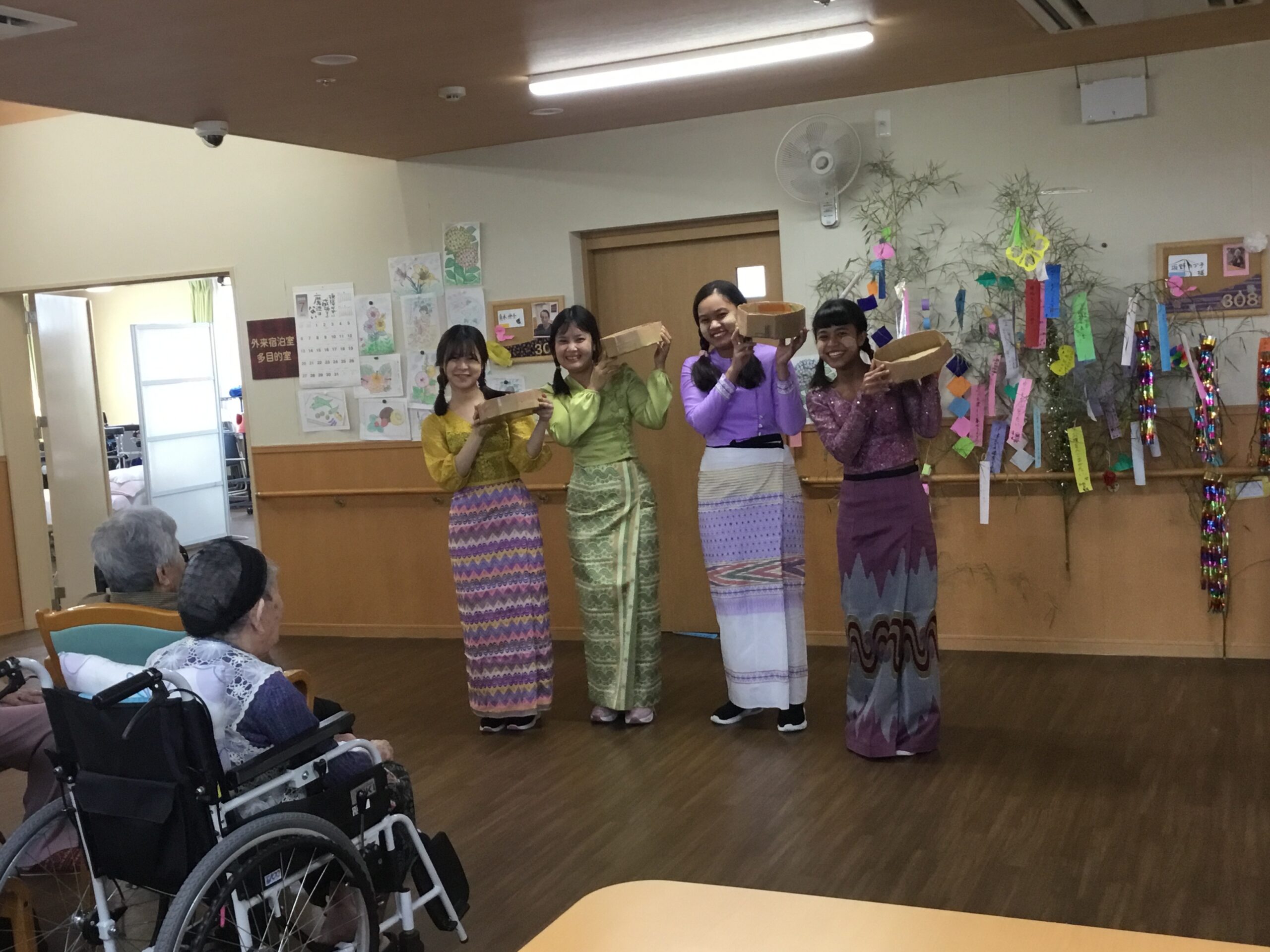 7月の誕生日会は笹飾りの前で、ダンスの披露でした。ミャンマー出身のスタッフたちで音楽に合わせて素敵な踊りを見せてくれました。みなさん、手拍子をしてにこやかにされてみえました。
