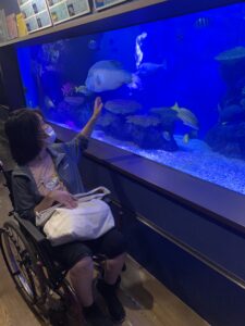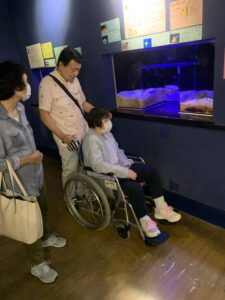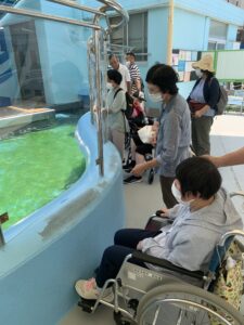 外出企画2日目、今日も蒲郡は晴天で日差しも強く暑かったです。昼食は前回同様キッチンカーで自分で食事を選んで頂きましたが、暑かったためかみなさんアイスやかき氷を食後に食べられてました。竹島水族館の中は冷房も効いて天国に感じ、見たこともない魚を見たりカニに触ったりとみなさんとても楽しまれておりました。今日の集合写真は旧館の前で撮影しました。