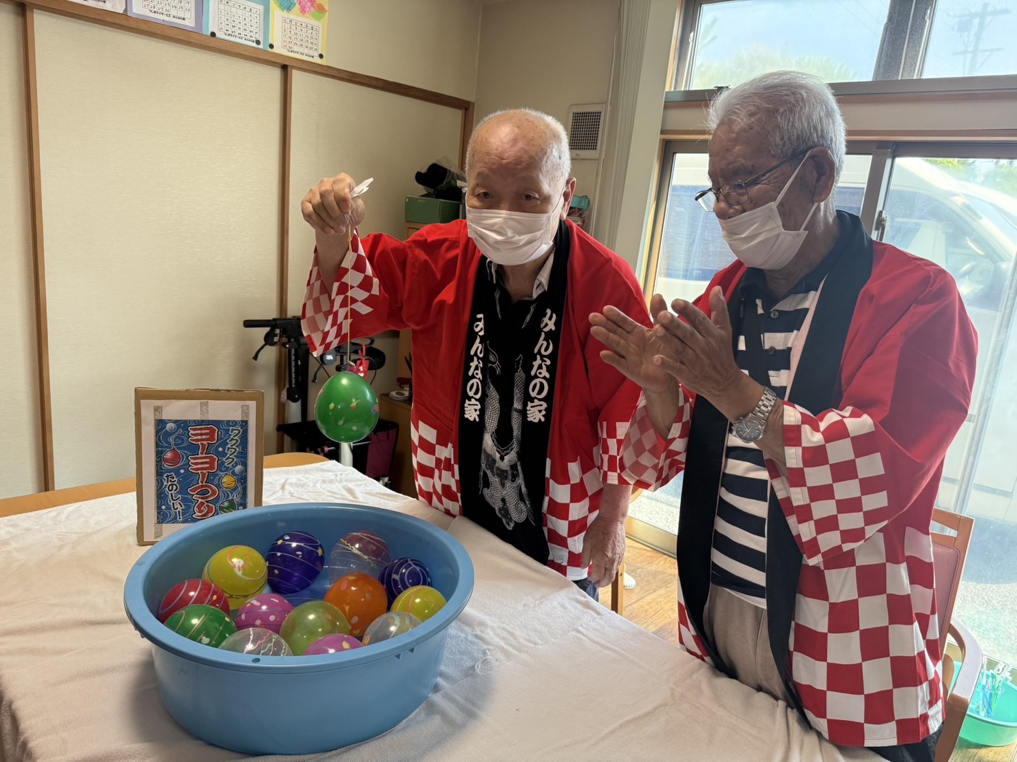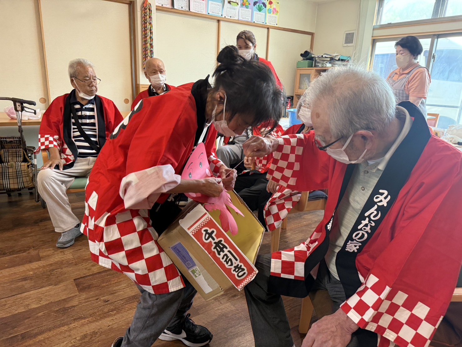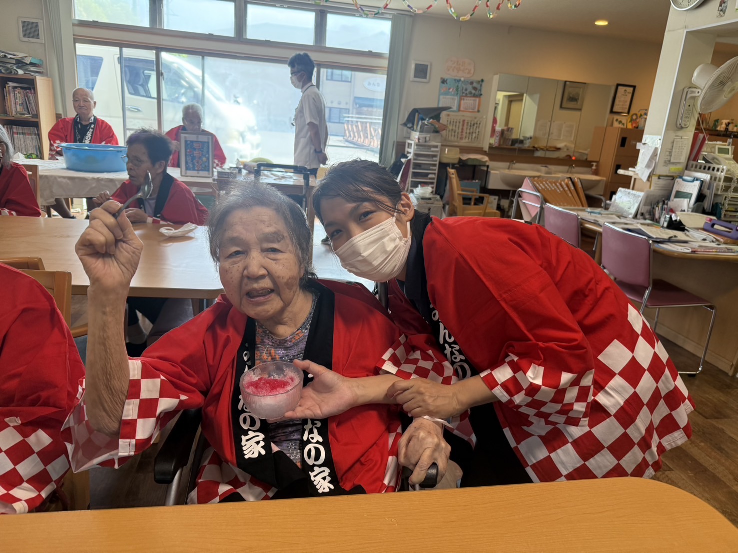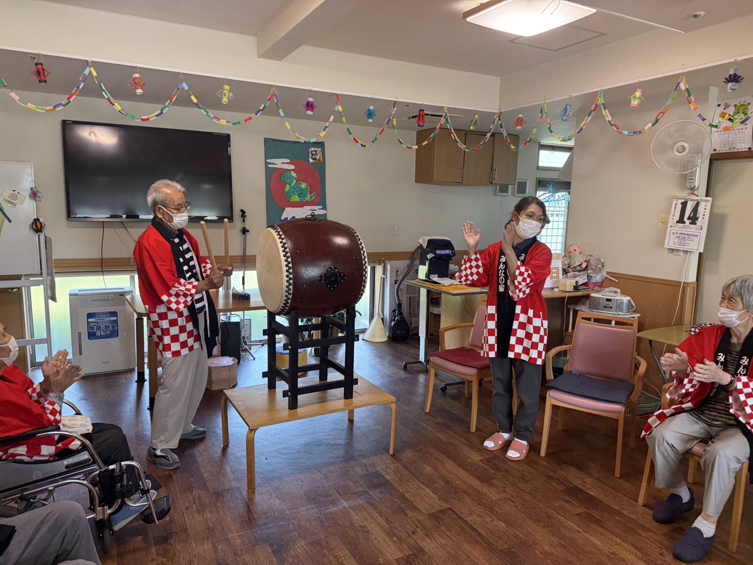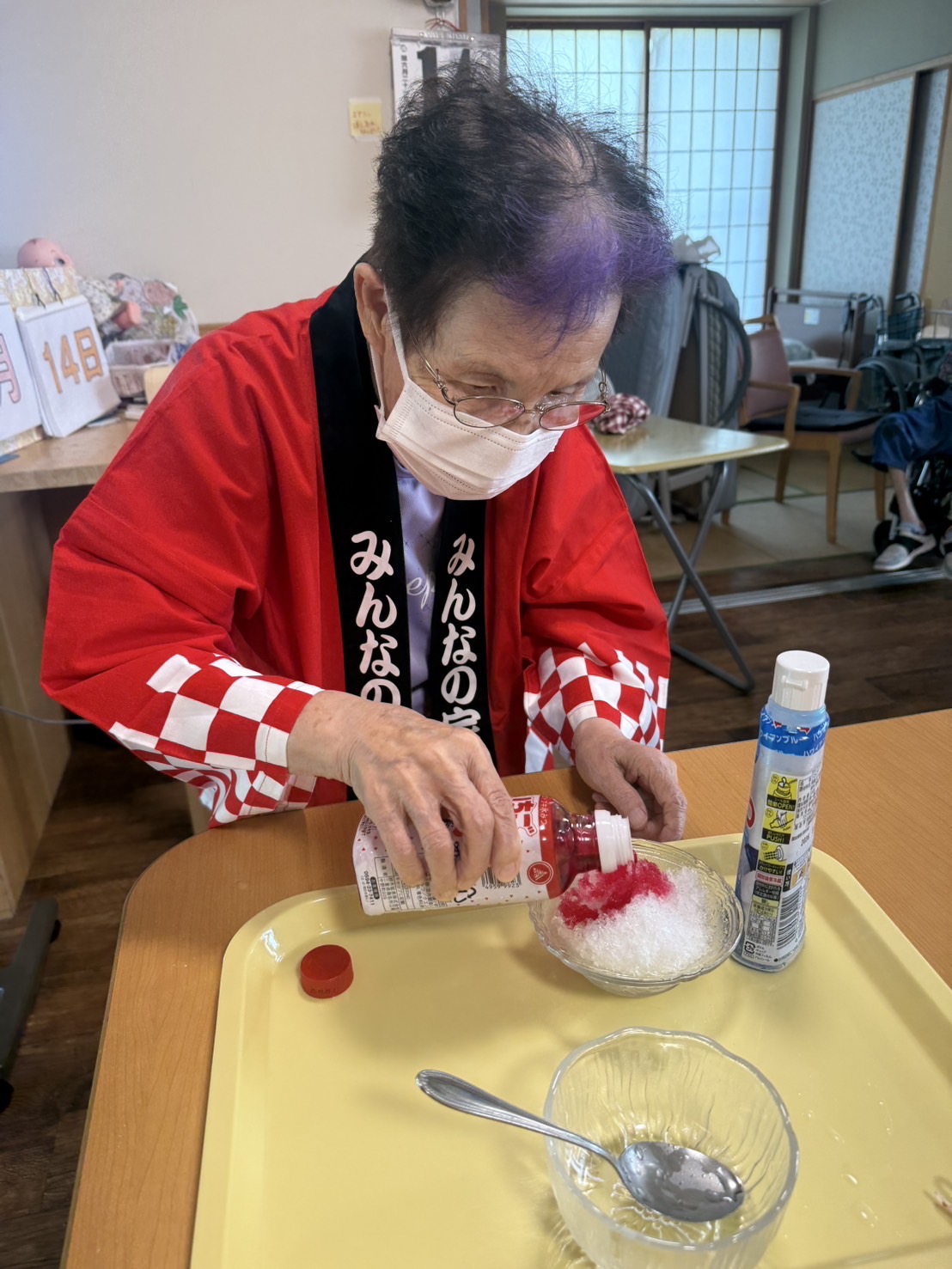 納涼祭りを行いました。法被を着て、かき氷にお好きなシロップをご自分で掛けて召し上がり、東京音頭や炭坑節の曲にあわせて太鼓を叩きました。