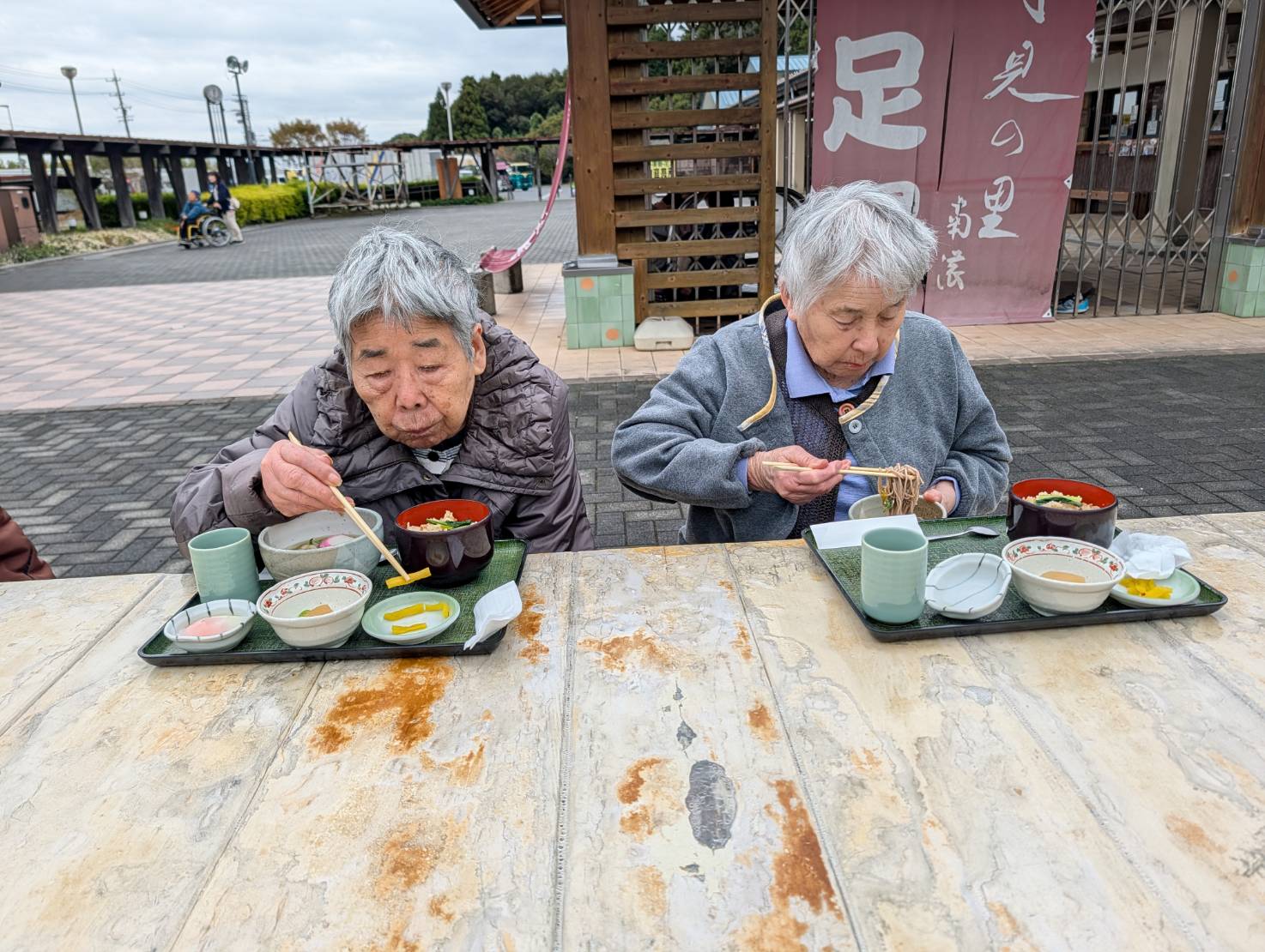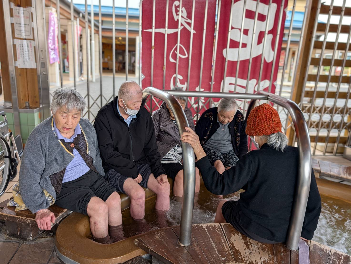 お昼はサービスエリアに立ち寄り、うどんやそばをいただきました。外で食べる温かい食事は格別で、みんなの笑い声が絶えませんでした。食後は足湯にも入り、旅の疲れをゆっくり癒しました。お湯のぬくもりに包まれながら「気持ちいいね」と話す姿が印象的でした。