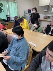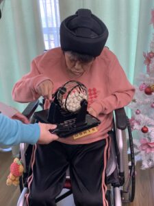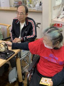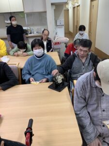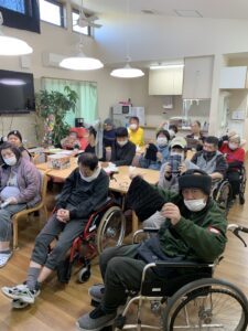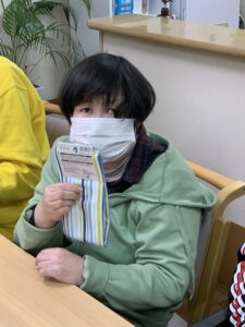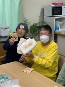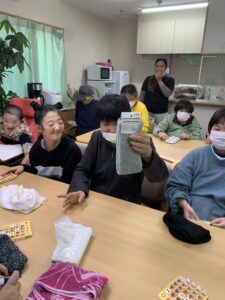 今日は久しぶりにビンゴ大会を行いました。いつもは飲み物や食べ物などが景品となっていますが、今回はだんだん寒くなり冬を迎えるための準備も含めた景品を用意しました。会場もいつもと違った形式にしてみんなで集合しゲームを開始。順番に抽選をして出た数字を読み上げるなどみんなでゲームを進行。ビンゴされた方から景品を選んで頂きました。ゲーム中は真剣に発表された数字を探されたり見つかると「あった」など笑顔で発言されたりとみなさん楽しみながら脳の運動や心身機能の維持・向上のための訓練をビンゴを通して行う事ができました。
