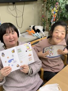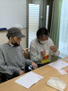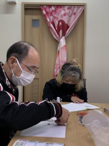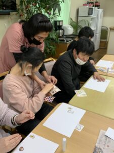 新年最初の行事として年賀カード作りをしました。準備した材料を使ってそれぞれが自由にデザインして作成。シールなどを使って作られた方、中には絵を自分で書いて作られた方もいらっしゃいました。また、片面に今年の目標やお願い事を書いている方もいらっしゃり、それぞれ個性あふれるカードが完成しました。