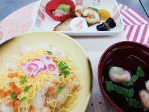 散し寿司は、鮭やいくらを添えて、お正月らしく華やかに