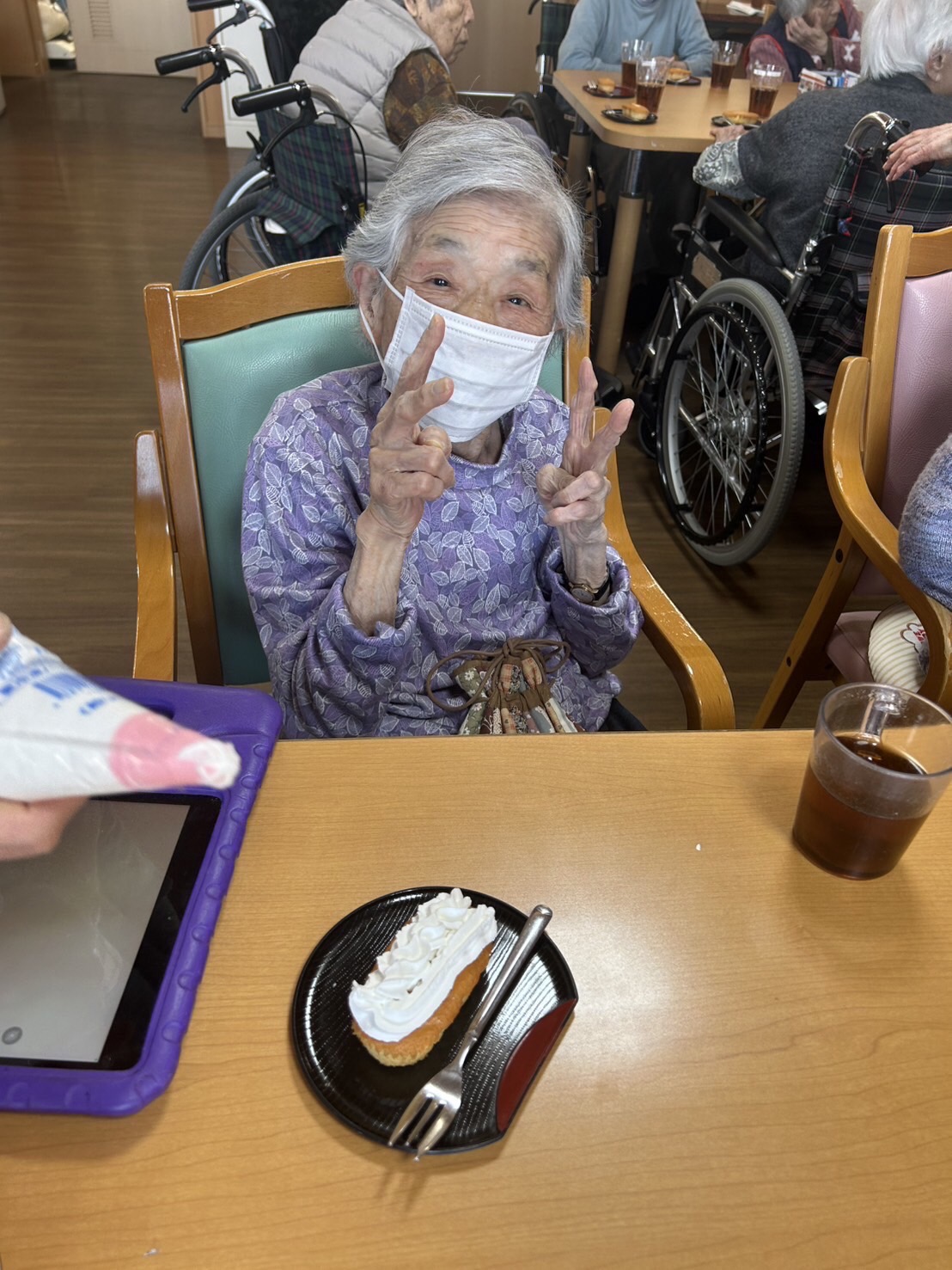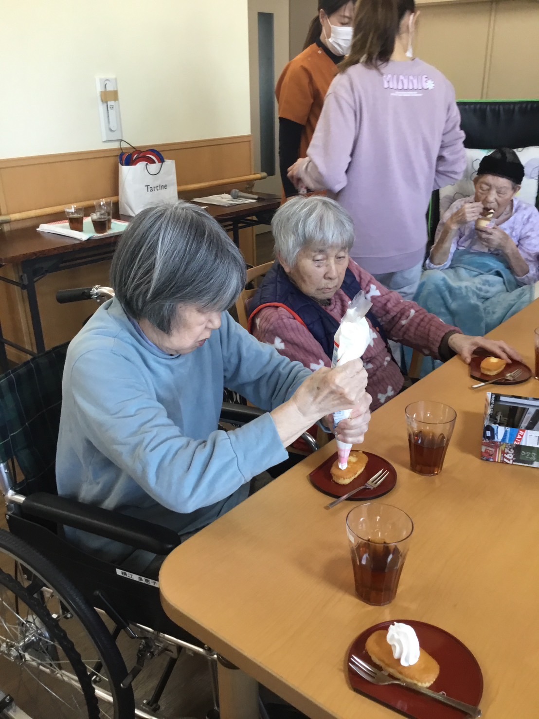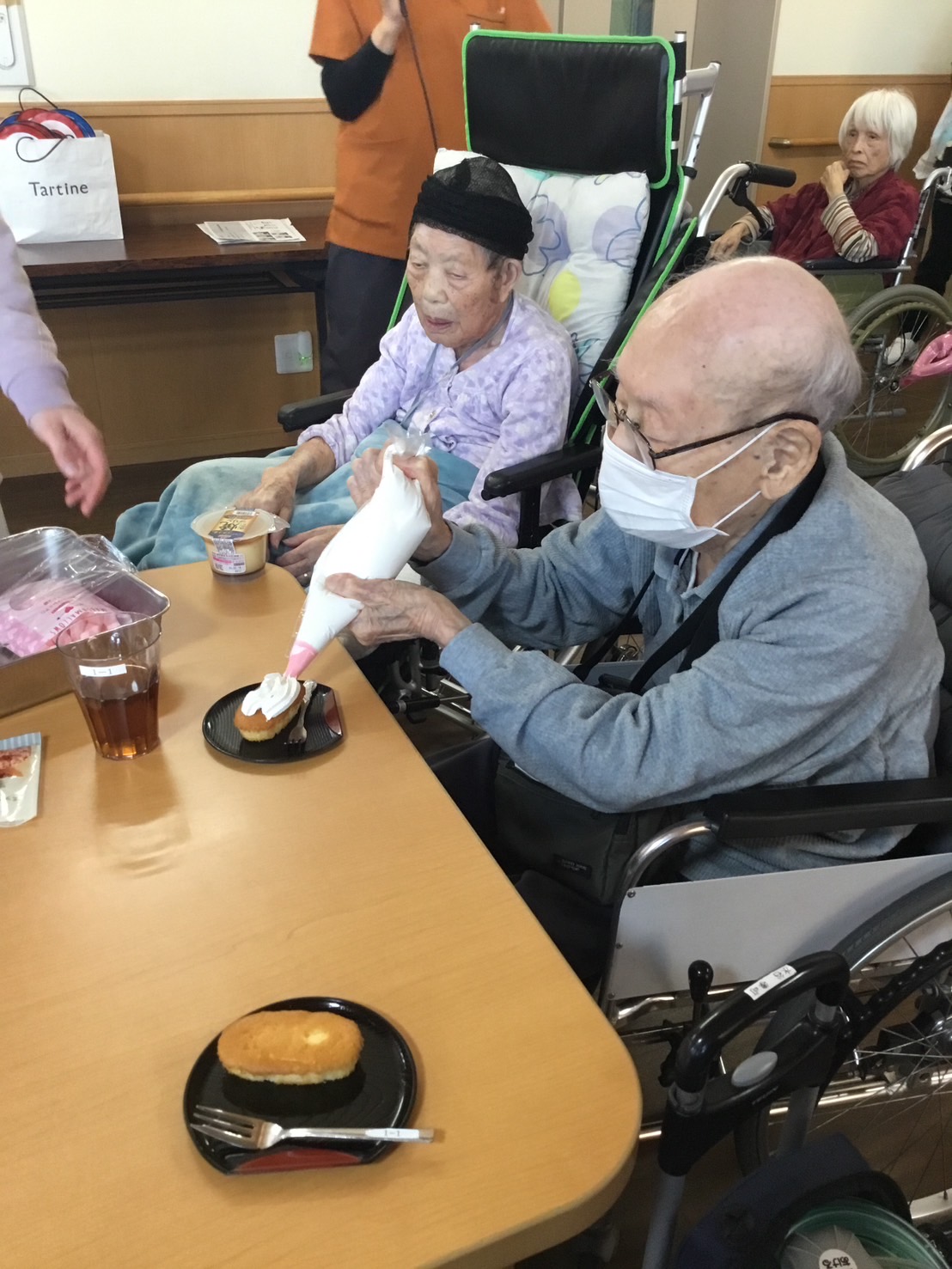 今月の誕生日会では、健康に関するクイズ大会と手作りおやつレクリエーションを行いました。クイズ大会では、日常生活で心がけたい健康習慣や身体に関する問題を提出しました。楽しみながら健康について学んでもらう時間になりました。手作りおやつレクリエーションでは、カップケーキ作りに挑戦しました。皆さんと一緒に作ったケーキは見た目も可愛いらしく「美味いね」と笑顔で召し上がる姿が印象的でした。心身ともに健やかにお過ごしいただけるよう努めてまいります。