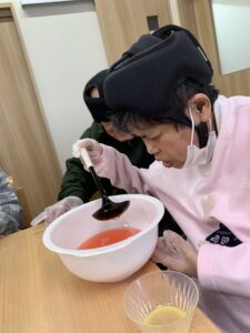 今日のレクは桃を使ったゼリーを作りました。桃の節句にちなんで今回は白桃を使用。下準備からみなさん周りの方と協力しながら調理をし、ゼリーにも色付けをして春の彩に仕上がました。最後に盛り付けをみなさん自分でされてゼリーが固まるのを楽しみにされていました。完成したゼリーは夕食に一緒に食べます。