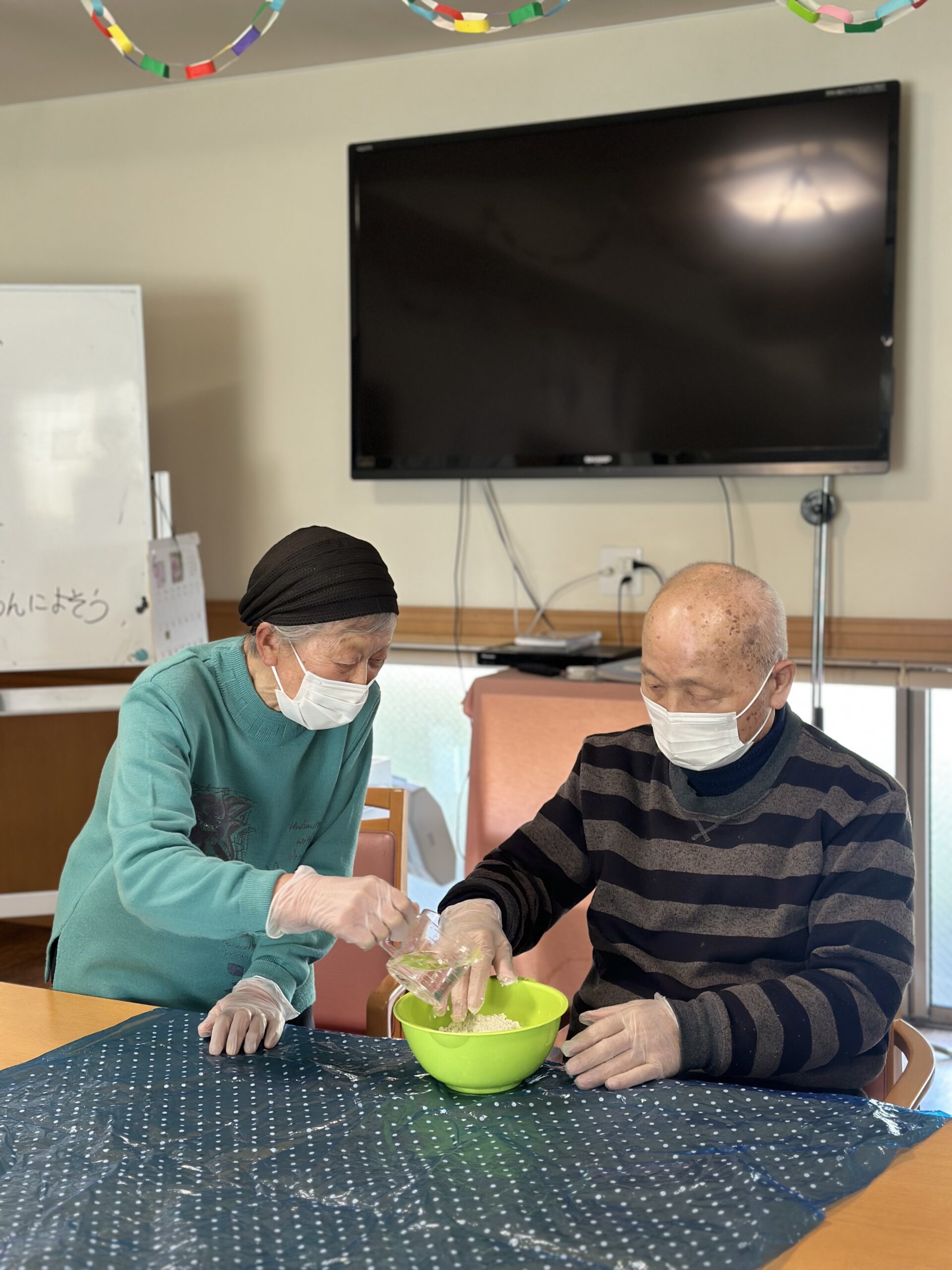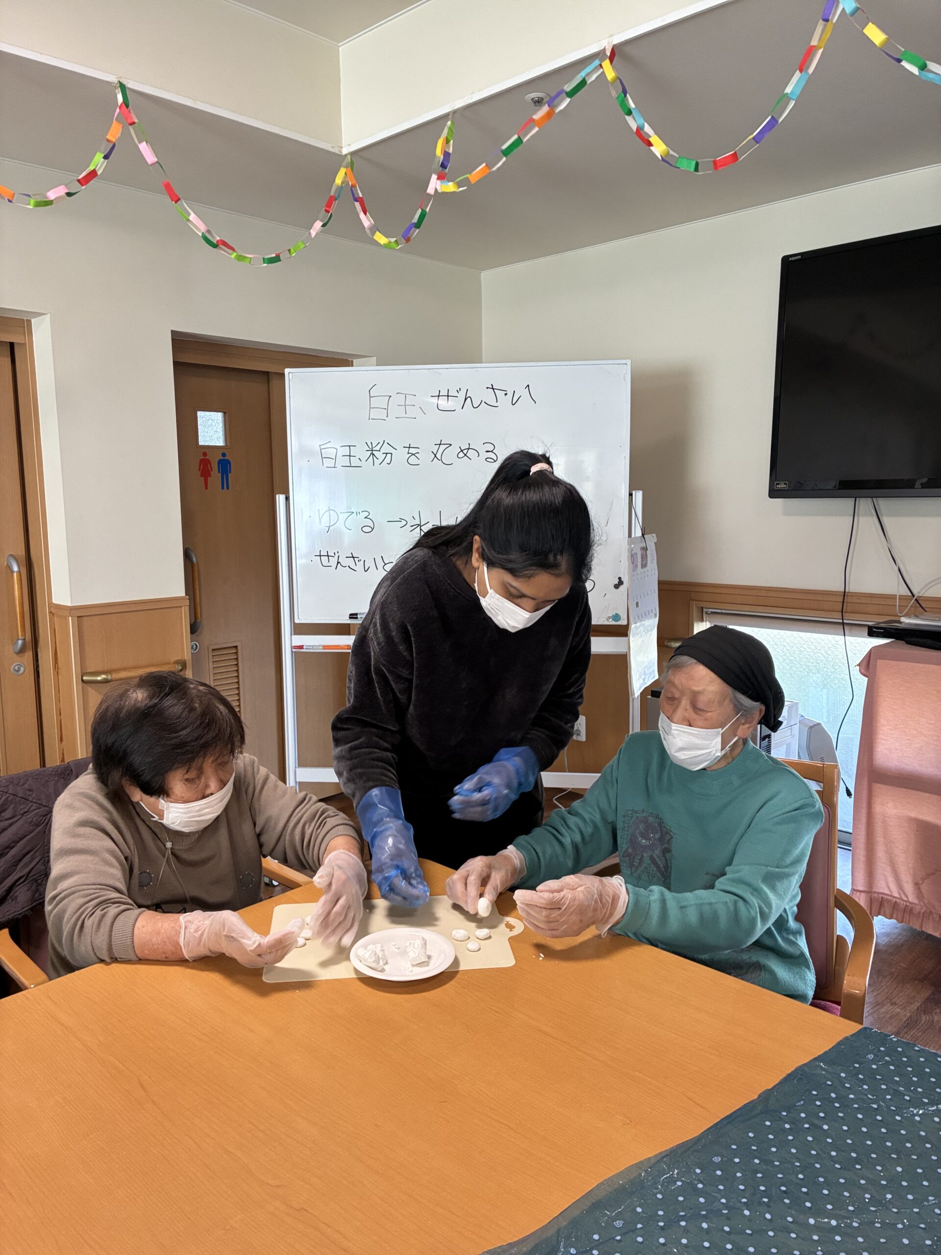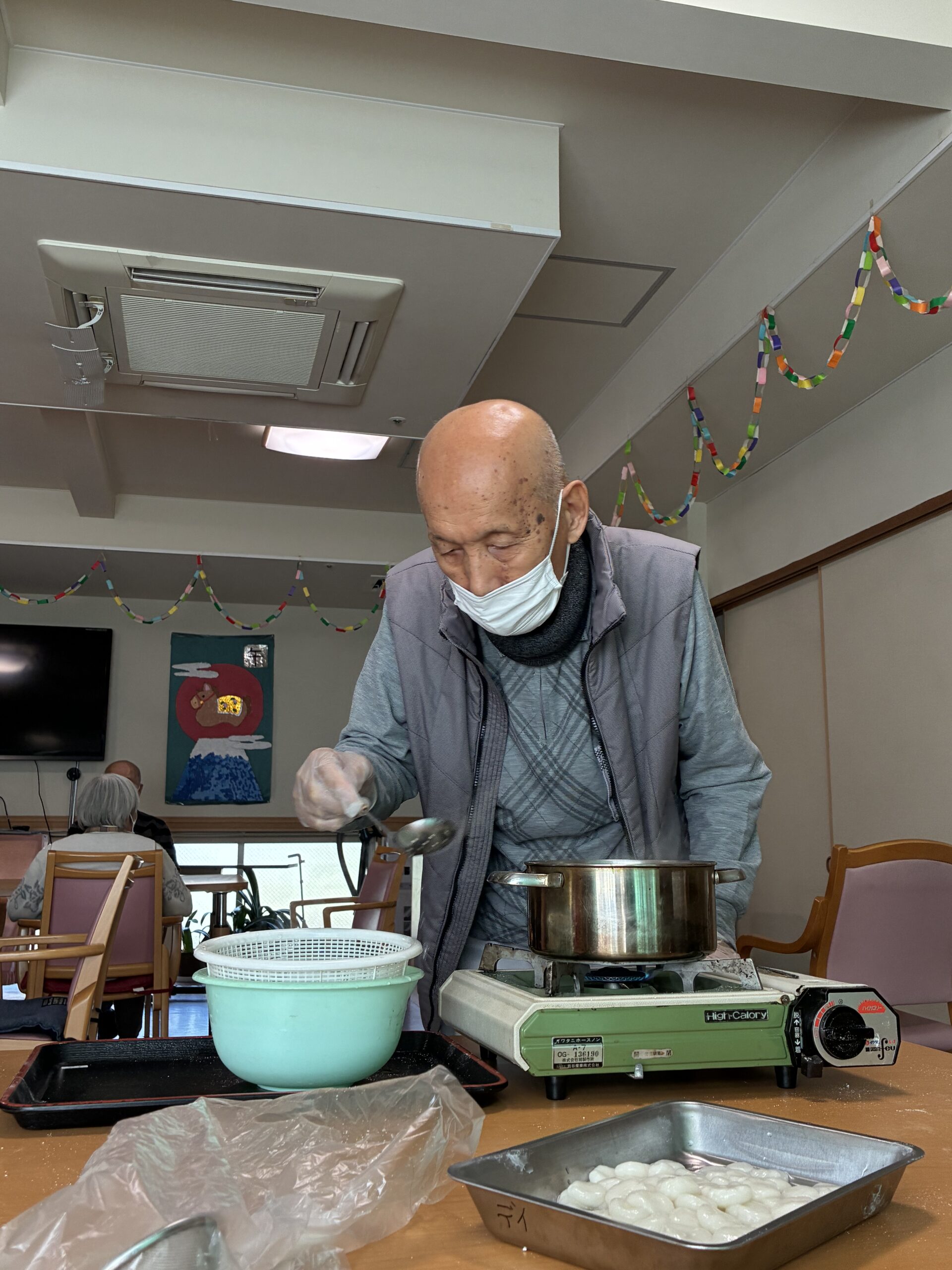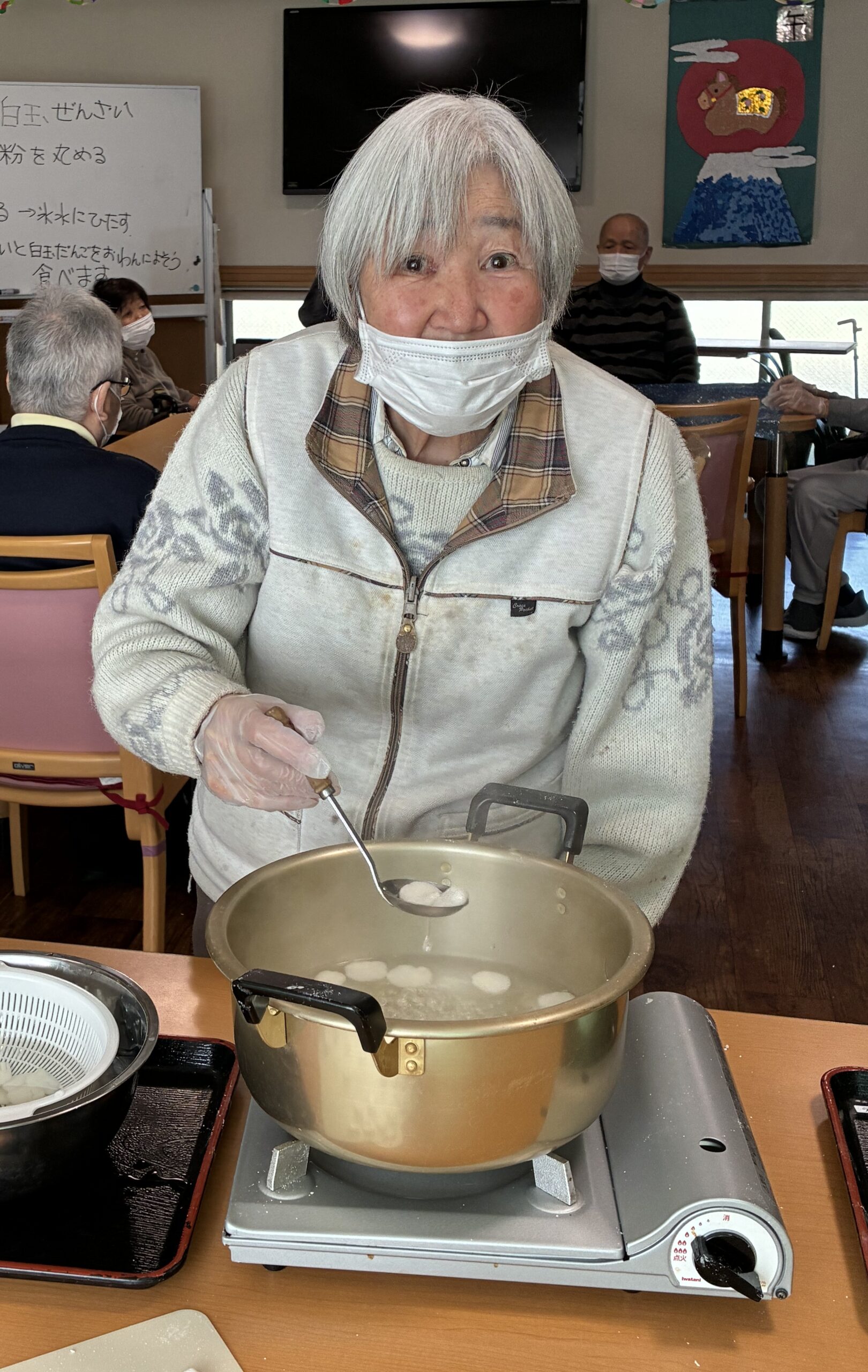 白玉ぜんざいを作りました。白玉粉に水を少しづつ入れながらこね、皆さんで小さく丸めました。途中で丸まらず、バラバラになることもありましたが、皆さん上手に指先を使い丸めることができました。丸め終わると、火傷に気をつけ茹でました。茹で上がると、ぜんざいを入れおやつ時の召し上がりました。「おいしい」や「甘いの好き」と笑顔で話され、ぜんざいをおかわりされた方も見えました。