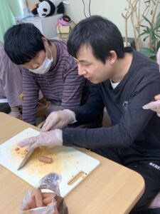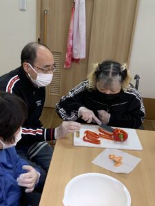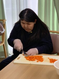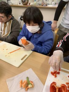 今日はみんなでスパゲッティ作りをしました。人参、玉ねぎ、にんにく、パプリカなど野菜を切る工程が大半で、普段使わない包丁をスタッフが見守りをする中みなさん交代で使って野菜を切っていました。慣れない手つきでやや危ないこともあり包丁の使い方を教えながら一緒にやって頂き、みなさん真剣な顔で調理をされていました。ソースを作っているときには「美味しそうなにおいがしてきた」などの発言も多く、スタッフを交えての会話も弾みました。調理を通して協調性を養う事と交流する機会を楽しみながら作ることができました。調理後の片づけや掃除もみんなで行うことができました、