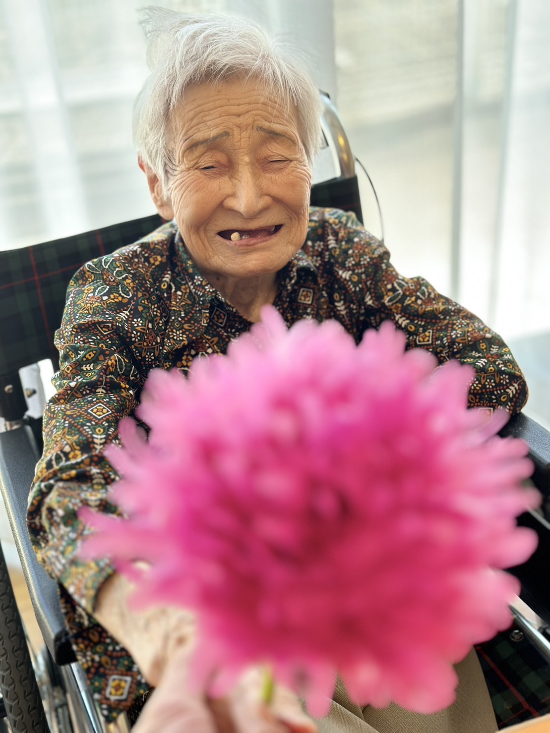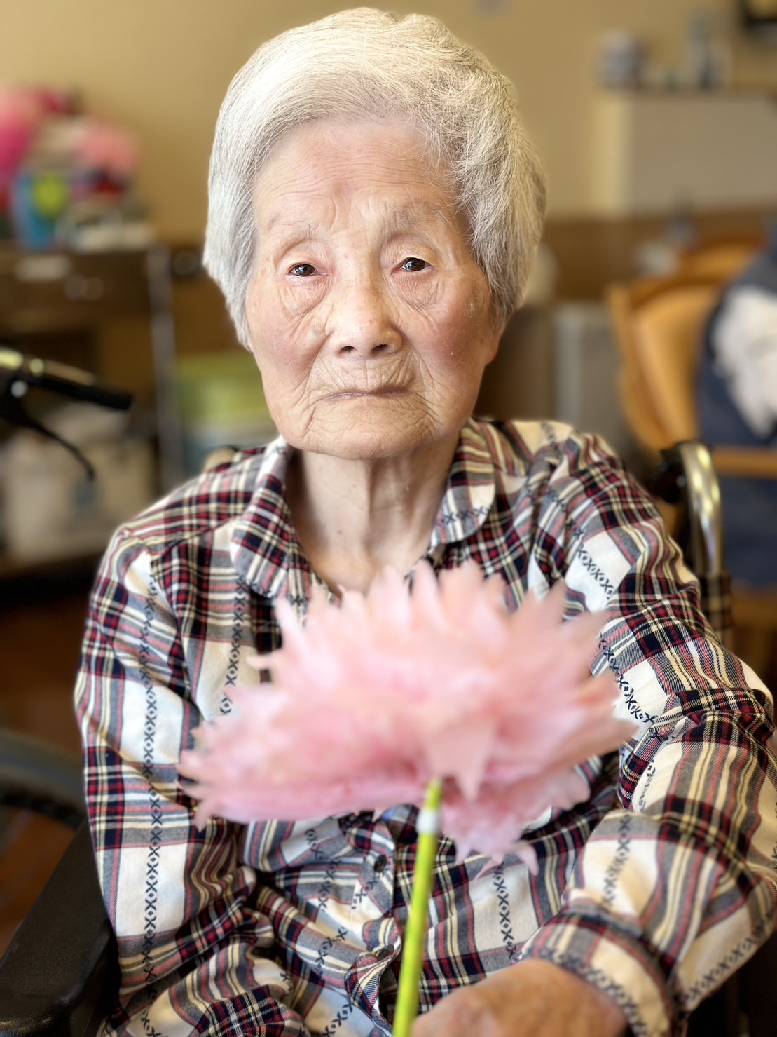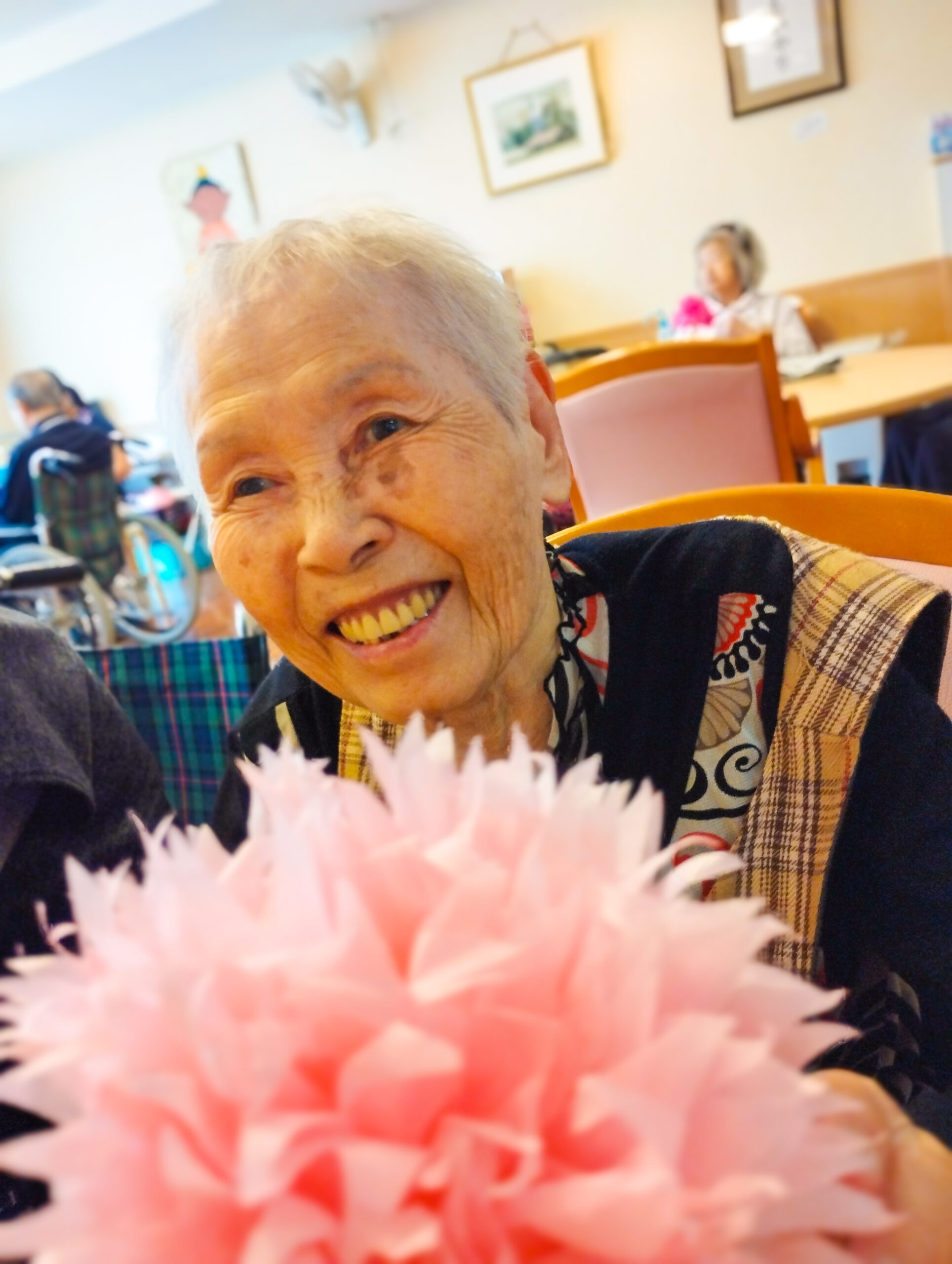 母の日のお祝いとして、介護職員たちが手作りの紙のカーネーションの花をプレゼントしてくれました。きれいな花を手に取り、驚きとともに幸せな気持ちに包まれました。