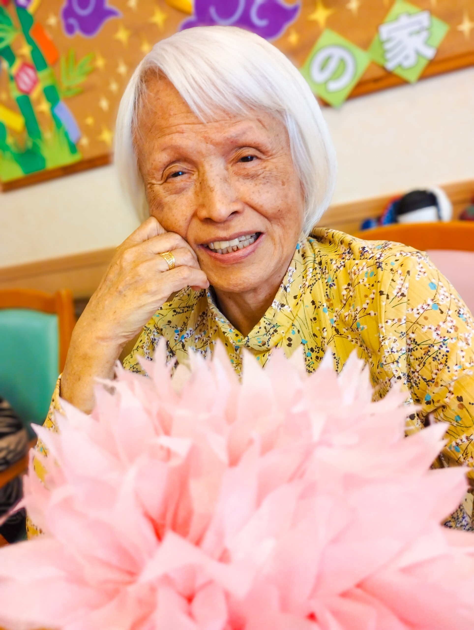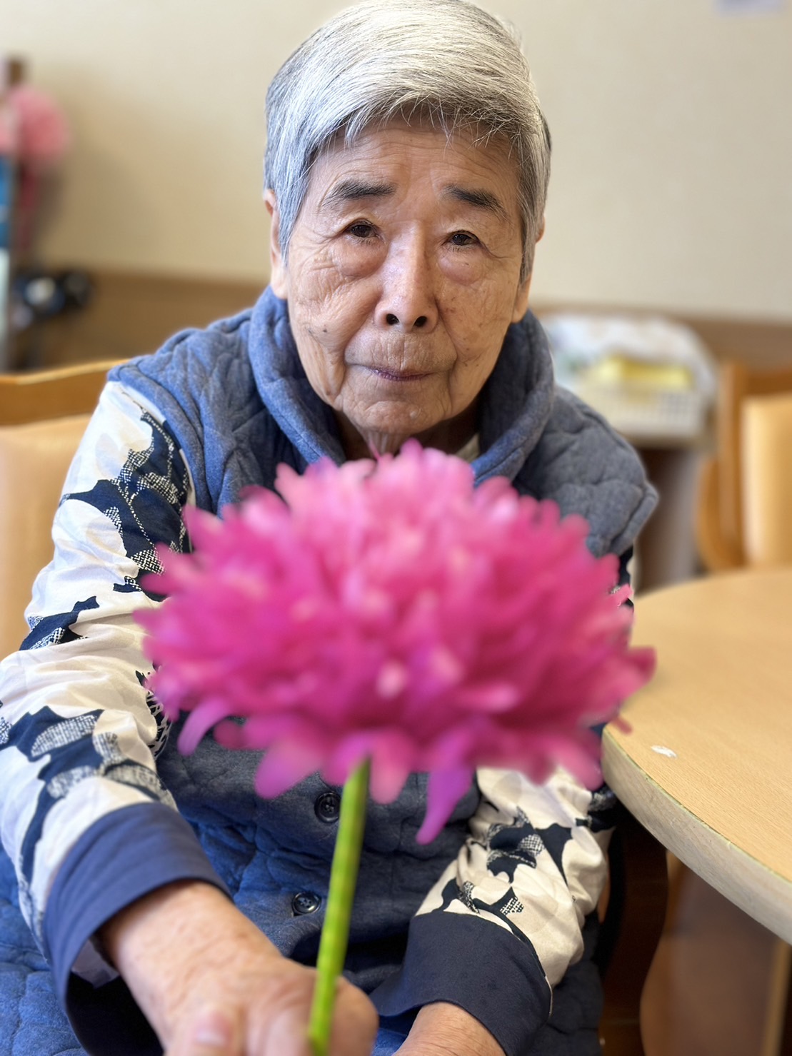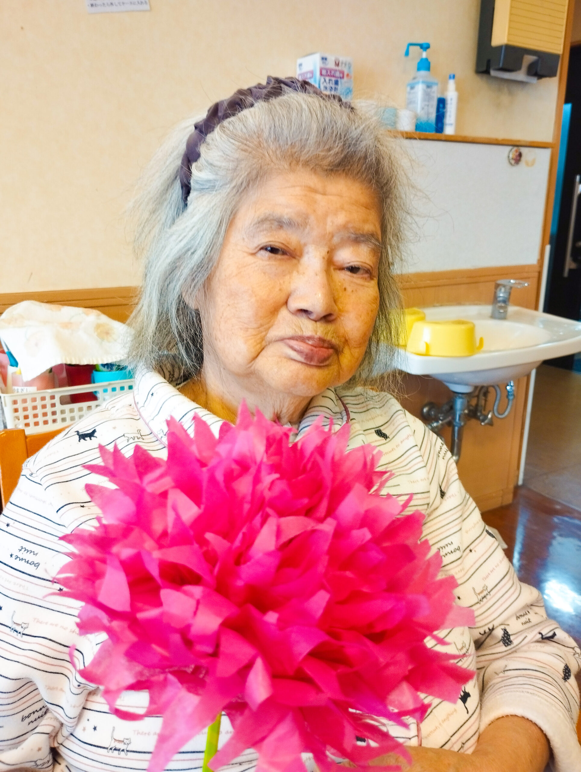 母の日のお祝いとして、介護職員たちが手作りの紙のカーネーションの花をプレゼントしてくれました。きれいな花を手に取り、驚きとともに幸せな気持ちに包まれました。