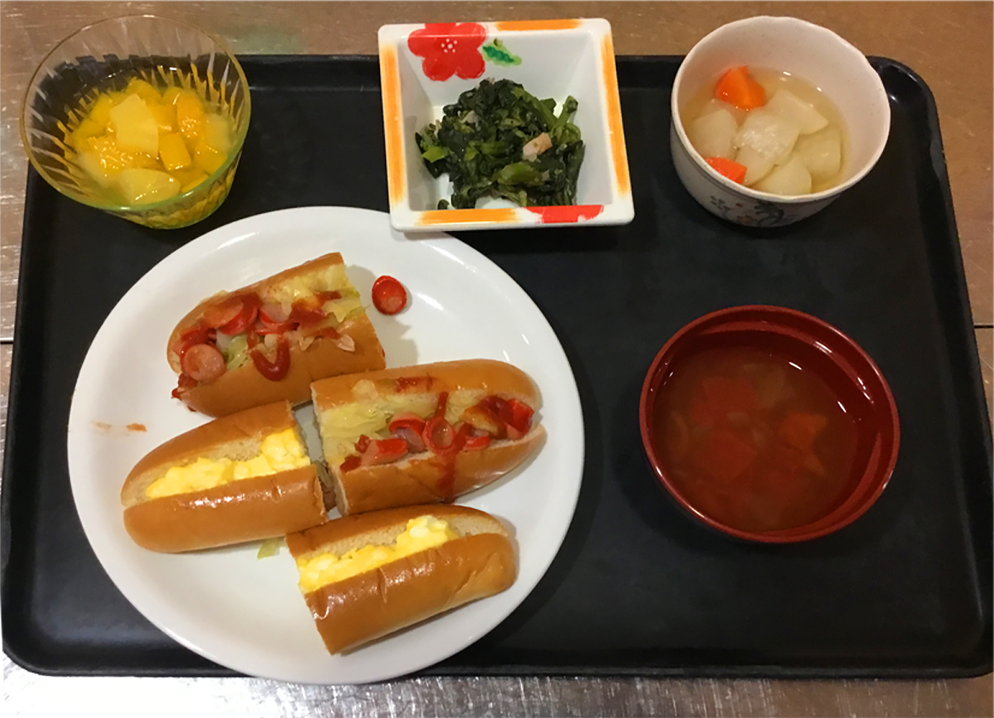 今日のメニューは、ホットドッグと卵サラダのサンドイッチに、寒い季節にぴったりの温かいトマトスープを合わせました。