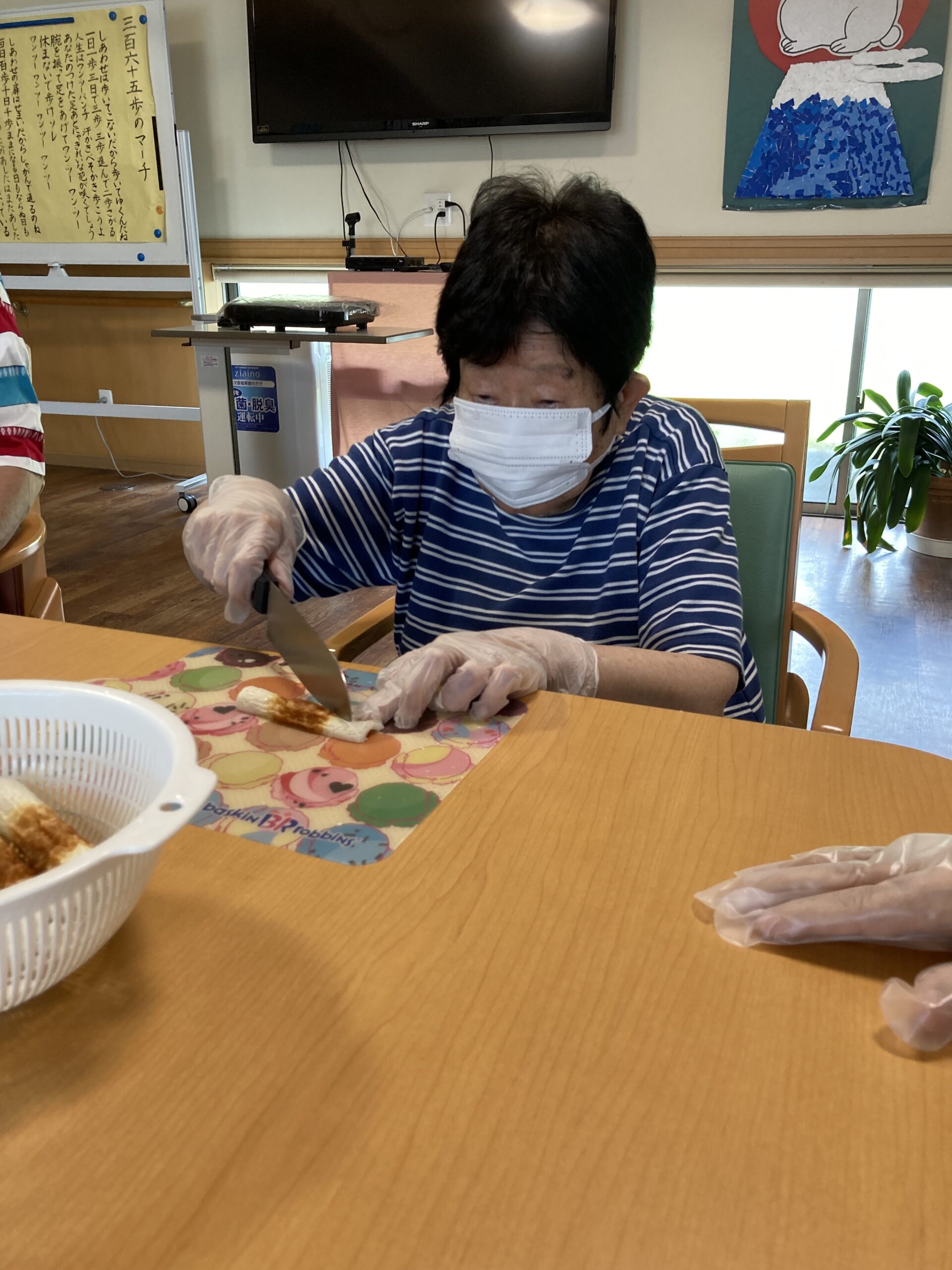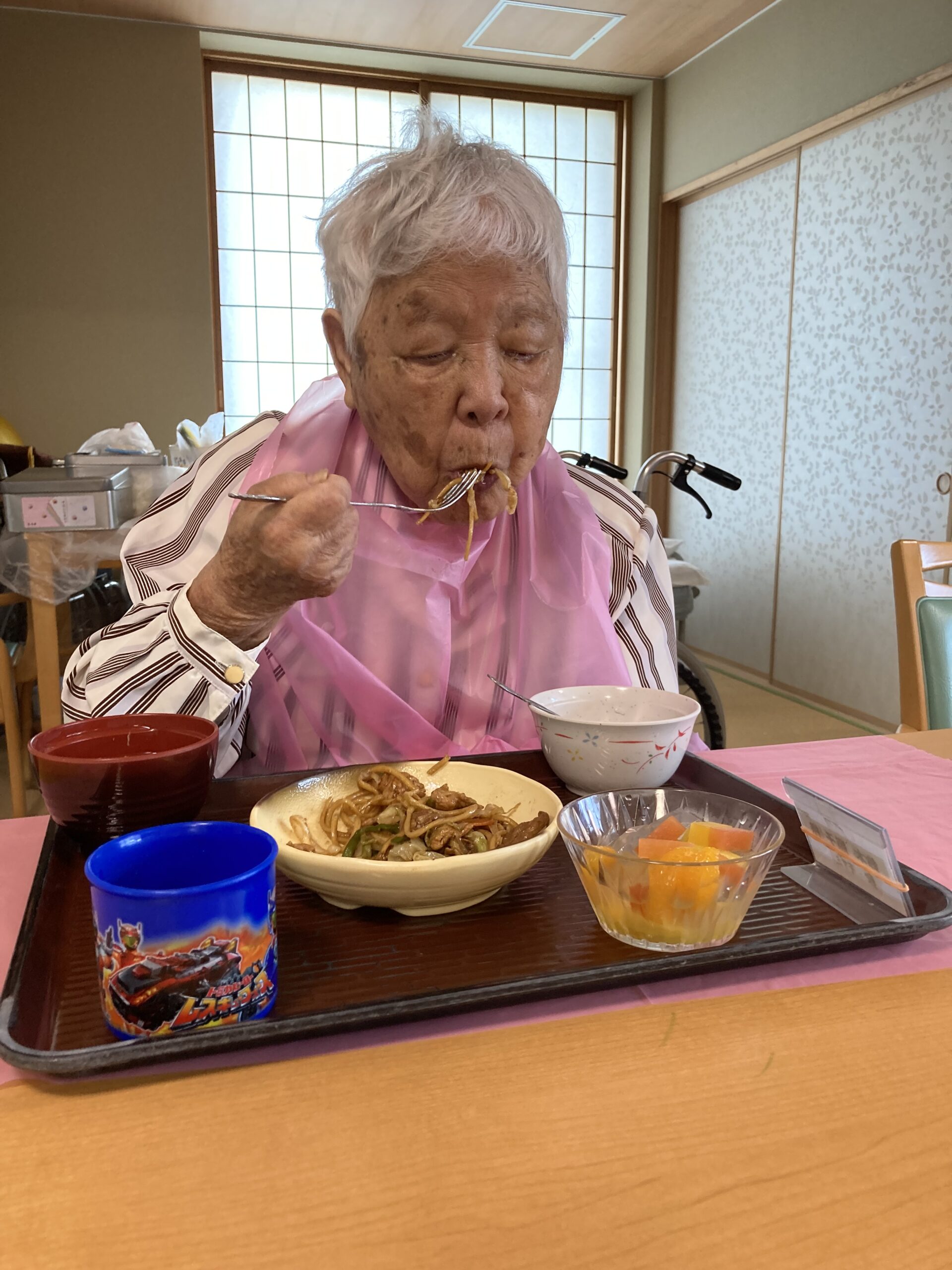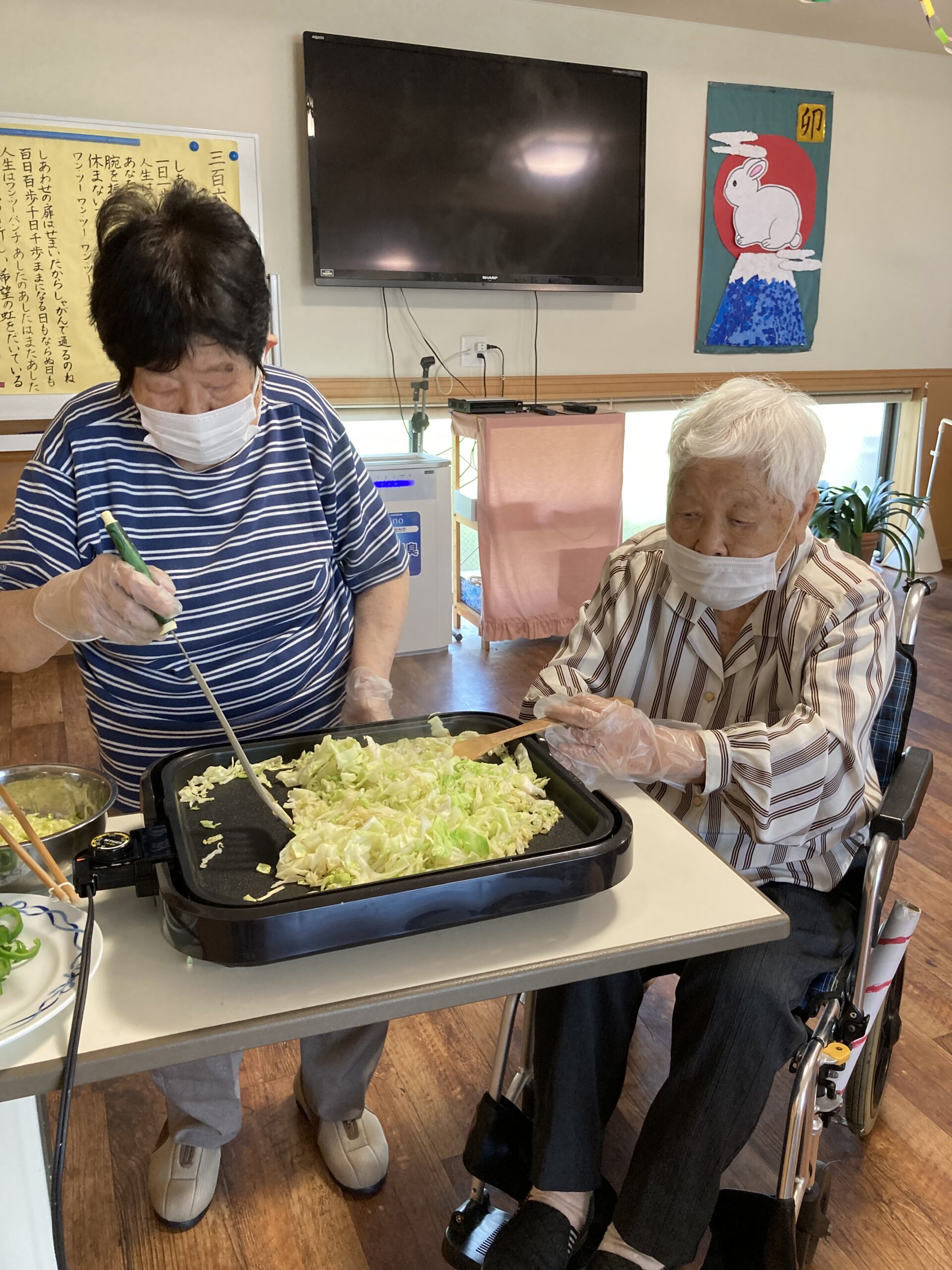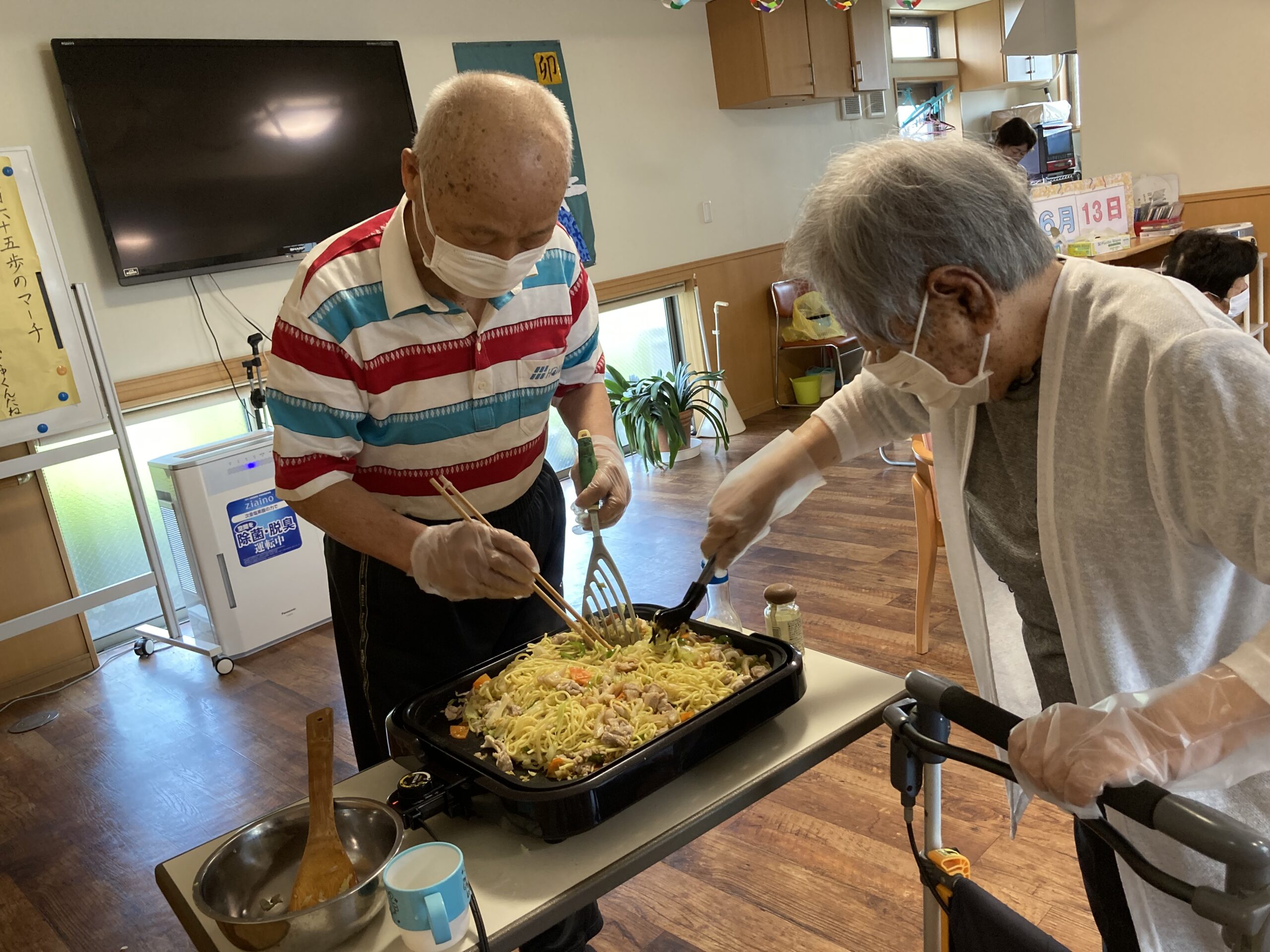 ランチレクリエーションで『焼きそば』を作りました。皆さんでキャベツ、竹輪、ニンジン、デザートの桃を包丁で切り、順番に材料と焼きそばを焼きました。男性の方も積極的に参加され、上手にキャベツを切りました。出来上がりを見て「美味しそう!」「早く食べたい」との声が聞かれました。昼食時に召し上がり「みんなで作ったから美味しい!」「味付けも丁度いいわ」と話され、皆さん完食されました。