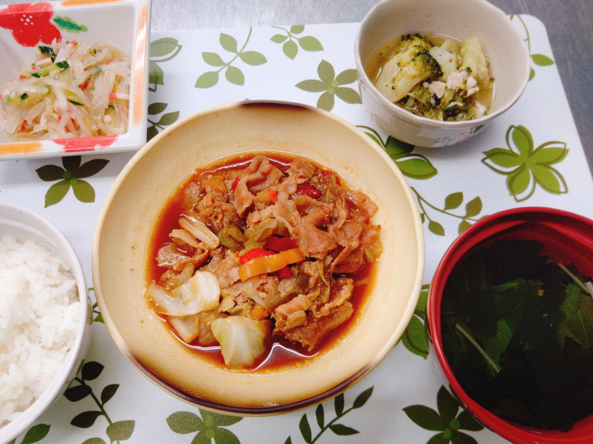 回鍋肉、ブロッコリ-コンソメ煮、春雨中華和え、ごはん、すまし汁